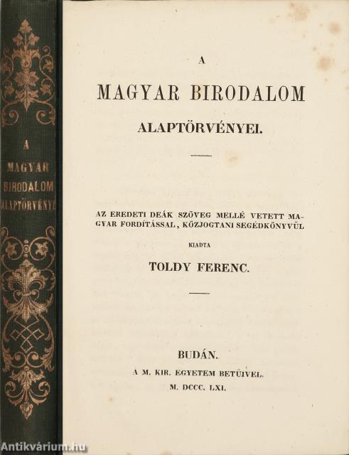 Első kiadás. Sylloge Legum Hungariae Fundamentalium / A Magyar Birodalom Alaptörvényei. Adiecto textui latino versione hungarica, usui iuris publici hung. studiosorum / Az eredeti deák szöveg mellé vetett magyar fordítással, közjogtani segédkönyvül. Kiadta: Toldy Ferenc.