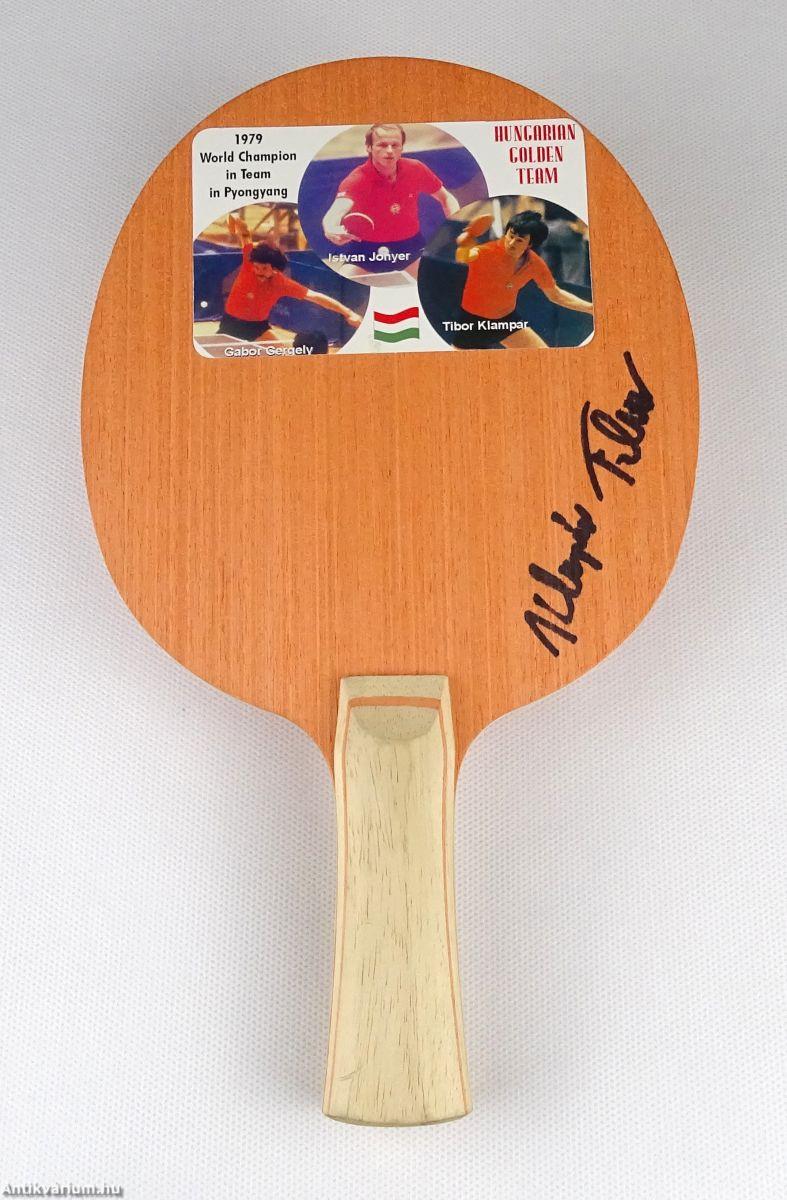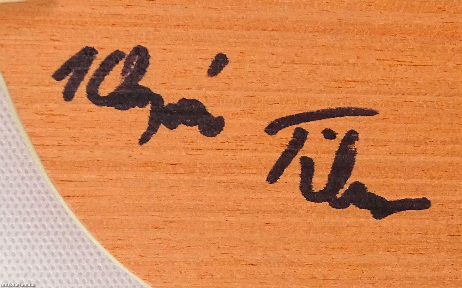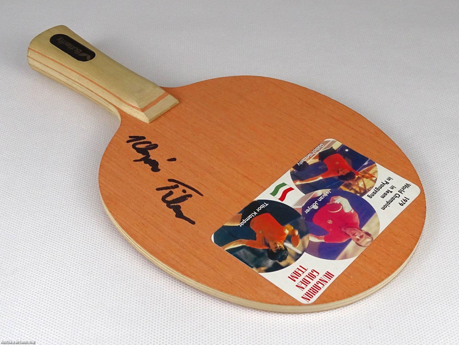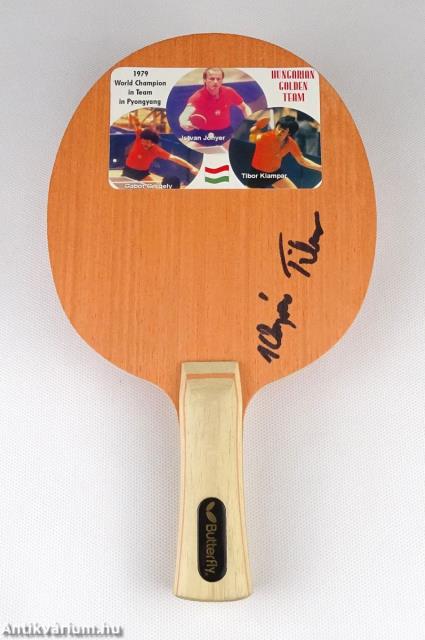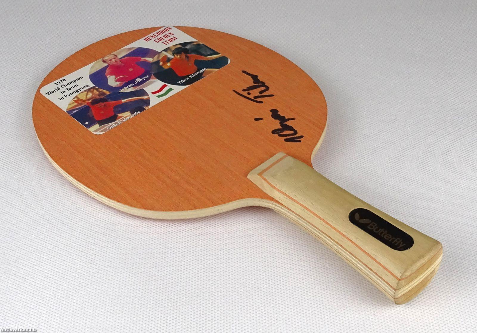 Klampár Tibor asztaliteniszező által aláírt ütőfa.