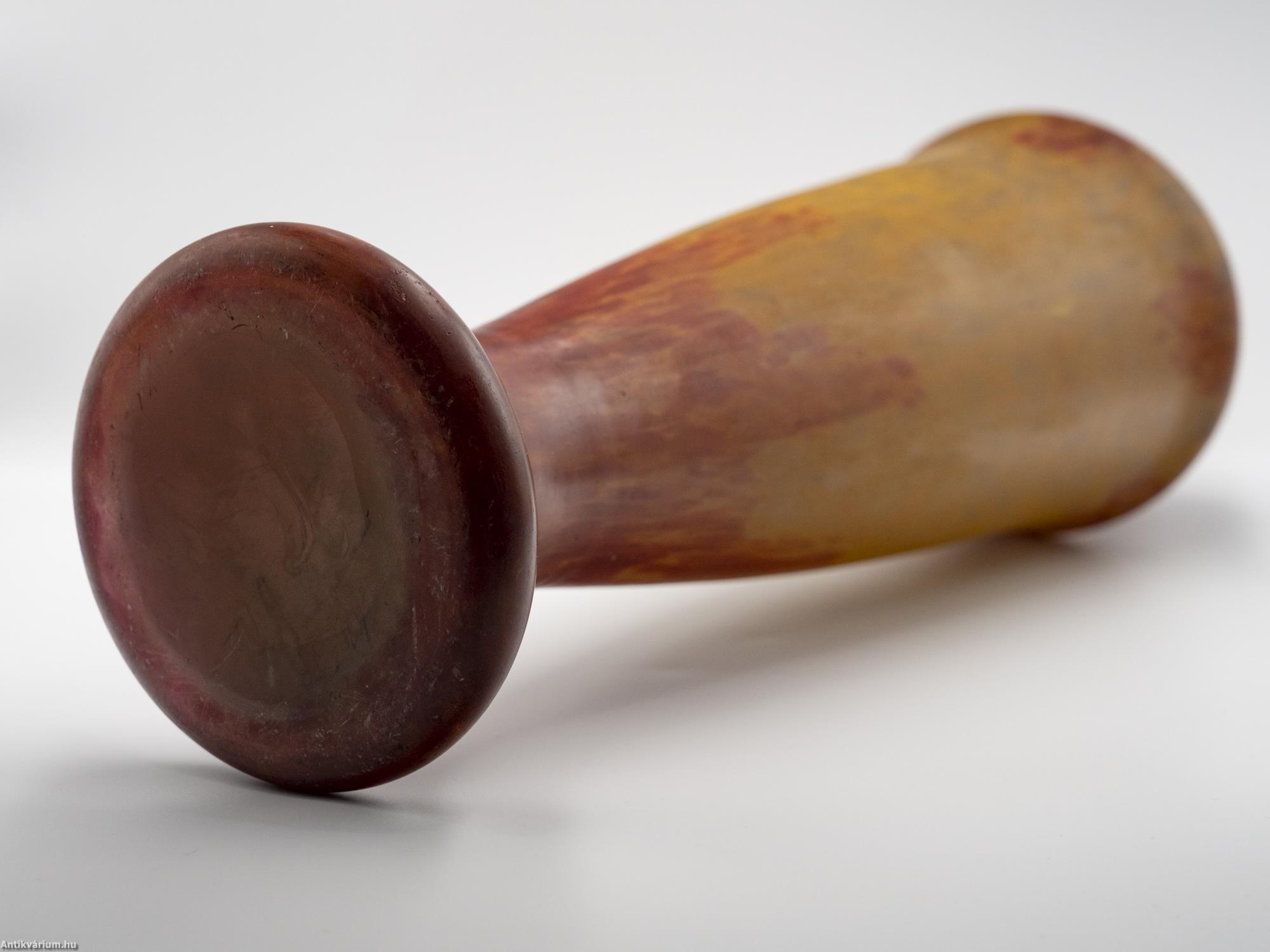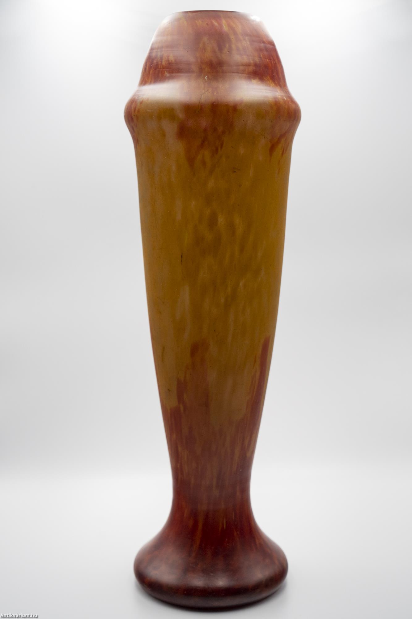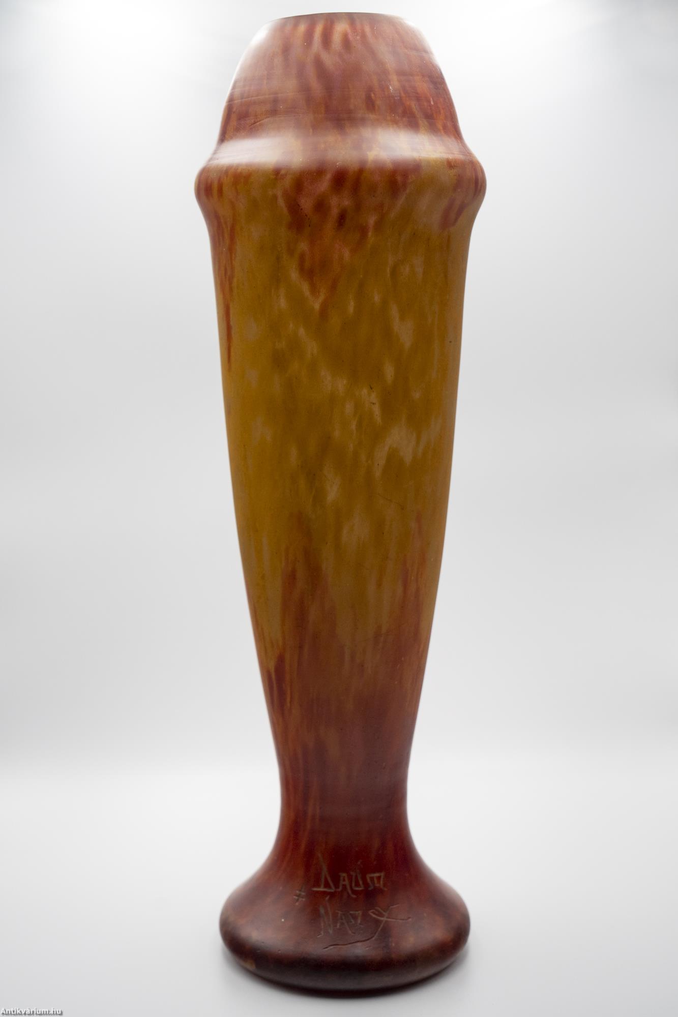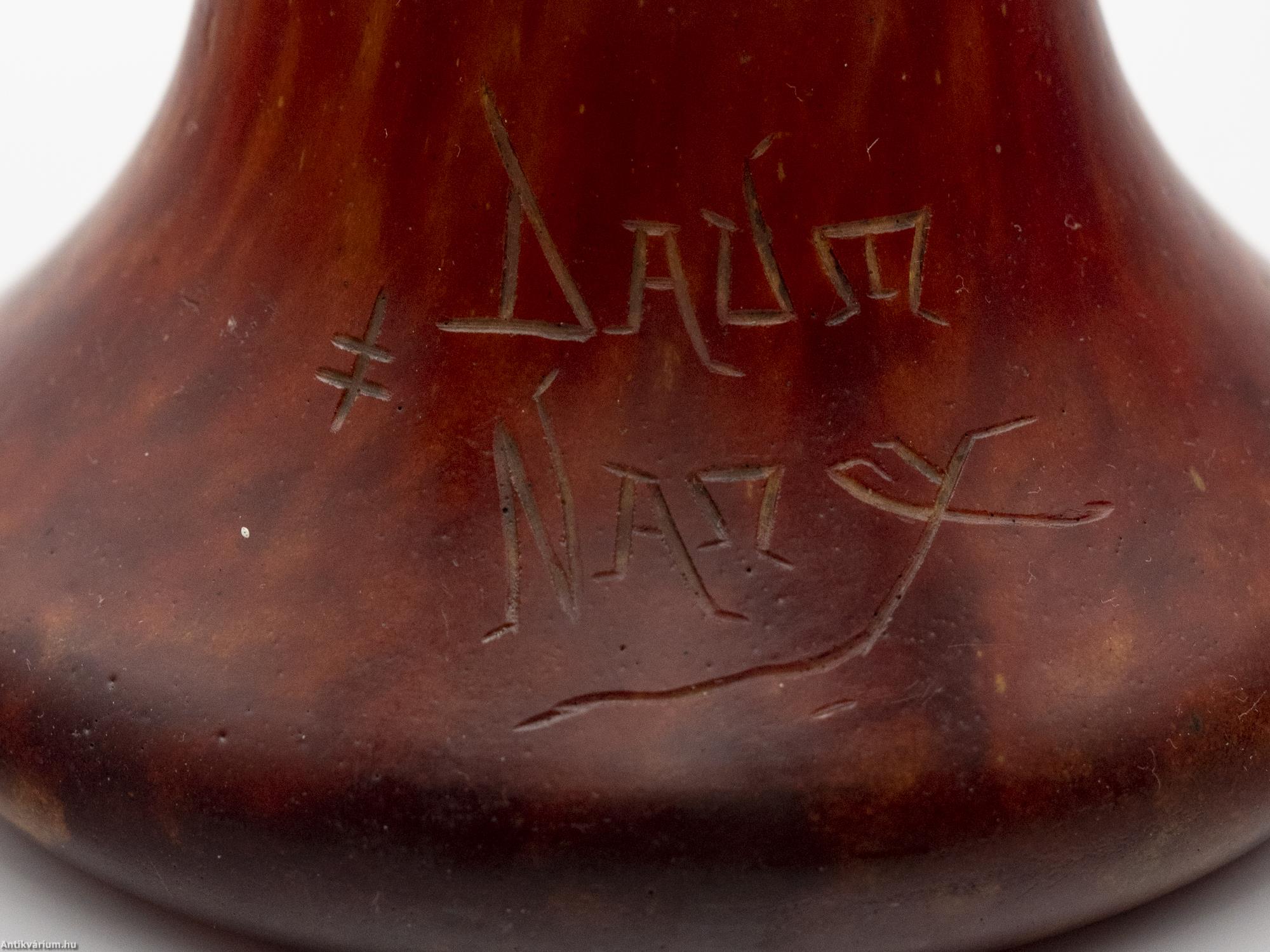 Hibátlan állapotú, jelzett Daum Nancy szecessziós üveg váza bordó-sárga színben a 20. század elejéről. Nagy méretű porüveg technikával készített impozáns díszváza, amely technika egyike volt a Daum fivérek által számos újonnan kifejlesztett és szabadalmaztatott eljárásainak. Ezzel olyan üvegalkotásokat hoztak létre, amelyeket még forró állapotukban színes porüvegben hengereltek, ami foltos külső vagy közbenső réteget alakított ki a felületen. A szecessziós stílusú Daum Nancy üveg alkotások a művészeti korszak kiemelkedő képviselői voltak, amelyen a virágok, a finom színek, a szabadon folyó vonalak és kontúrok egyszerre akár több üvegtechnikai eljárást ötvöző (cameo faragás, zománcozás, savas maratás) dísztárgyakon jelentek meg. Jelzett, minden művészi Daum üveg vázára jellemző " Daum Nancy " aláírással és Lotaringia keresztjével. Talpán a fújás helye kicsiszolva és mattítva. Igazi gyűjtői darab.