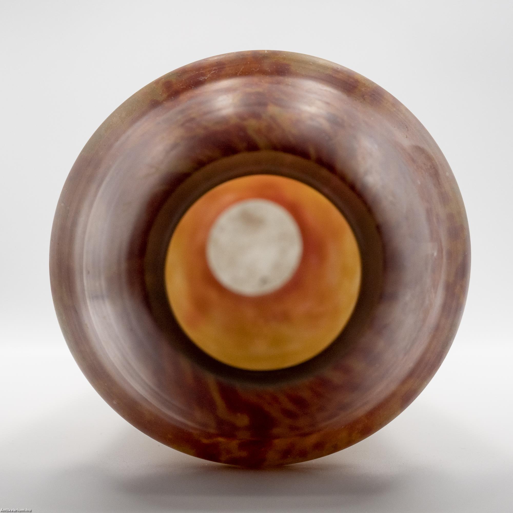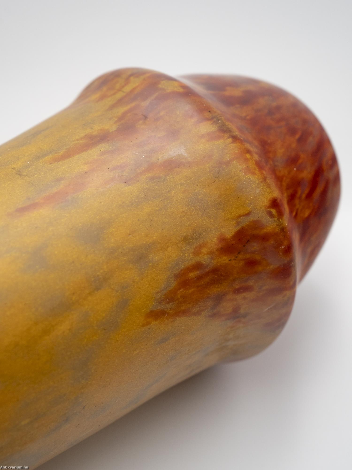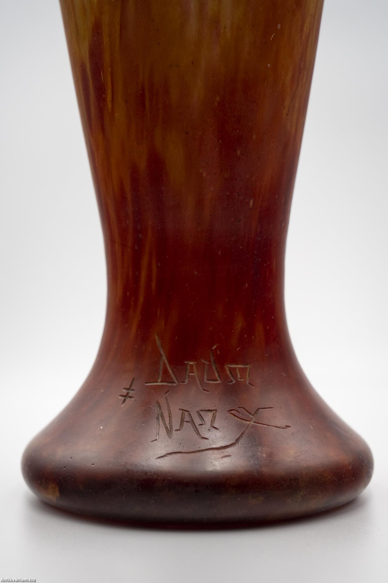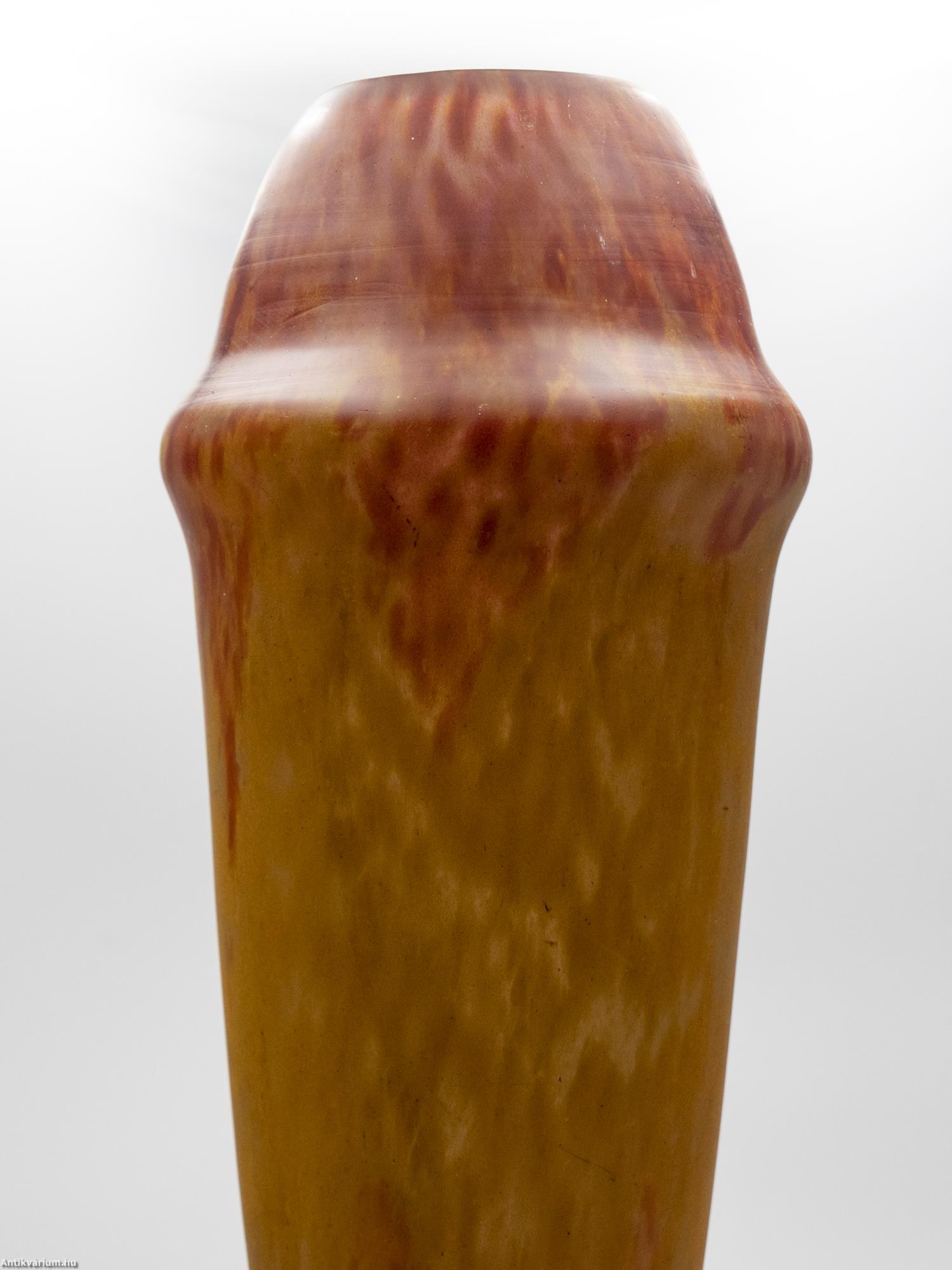 Hibátlan állapotú, jelzett Daum Nancy szecessziós üveg váza bordó-sárga színben a 20. század elejéről. Nagy méretű porüveg technikával készített impozáns díszváza, amely technika egyike volt a Daum fivérek által számos újonnan kifejlesztett és szabadalmaztatott eljárásainak. Ezzel olyan üvegalkotásokat hoztak létre, amelyeket még forró állapotukban színes porüvegben hengereltek, ami foltos külső vagy közbenső réteget alakított ki a felületen. A szecessziós stílusú Daum Nancy üveg alkotások a művészeti korszak kiemelkedő képviselői voltak, amelyen a virágok, a finom színek, a szabadon folyó vonalak és kontúrok egyszerre akár több üvegtechnikai eljárást ötvöző (cameo faragás, zománcozás, savas maratás) dísztárgyakon jelentek meg. Jelzett, minden művészi Daum üveg vázára jellemző " Daum Nancy " aláírással és Lotaringia keresztjével. Talpán a fújás helye kicsiszolva és mattítva. Igazi gyűjtői darab.