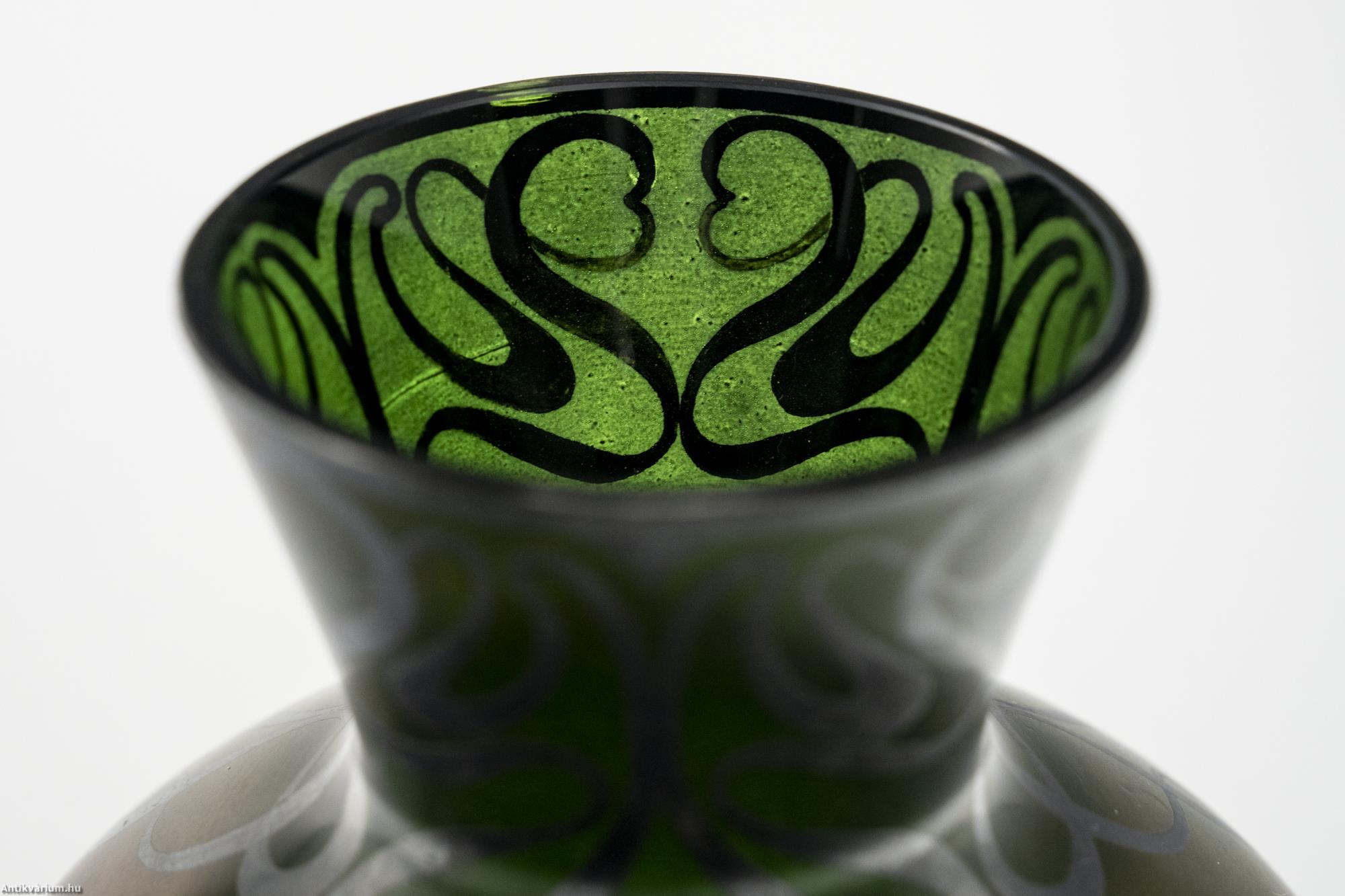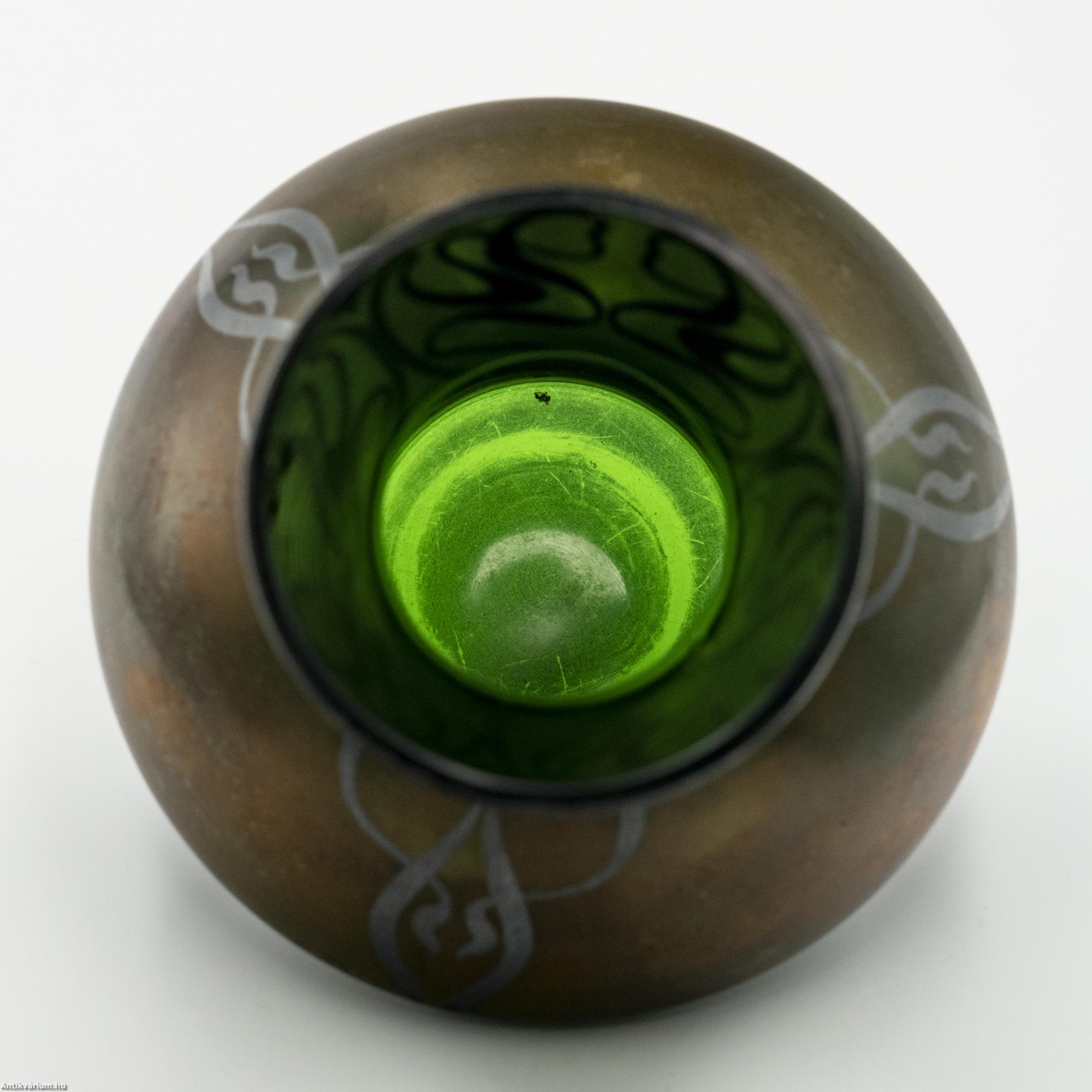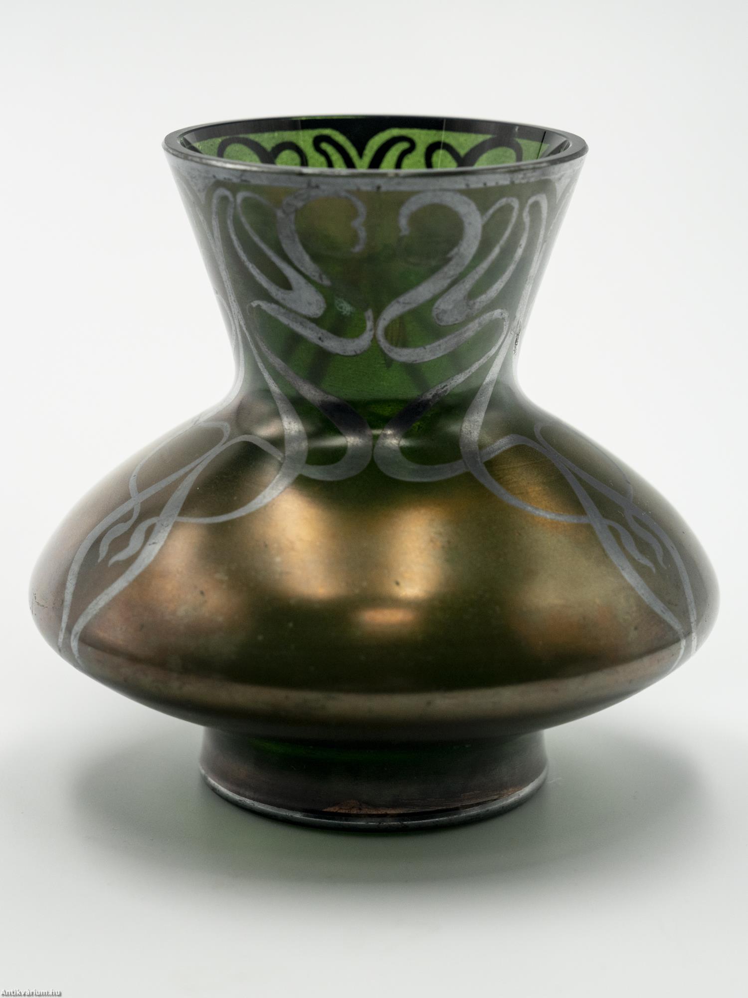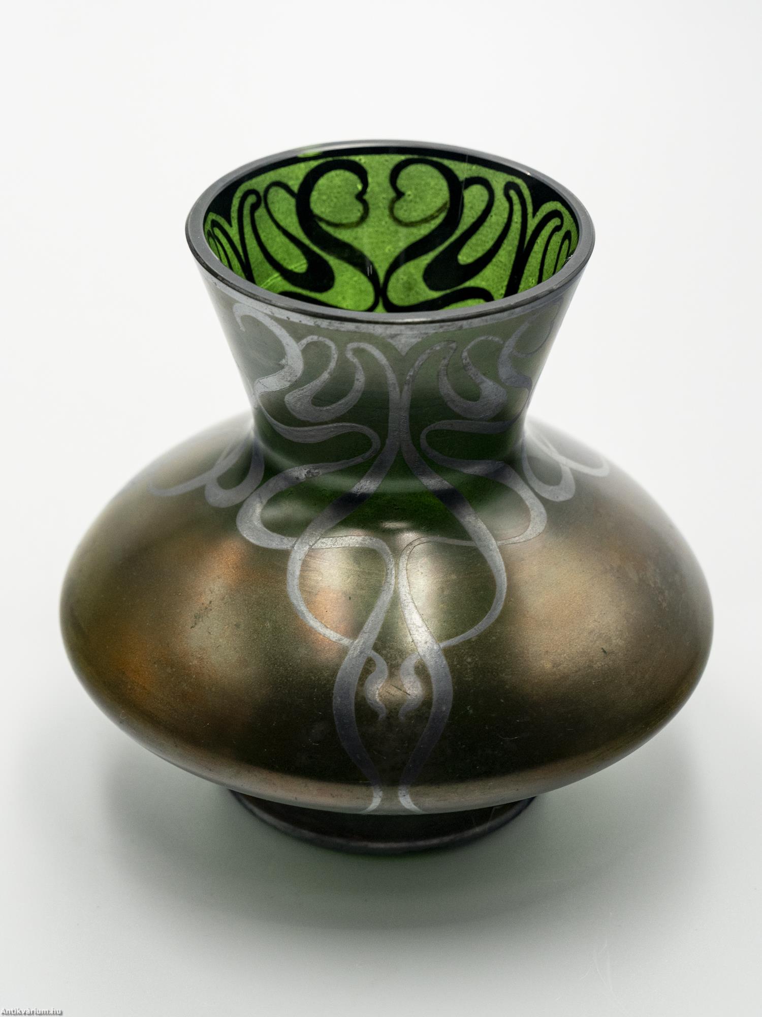Hibátlan állapotú, szecessziós irizált Carl Goldberg - Haida művészi üveg váza a 20. század elejéről. A váza zöld színű üvegből készült, amelynek teljes felületén a nehézfém-oxidos variáció többszínű, irizáló árnyalatokat hoz létre zöld, barna és óarany színben. Kontrasztos formájú, kézzel fújt és formázott váza lapított gömb formájú testtel és elvékonyodó nyakrésszel. Felső részén teljes fedésben csavart mintázatú, fémszerűen festett szecessziós formavilágú hullám minták teszik izgalmassá a felületet, amelyek három részre tagolódva kibomló szálakként futnak le a talprészig.