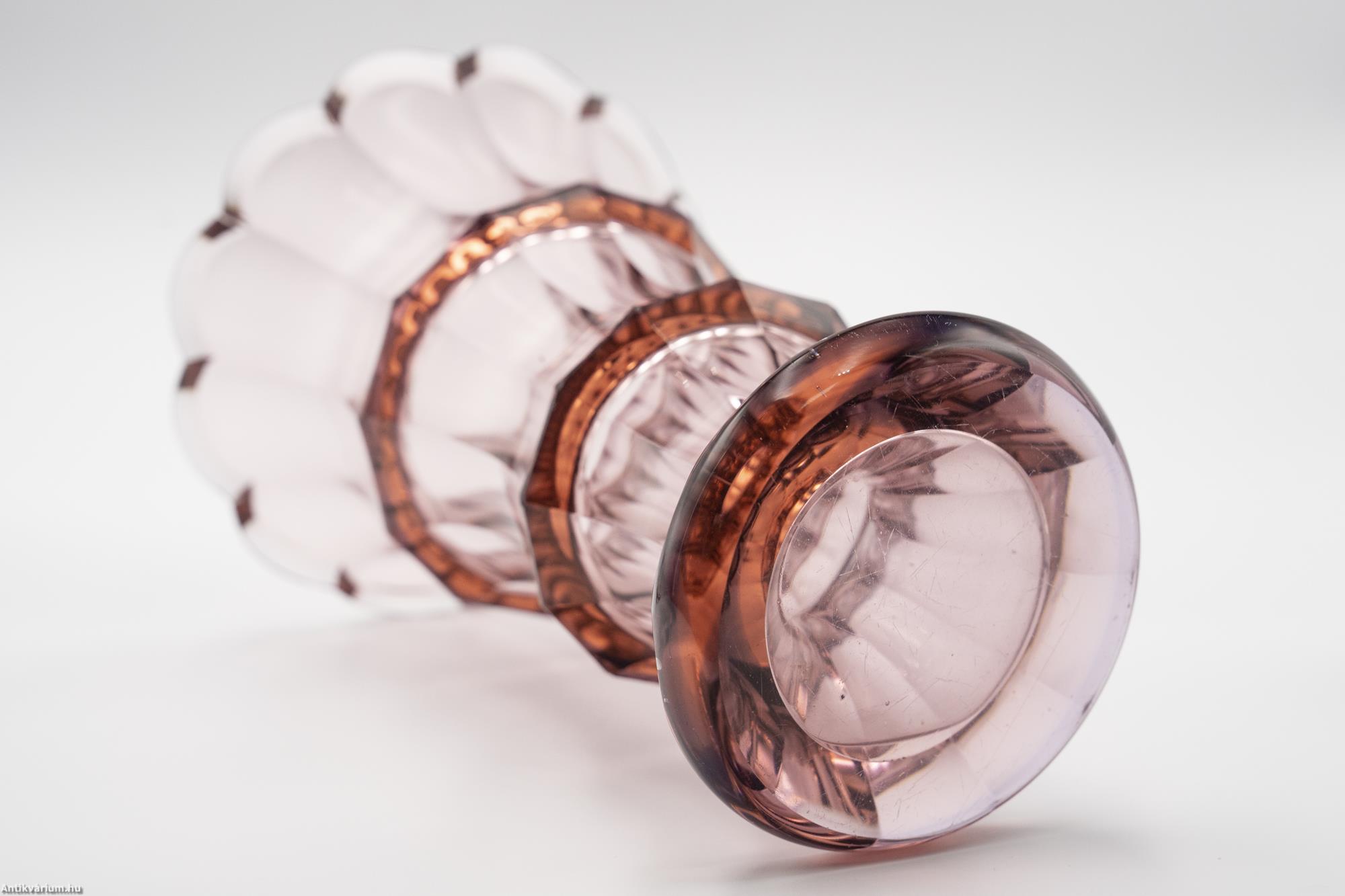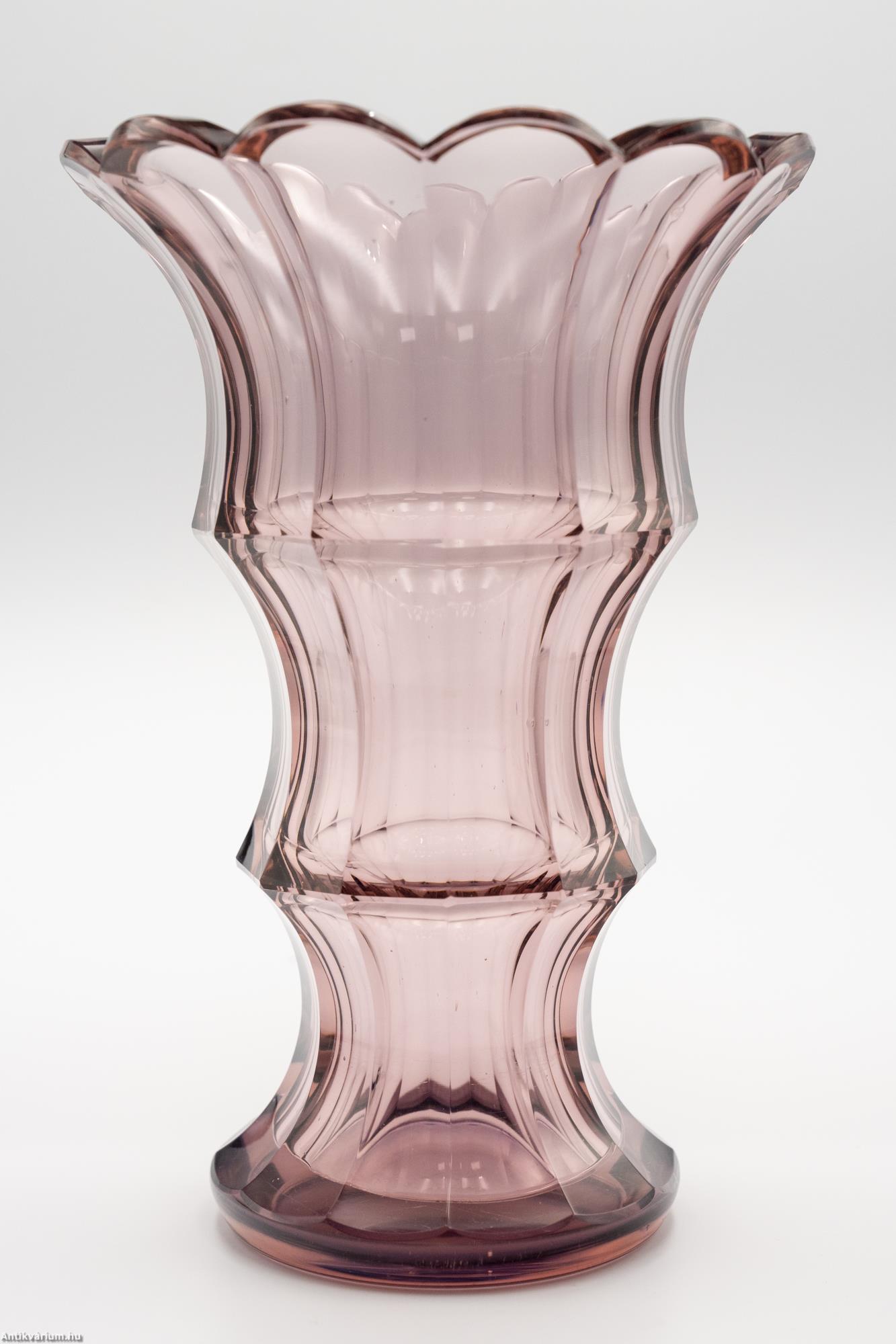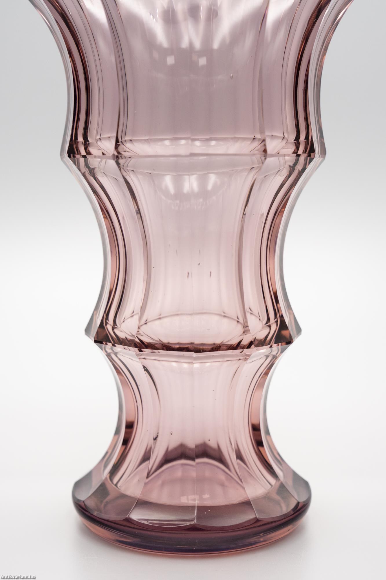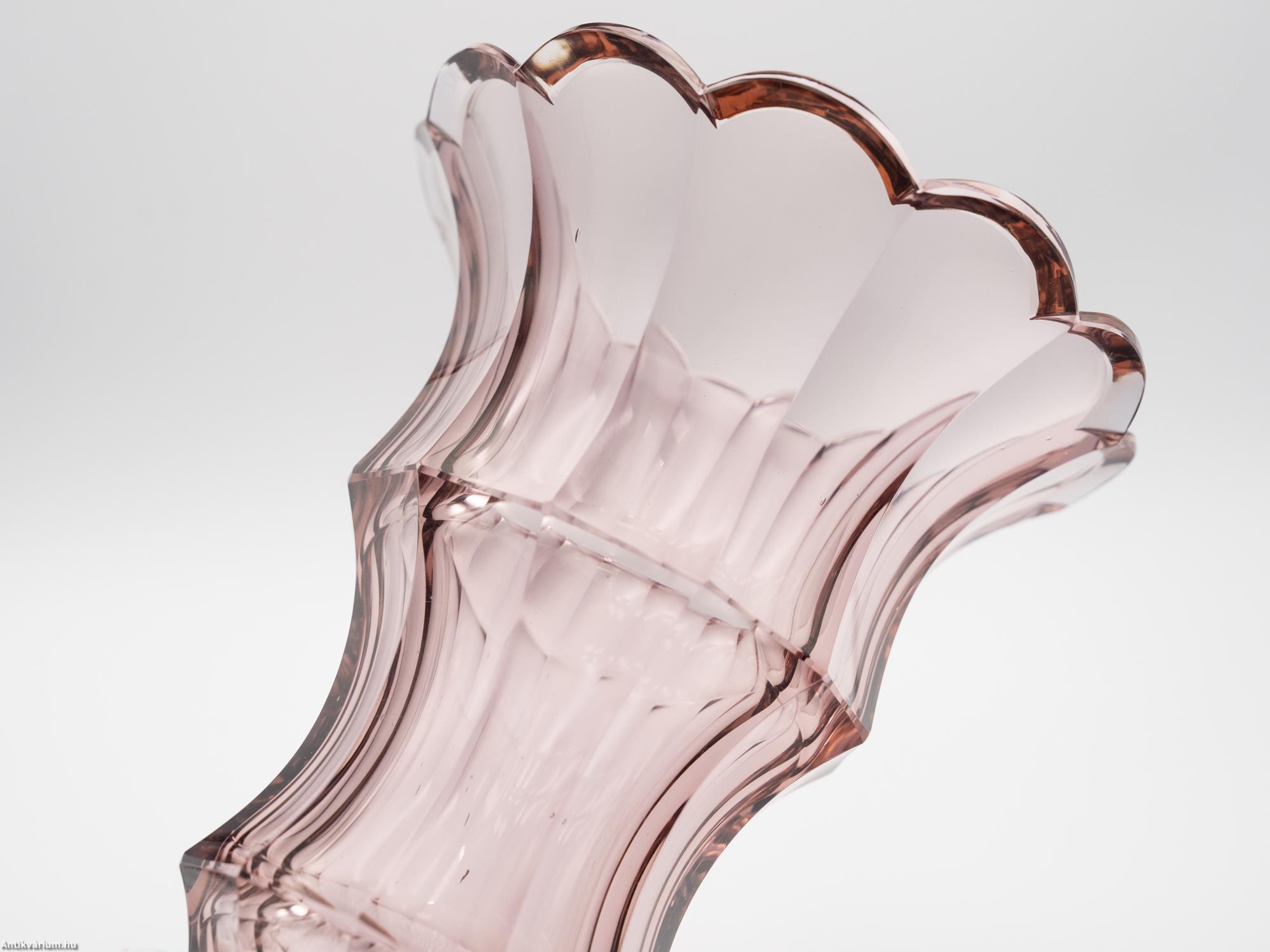 Hibátlan állapotú, fújt és kézzel formázott valamint kézzel csiszolt art deco Moser üveg váza Josef Hoffmann tervei alapján. Vastagfalú, nagy súlyú, lila színű üvegből készült művészi üveg váza. Vízszintesen tagolt, háromosztásos oldalát sík - homorú csiszolt laptagolás díszíti. Az üveg váza felfelé szélesedő formája lekerekített, hullámot formázó peremrészben végződik és amely egy "üvegből faragott" nyíló virágot jelenít meg. Talpa lapra csiszolt. A kor stílusát és a Moser csiszolás egyedi jellemzőit megjelenítő üveg váza az 1920 - as években készült Karlsbadban (Karlovy Vary). A Moser üveggyárban az 1920-as években rendkívül gyümölcsöző együttműködés kezdődött Josef Hoffmann tervezővel (Pirnitz 1870 – 1956 Bécs, a Wiener Werkstatte társalapítója), amelynek során az uralkodó art deco esztétika jegyeit magán viselő elegáns üvegáruk készültek, kihangsúlyozva az egyenes, leegyszerűsített vonalvezetést és modern formát, valamint az erős, tiszta színvilág használatát. Mindezeket tökéletes kivitelezésben.