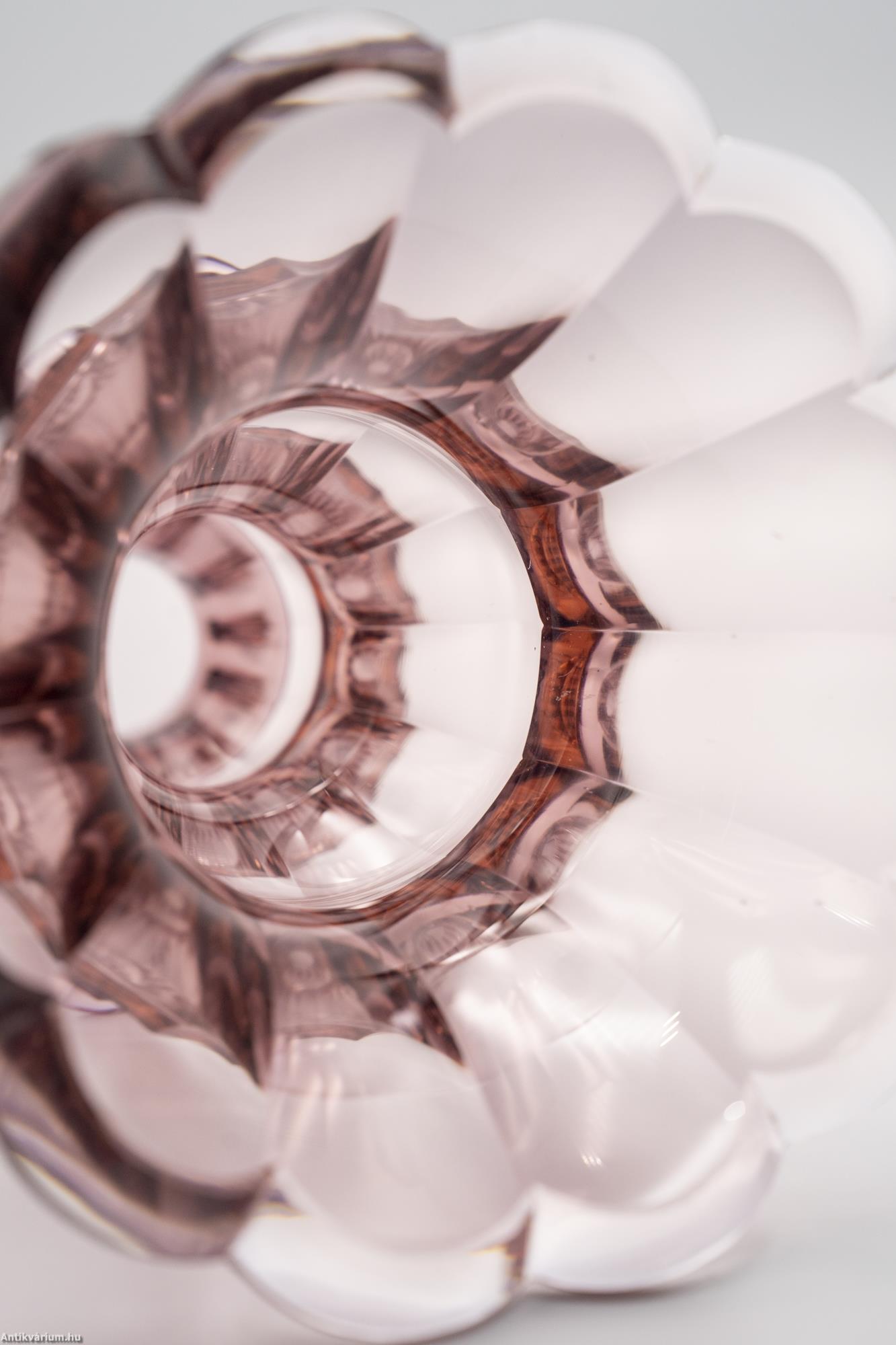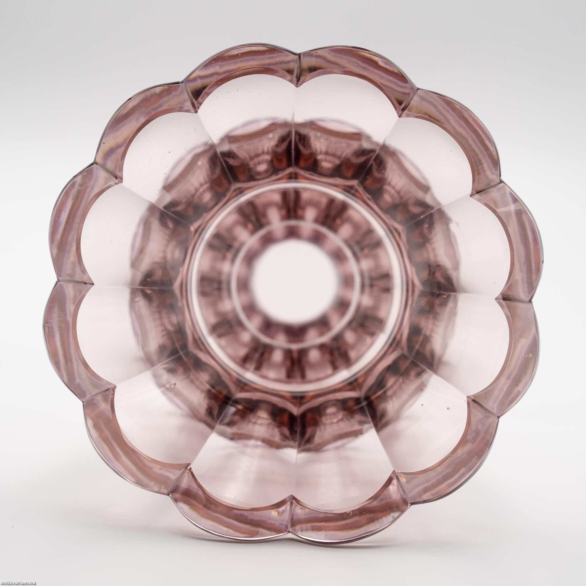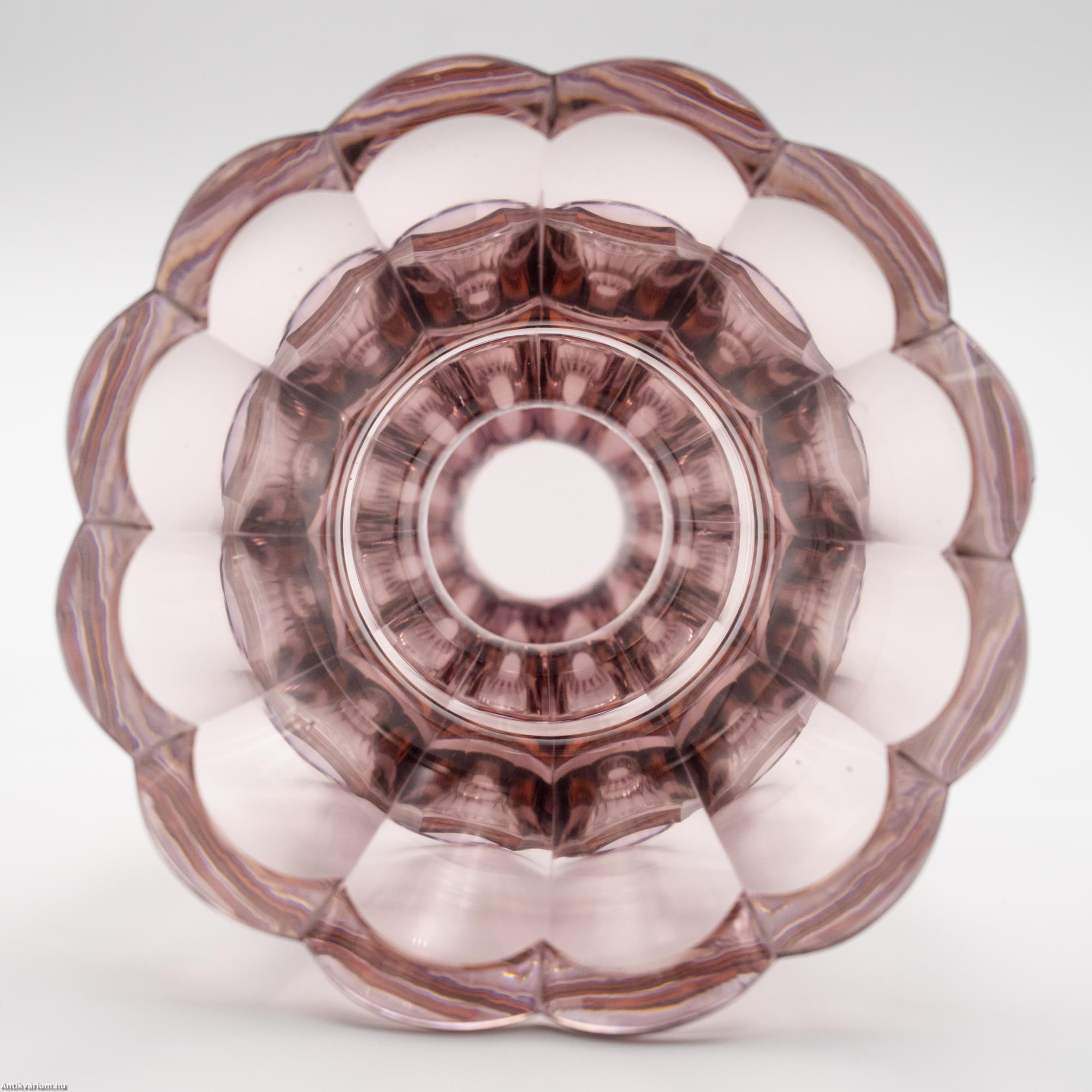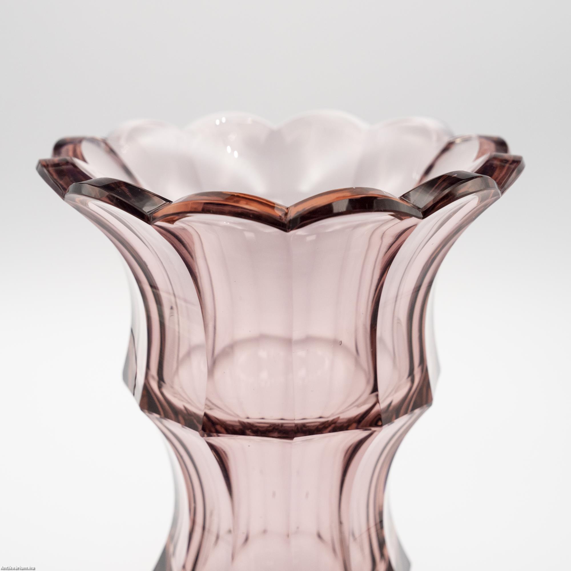 Hibátlan állapotú, fújt és kézzel formázott valamint kézzel csiszolt art deco Moser üveg váza Josef Hoffmann tervei alapján. Vastagfalú, nagy súlyú, lila színű üvegből készült művészi üveg váza. Vízszintesen tagolt, háromosztásos oldalát sík - homorú csiszolt laptagolás díszíti. Az üveg váza felfelé szélesedő formája lekerekített, hullámot formázó peremrészben végződik és amely egy "üvegből faragott" nyíló virágot jelenít meg. Talpa lapra csiszolt. A kor stílusát és a Moser csiszolás egyedi jellemzőit megjelenítő üveg váza az 1920 - as években készült Karlsbadban (Karlovy Vary). A Moser üveggyárban az 1920-as években rendkívül gyümölcsöző együttműködés kezdődött Josef Hoffmann tervezővel (Pirnitz 1870 – 1956 Bécs, a Wiener Werkstatte társalapítója), amelynek során az uralkodó art deco esztétika jegyeit magán viselő elegáns üvegáruk készültek, kihangsúlyozva az egyenes, leegyszerűsített vonalvezetést és modern formát, valamint az erős, tiszta színvilág használatát. Mindezeket tökéletes kivitelezésben.