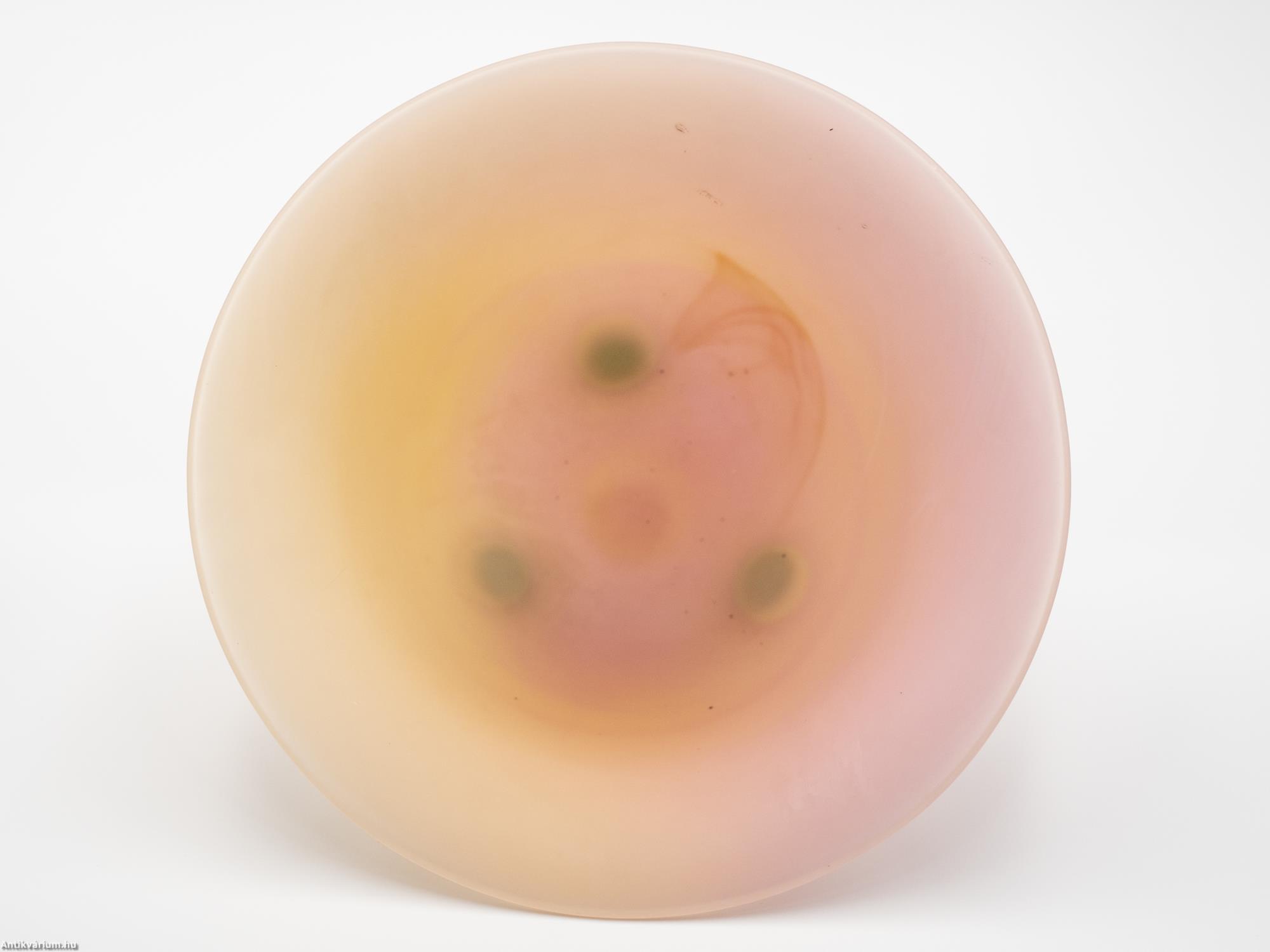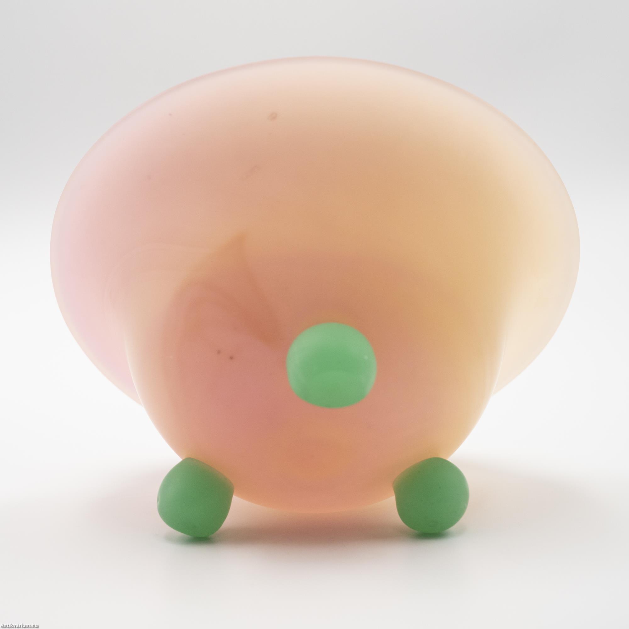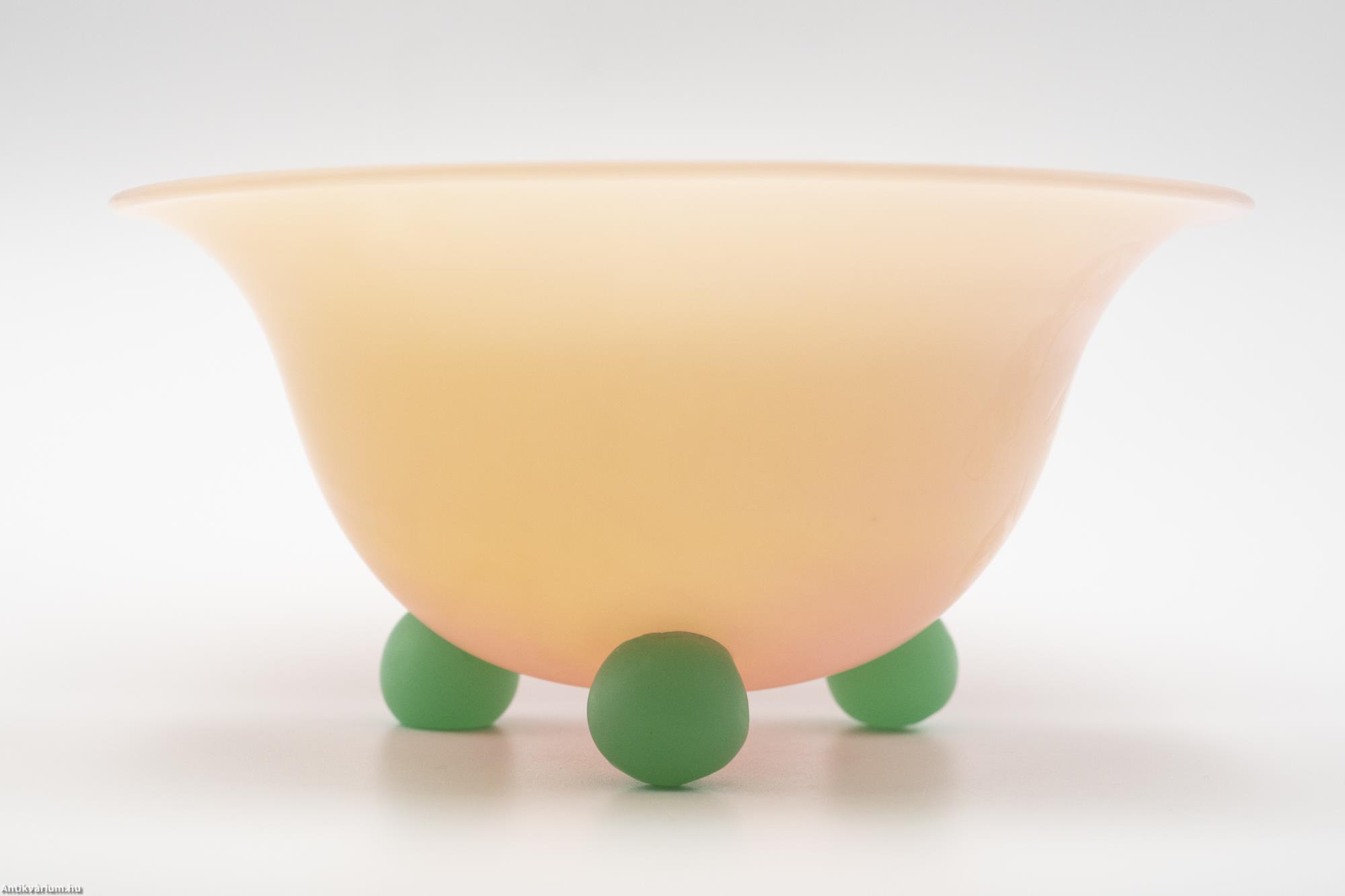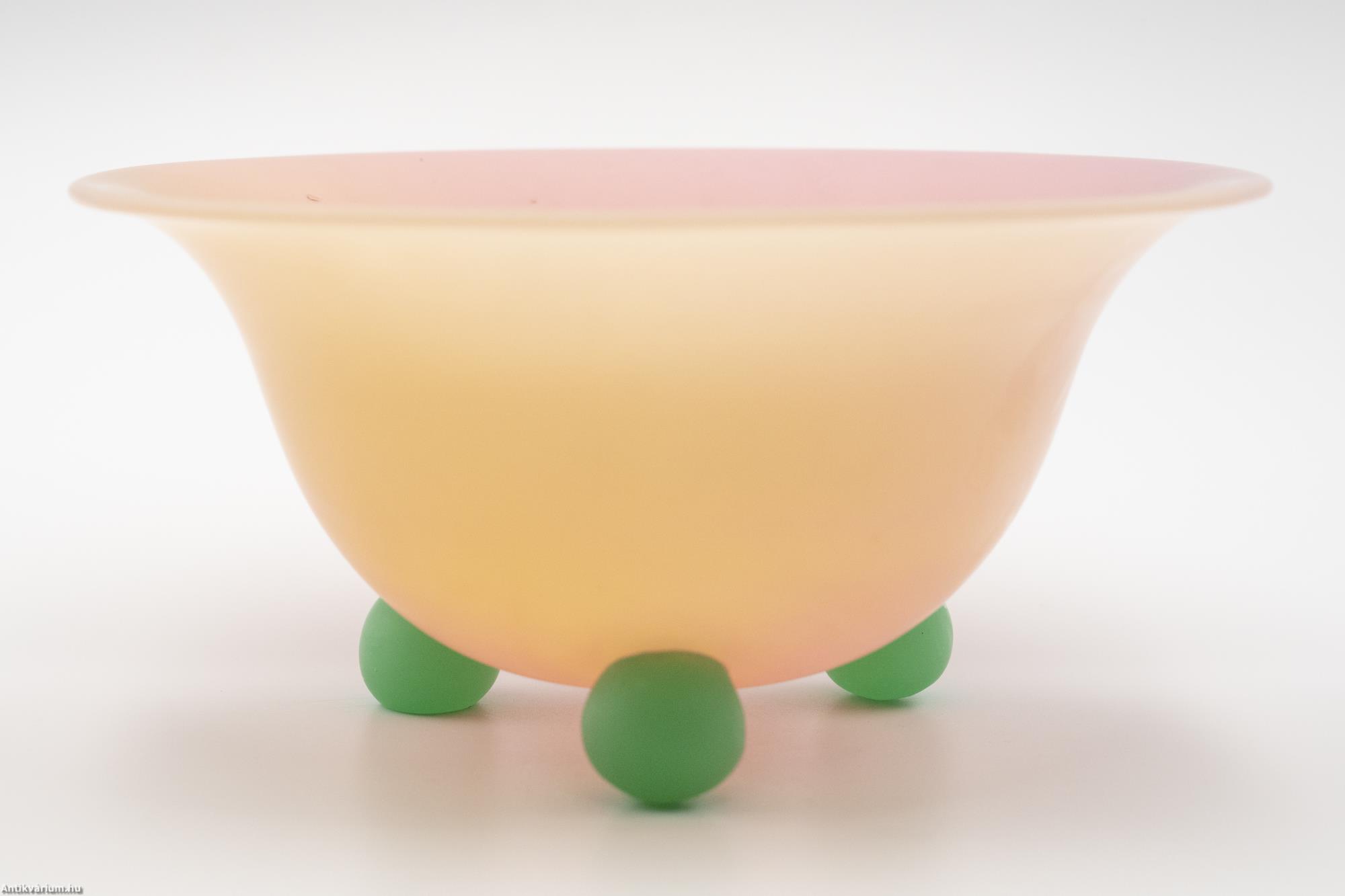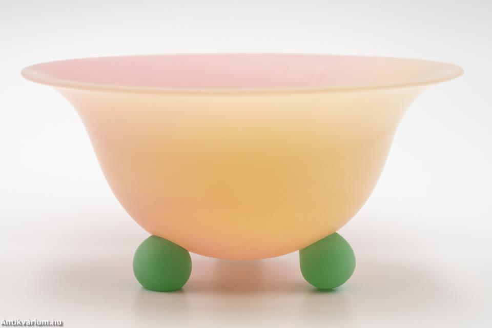 Hibátlan állapotú, fújt és kézzel formázott matt art deco üveg kaspó, amelyet Michael Powolny tervezett a Loetz üveggyár számára az 1920- as években. Rózsaszín üveg felületén különleges pink színű aszimmetrikusan megjelenő márványos mintázat látható. A felső kehelyrésztől merőben elütő forma és színvilágot mutat a három zöld színű gömbtalp, amely szokatlan és újító design volt alkotása idejében. Az üvegváza különleges megjelenését a pasztell és a az élénk szín erős kontrasztja és az ezt kihangsúlyozó egyedi forma párosítása adja. Michael Powolny (1871-1954) üvegtervező és szobrász a Bécsi Iparművészeti iskola tanára volt, de elsősorban kerámia tervezéssel foglalkozott. (1906-ban általa alapított Wiener Keramik) Őt tekintik modern osztrák iparművészet 20. század eleji megújítójának. Sikeres együttműködést alakított ki a Wiener Werkstadttal és a Loetz üveggyárral, számos tervei valósultak meg ezek égisze alatt.