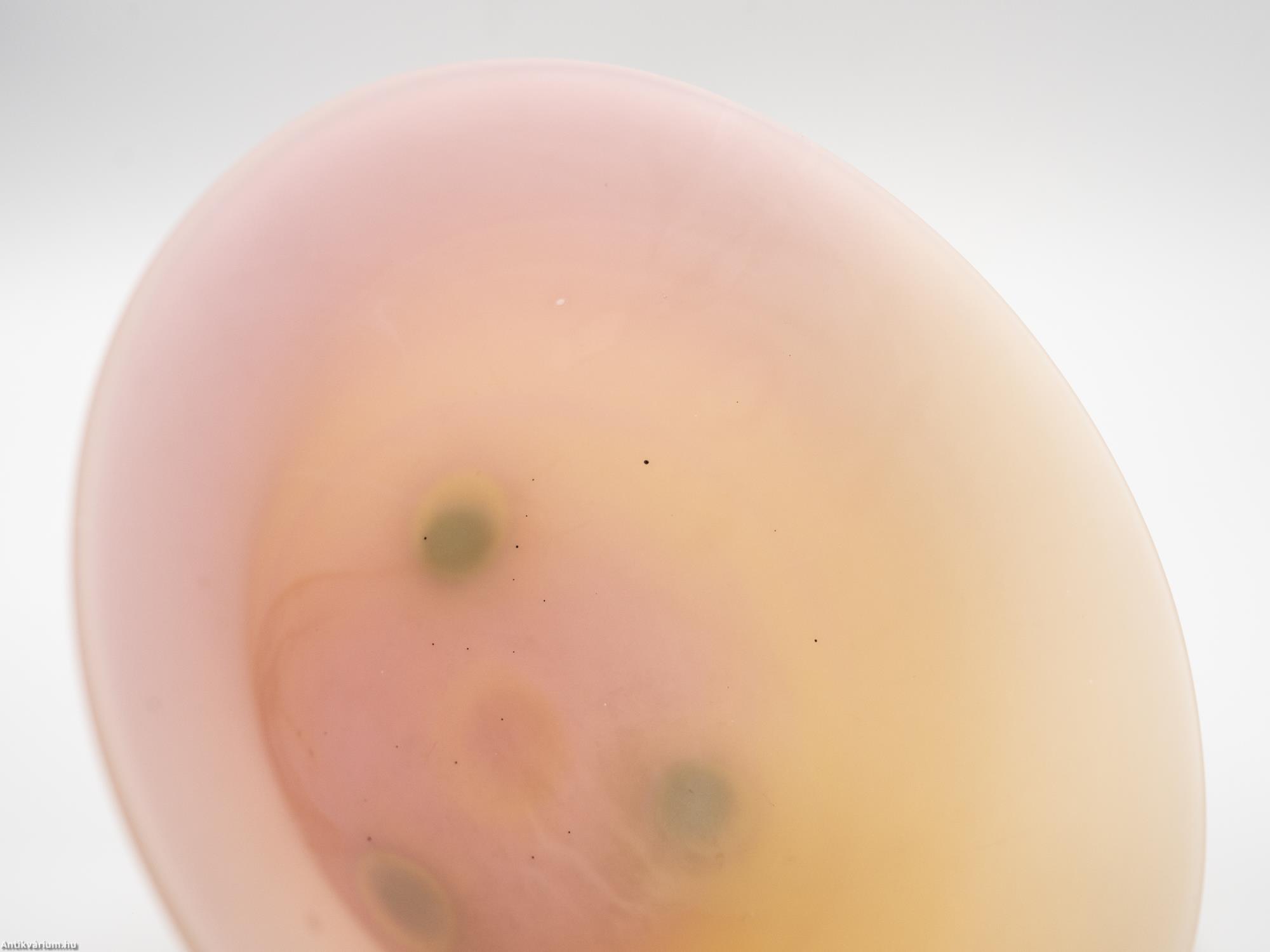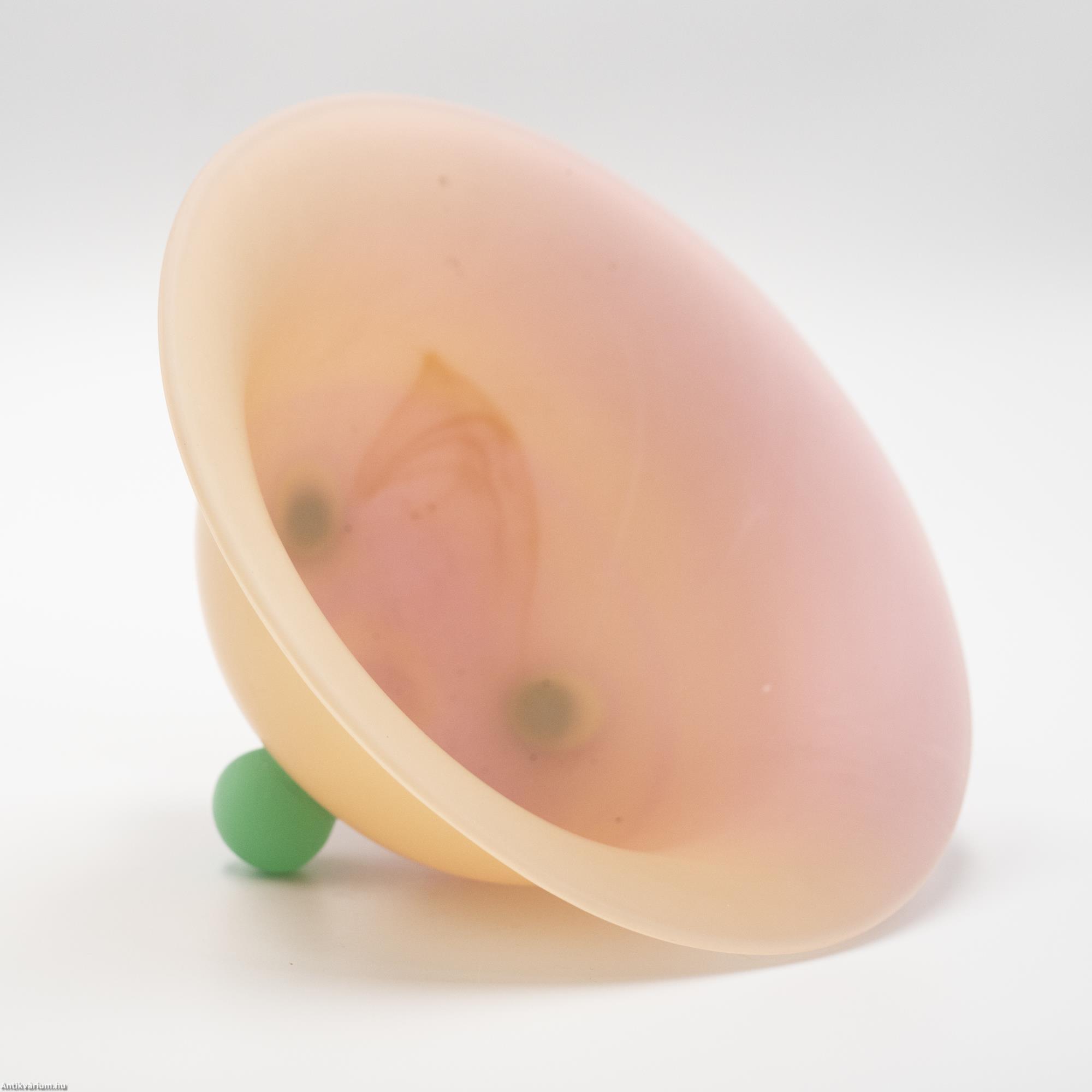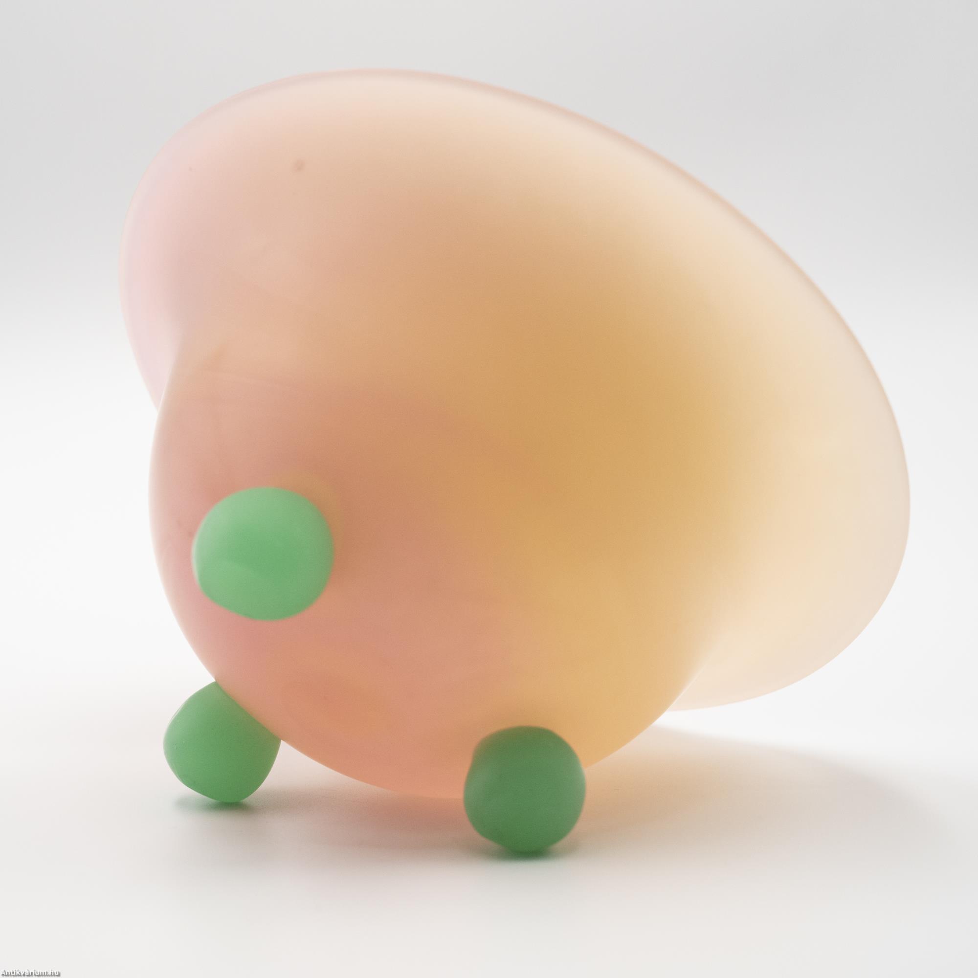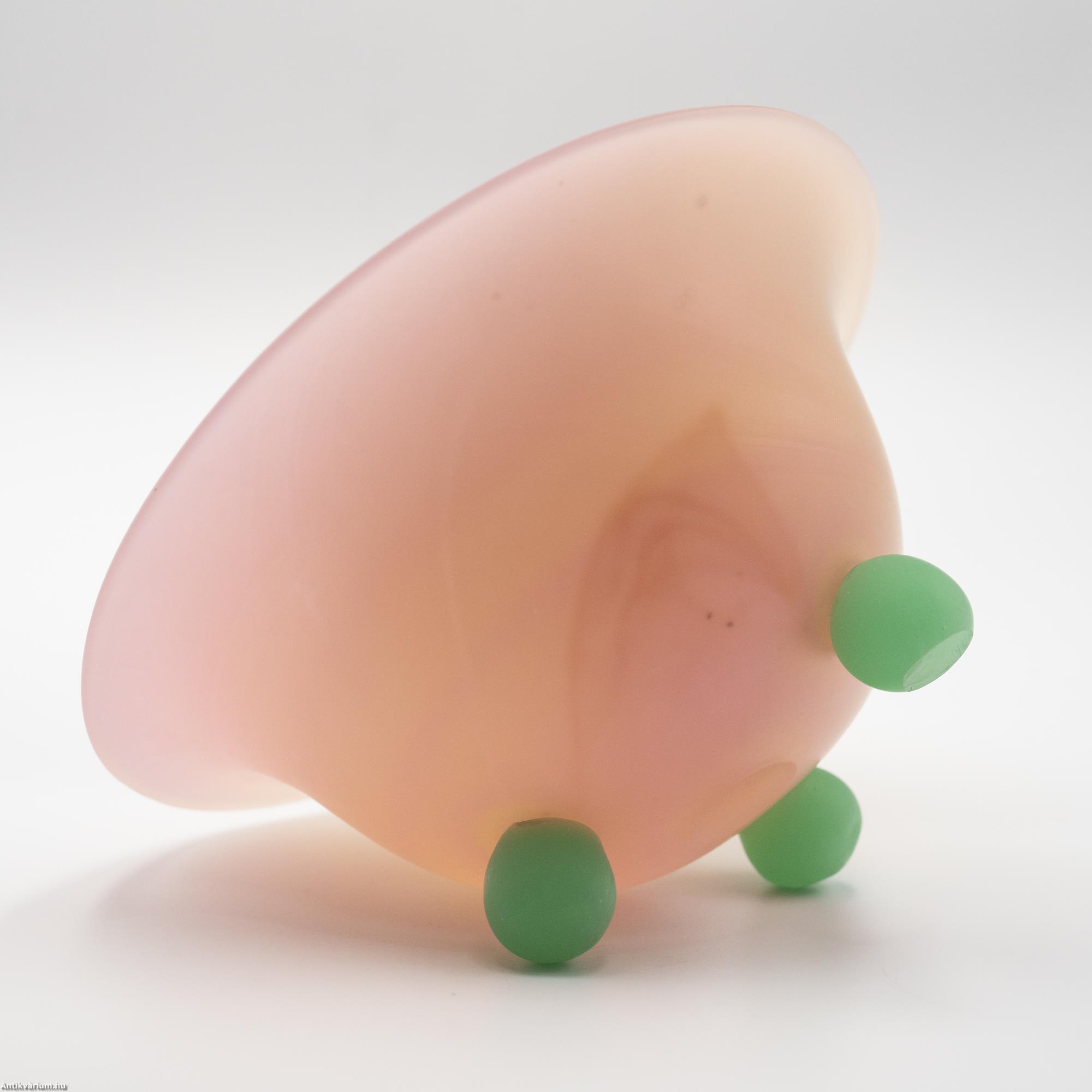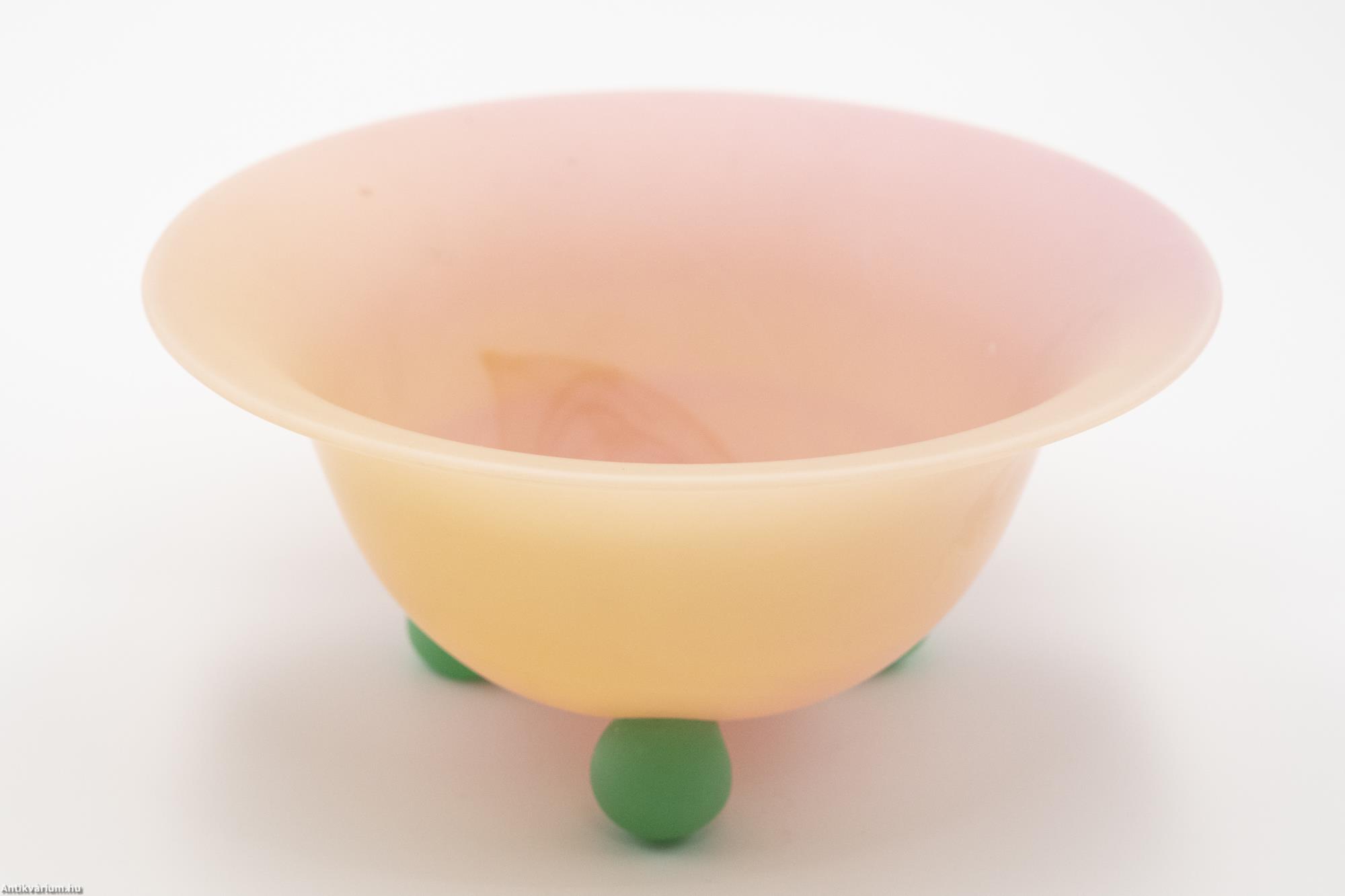 Hibátlan állapotú, fújt és kézzel formázott matt art deco üveg kaspó, amelyet Michael Powolny tervezett a Loetz üveggyár számára az 1920- as években. Rózsaszín üveg felületén különleges pink színű aszimmetrikusan megjelenő márványos mintázat látható. A felső kehelyrésztől merőben elütő forma és színvilágot mutat a három zöld színű gömbtalp, amely szokatlan és újító design volt alkotása idejében. Az üvegváza különleges megjelenését a pasztell és a az élénk szín erős kontrasztja és az ezt kihangsúlyozó egyedi forma párosítása adja. Michael Powolny (1871-1954) üvegtervező és szobrász a Bécsi Iparművészeti iskola tanára volt, de elsősorban kerámia tervezéssel foglalkozott. (1906-ban általa alapított Wiener Keramik) Őt tekintik modern osztrák iparművészet 20. század eleji megújítójának. Sikeres együttműködést alakított ki a Wiener Werkstadttal és a Loetz üveggyárral, számos tervei valósultak meg ezek égisze alatt.