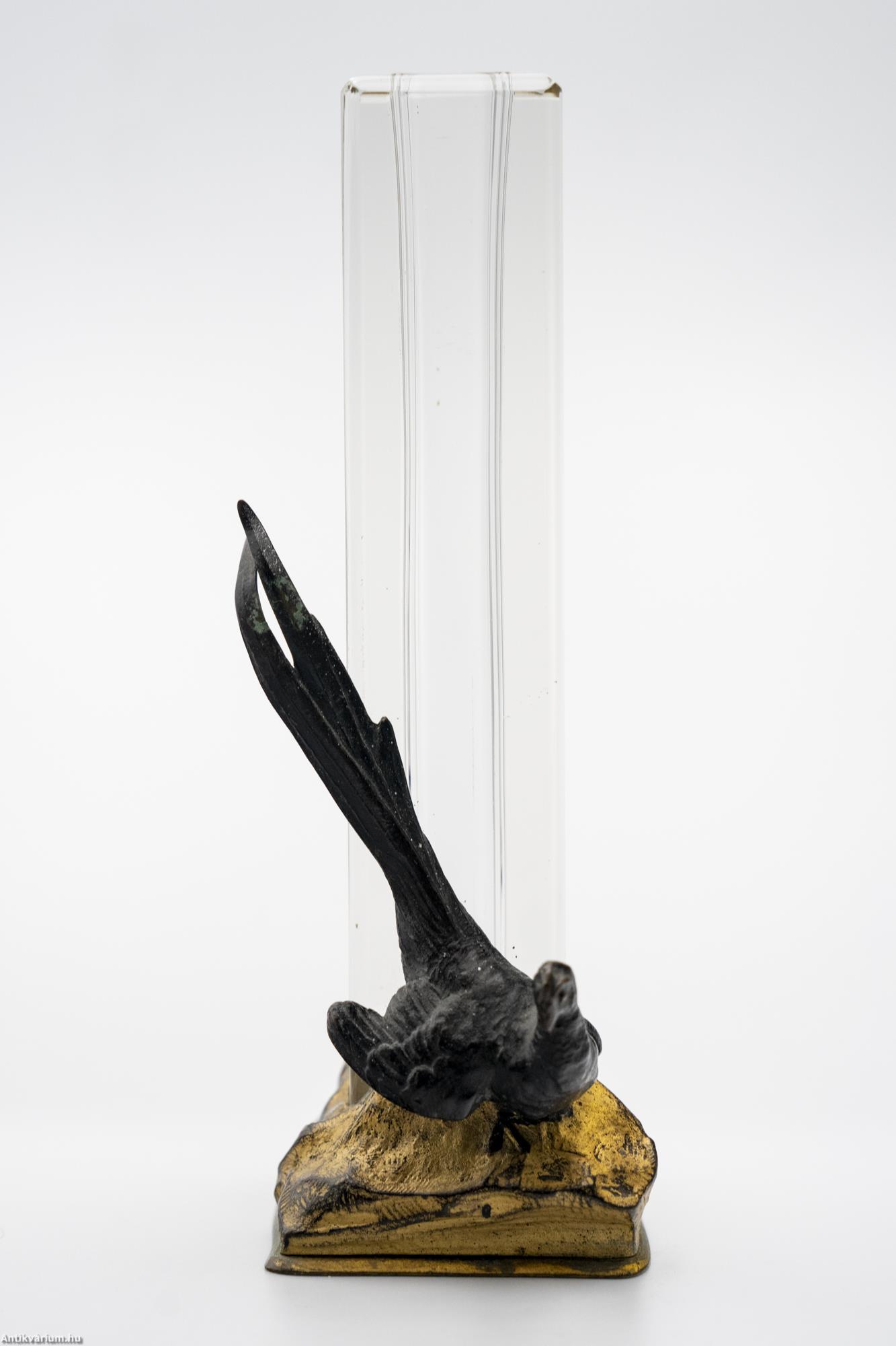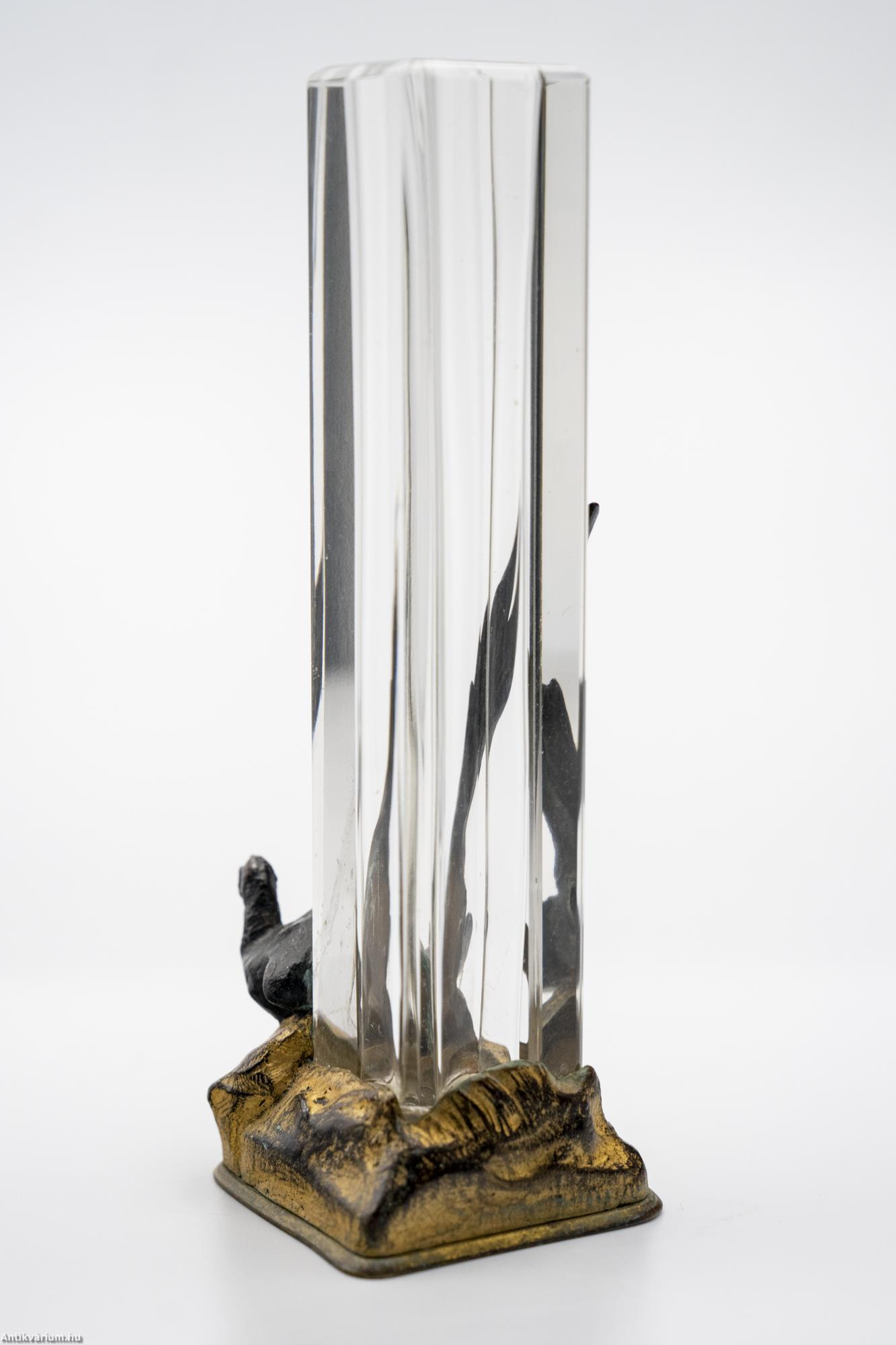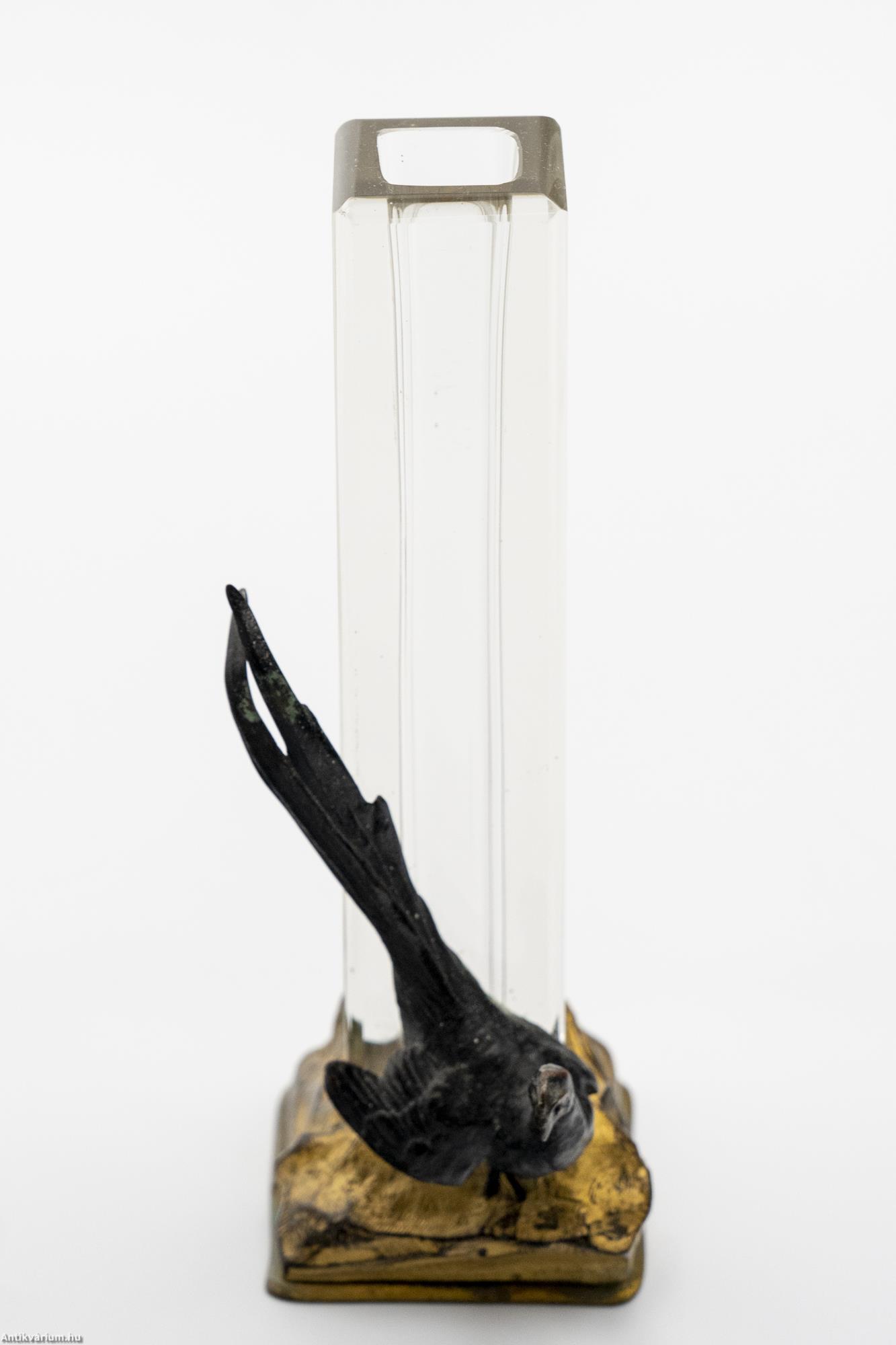 Hibátlan állapotú, fújt és kézzel formázott francia art deco színtelen üveg váza a 20. elejéről. Mind formájában, mind anyaghasználatában jellegzetes art deco alkotás, amelyen a lapra csiszolt geometrikus formájú üveg váza részt fémből megmunkált madár alak díszít. A vázát és az azt díszítő kompozíciót szintén fémből készült és aranyozott, stilizáltan domborzatot ábrázoló stabil alapzat tartja. Különleges formai megoldású üveg váza, amiben a színek helyett a kompozíció és a térbeli megformálás kap hangsúlyt.