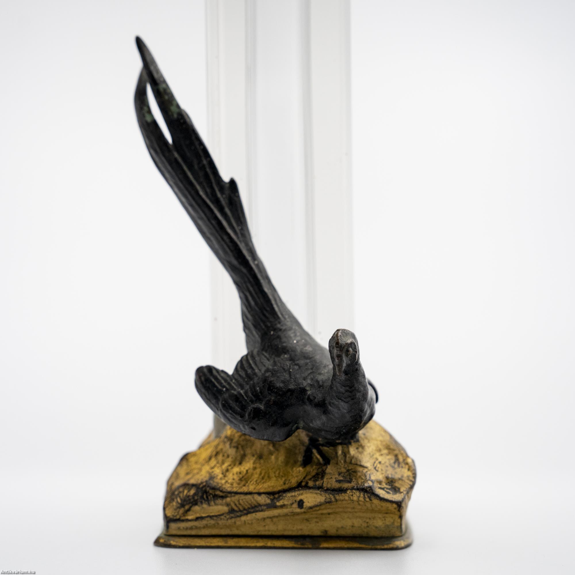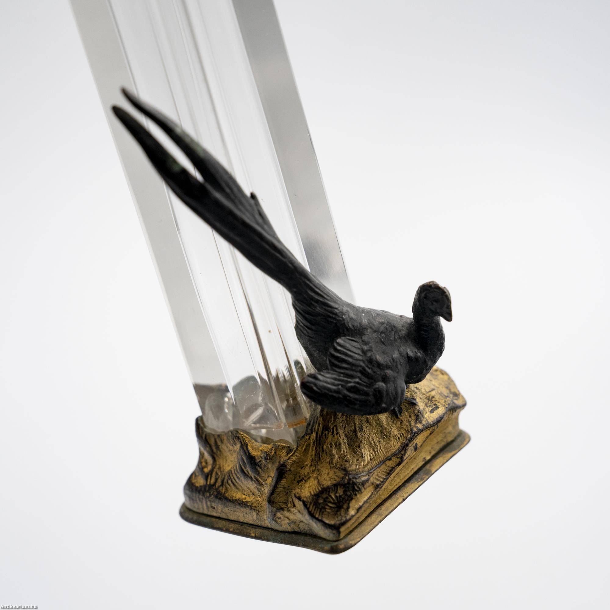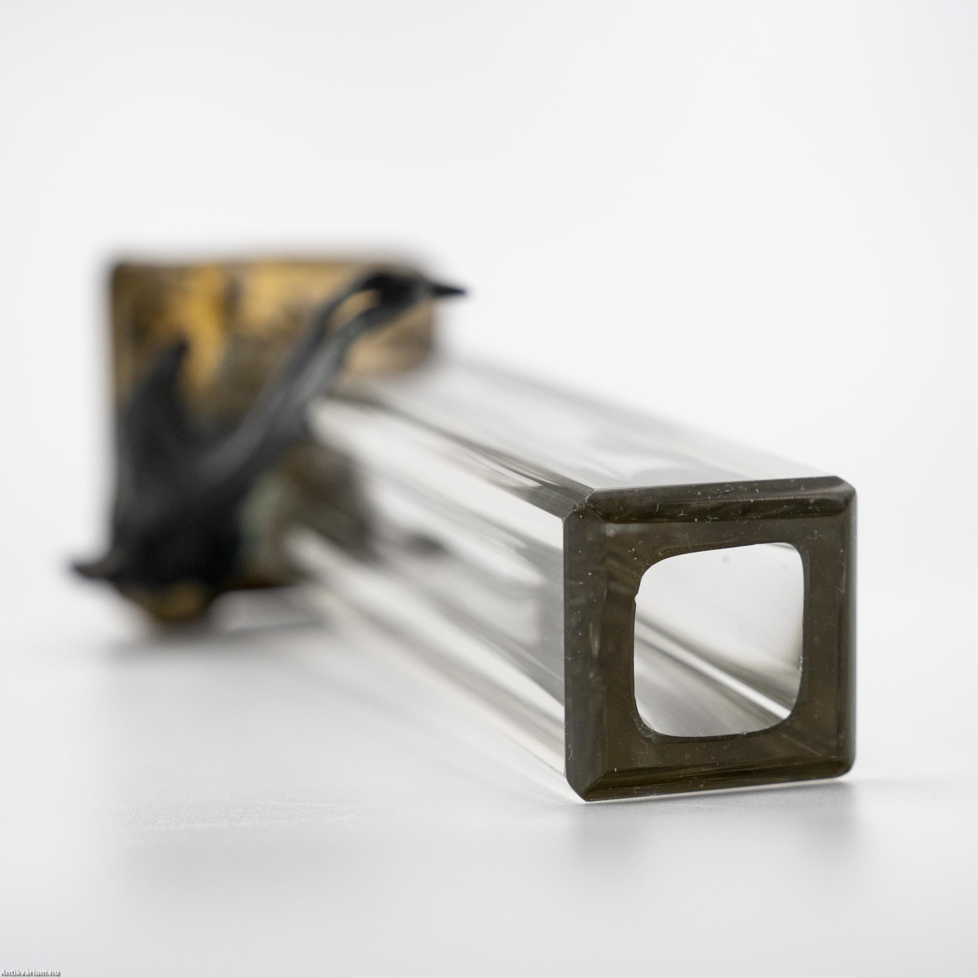 Hibátlan állapotú, fújt és kézzel formázott francia art deco színtelen üveg váza a 20. elejéről. Mind formájában, mind anyaghasználatában jellegzetes art deco alkotás, amelyen a lapra csiszolt geometrikus formájú üveg váza részt fémből megmunkált madár alak díszít. A vázát és az azt díszítő kompozíciót szintén fémből készült és aranyozott, stilizáltan domborzatot ábrázoló stabil alapzat tartja. Különleges formai megoldású üveg váza, amiben a színek helyett a kompozíció és a térbeli megformálás kap hangsúlyt.