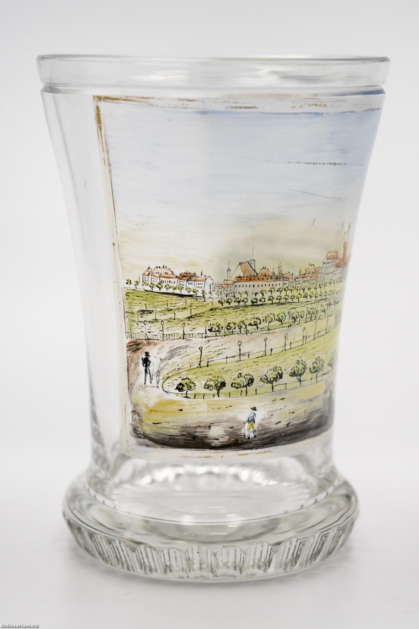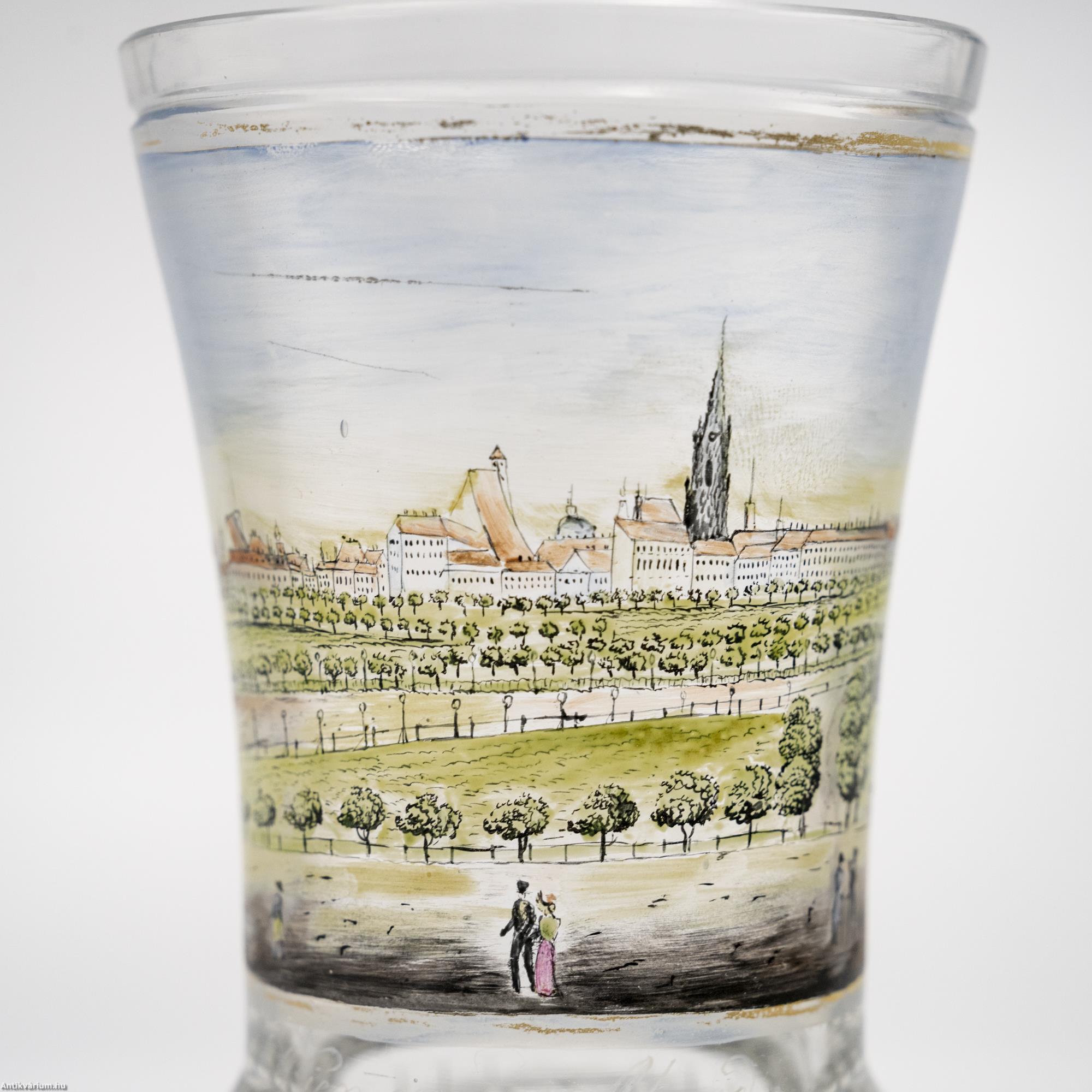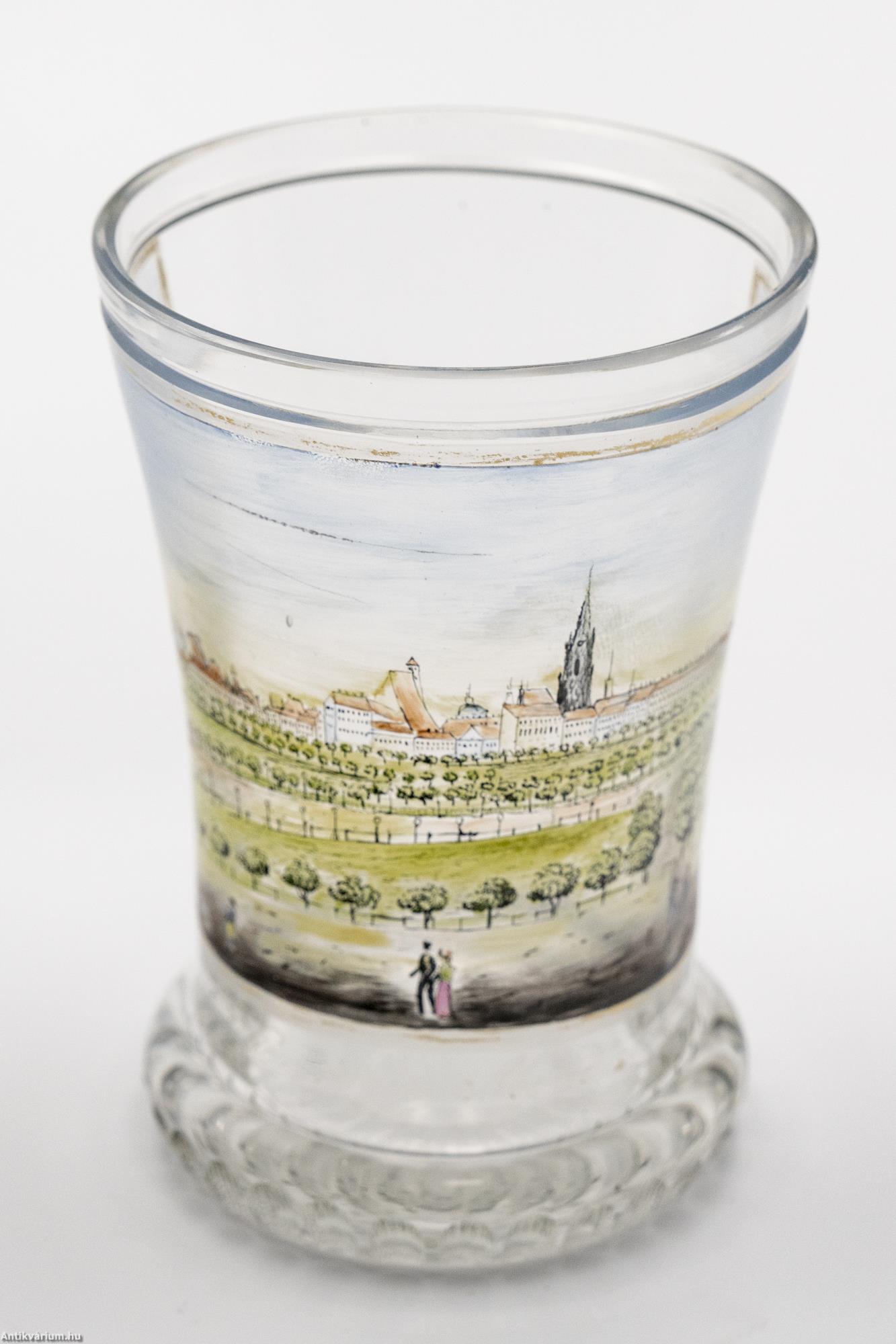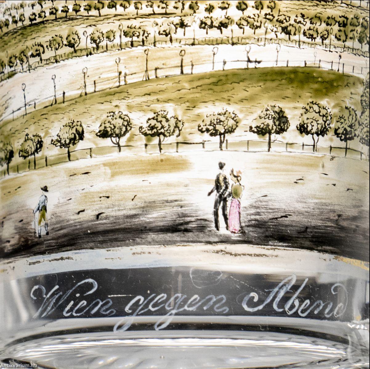 Hibátlan állapotú, fújt és kézzel formázott osztrák biedermeier festett üveg pohár a 19. század első feléből. Színtelen üvegrétegét kézzel festett arany színű keretbe foglalt város és park látkép díszíti "Wien gegen Abend" Bécs este felirattal. Bájosan megfestett idilli hangulatot ábrázoló jelenet, amelyben a hangsúlyosan ábrázolt park zöldje mögött feltűnik Bécs akkori látképe is. Az üvegpohár alsó pereme körkörösen futó, ovális mintában csiszolást sáv díszíti, amely csiszolt minta nyújtott alakban centrális elrendezésben a talprészen is megjelenik. Elegáns pohár, amely különleges megjelenésével illeszkedhet be egy hasonló korú pohár gyűjteménybe.