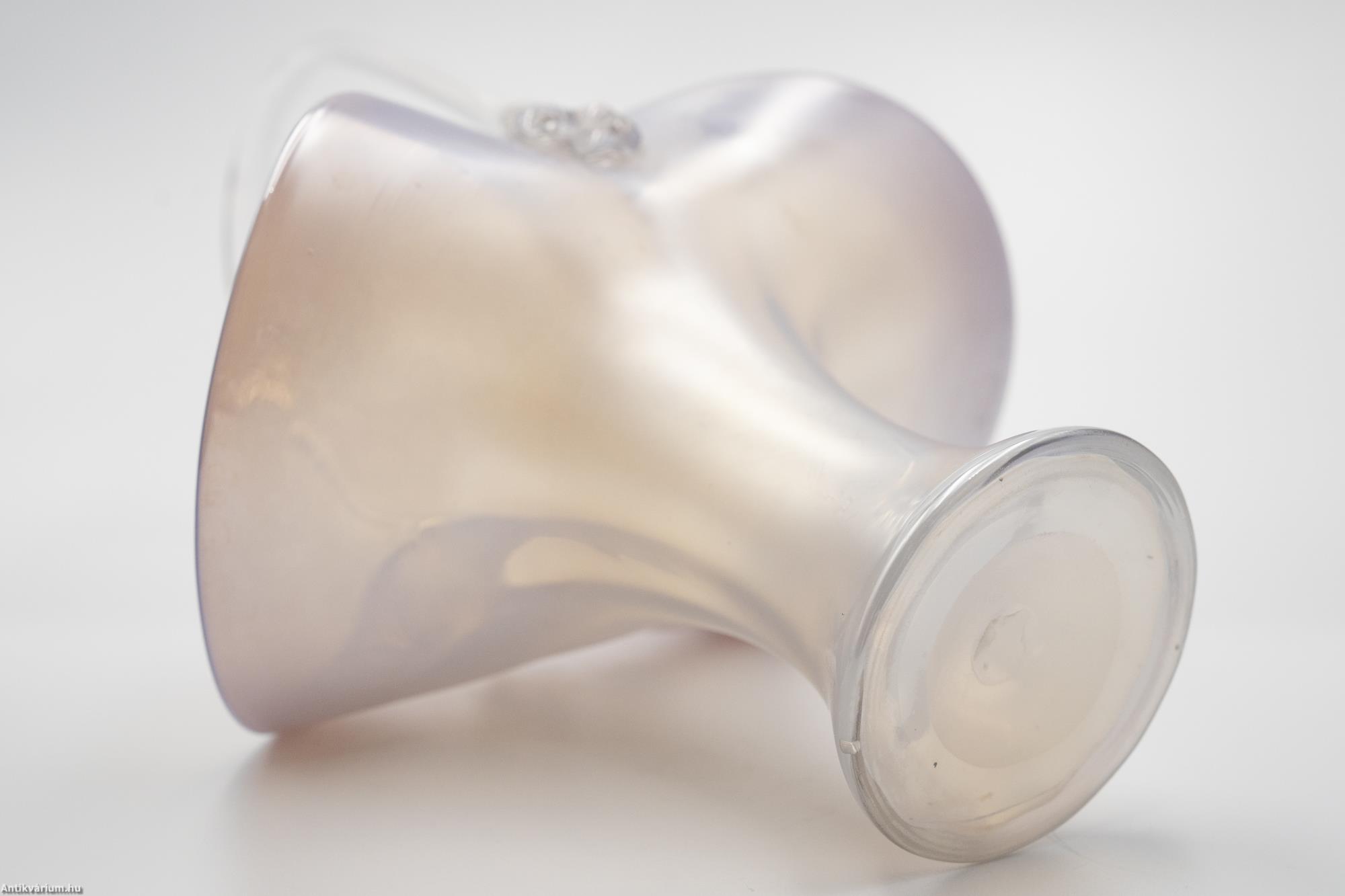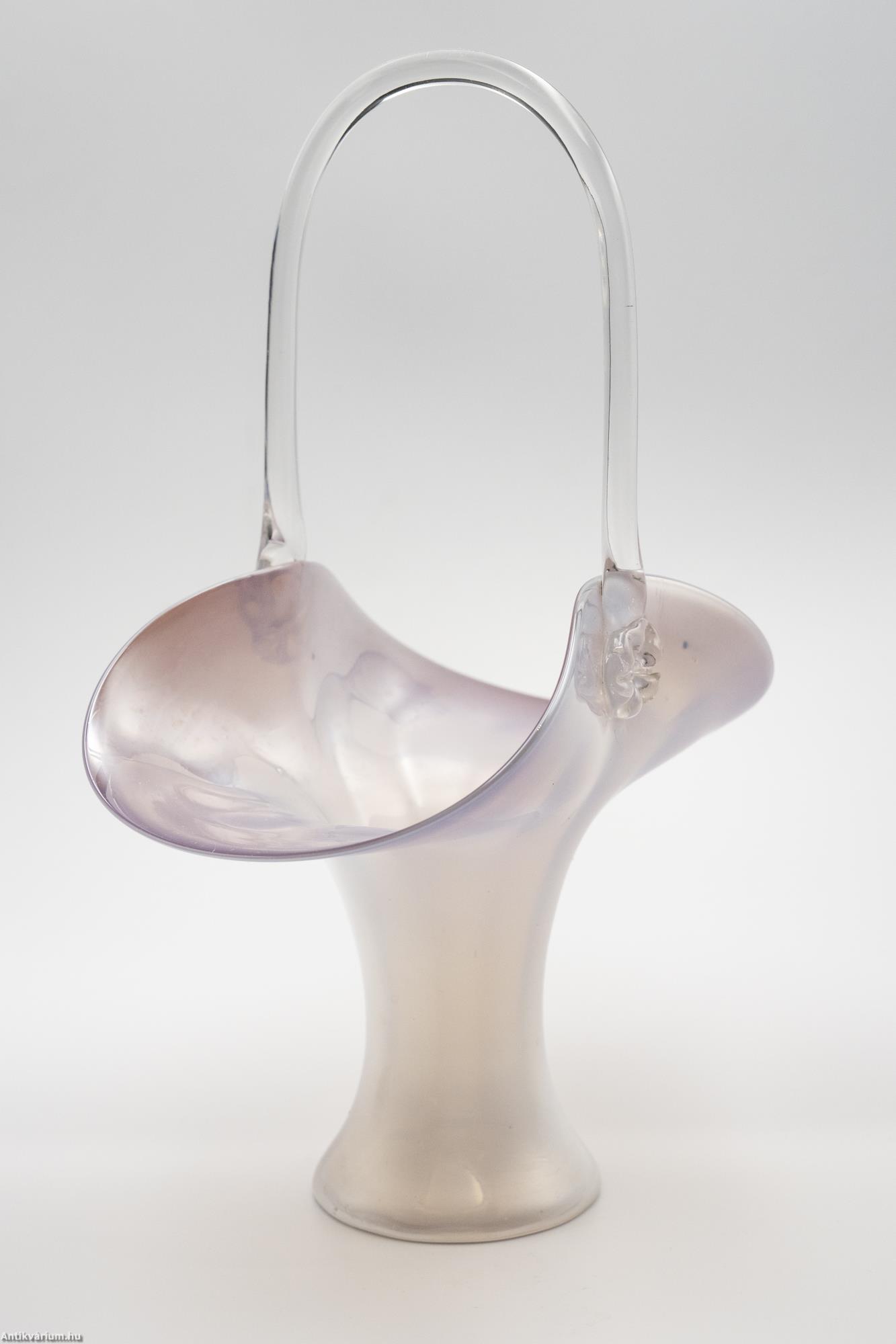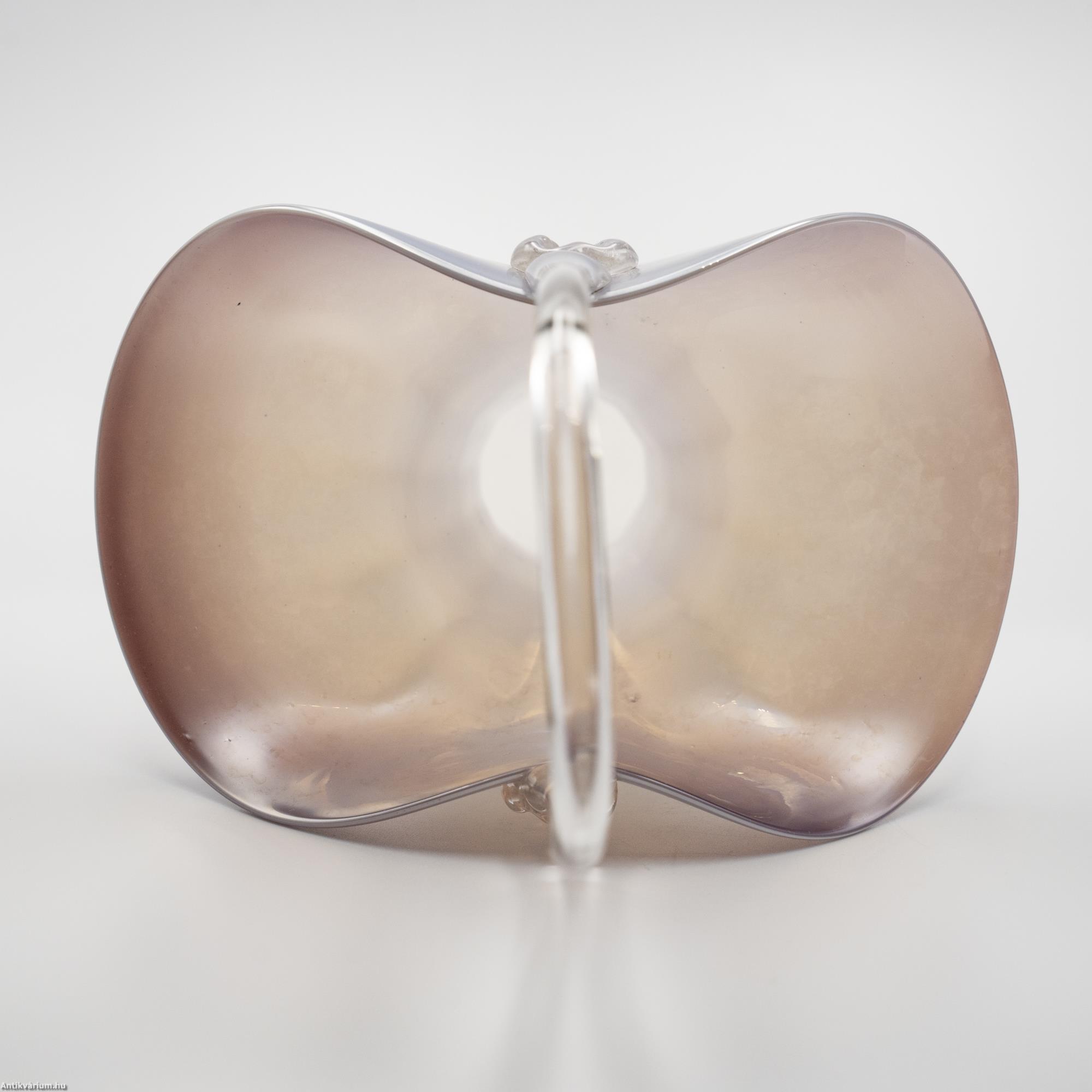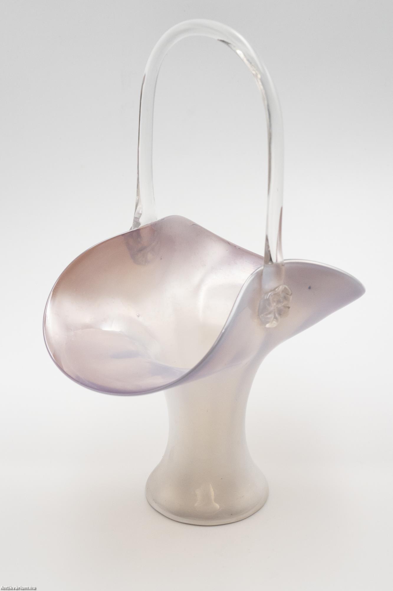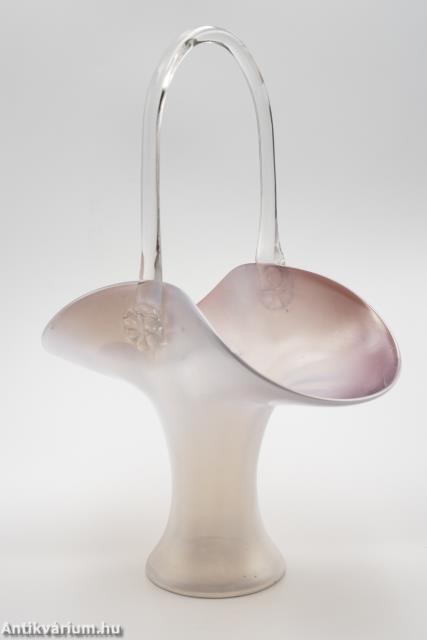 Hibátlan állapotú, lüszteres felületű, gyöngyház fényű nagy méretű Kralik lila üveg kínáló kosár a 20. század elejéről. Fújt és kézzel formázott üveg kínáló kosár, színtelen üvegszálból készített fül díszítéssel, amelyet virág formájú üvegrátét dísz kapcsol az alsó részhez. A fújás helye körkörösen kicsiszolva. Finom pasztell szín árnyalatokat, harmonikus íves vonalakat és arányos formai tagoltságot megjelenítő alkotás. Méretének és funkciójának köszönhetően különleges dísz- és használati tárgy is egyben.