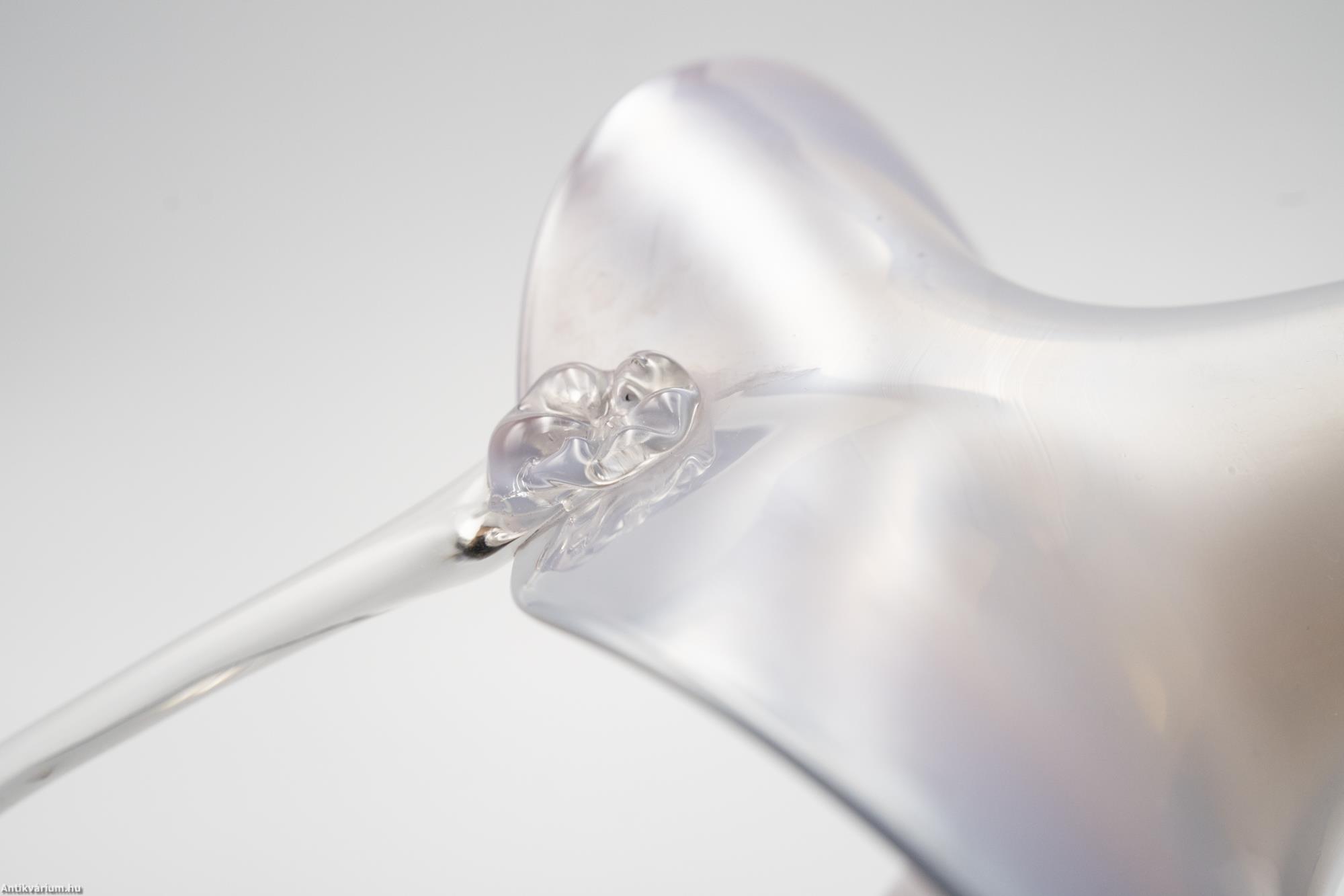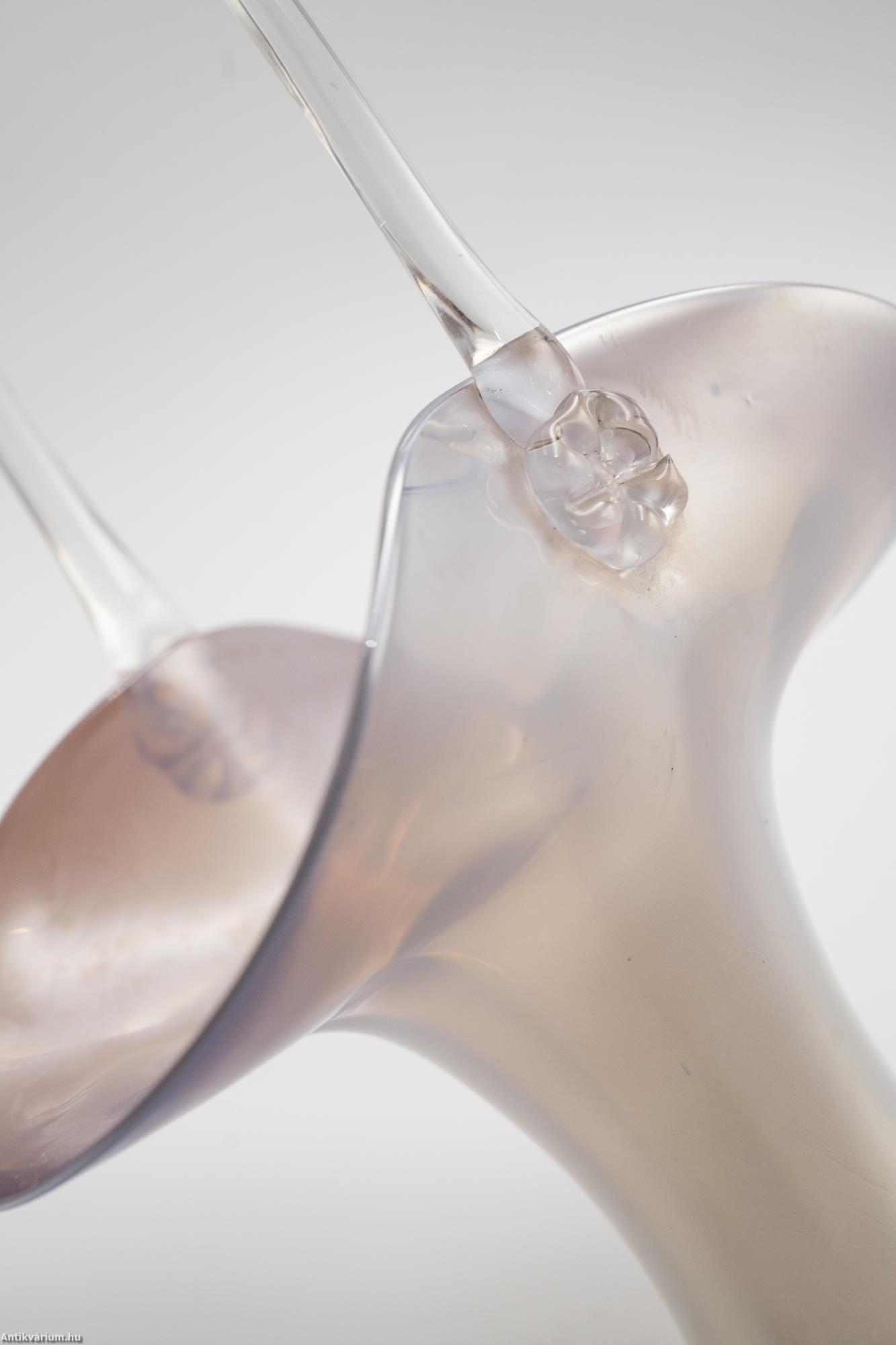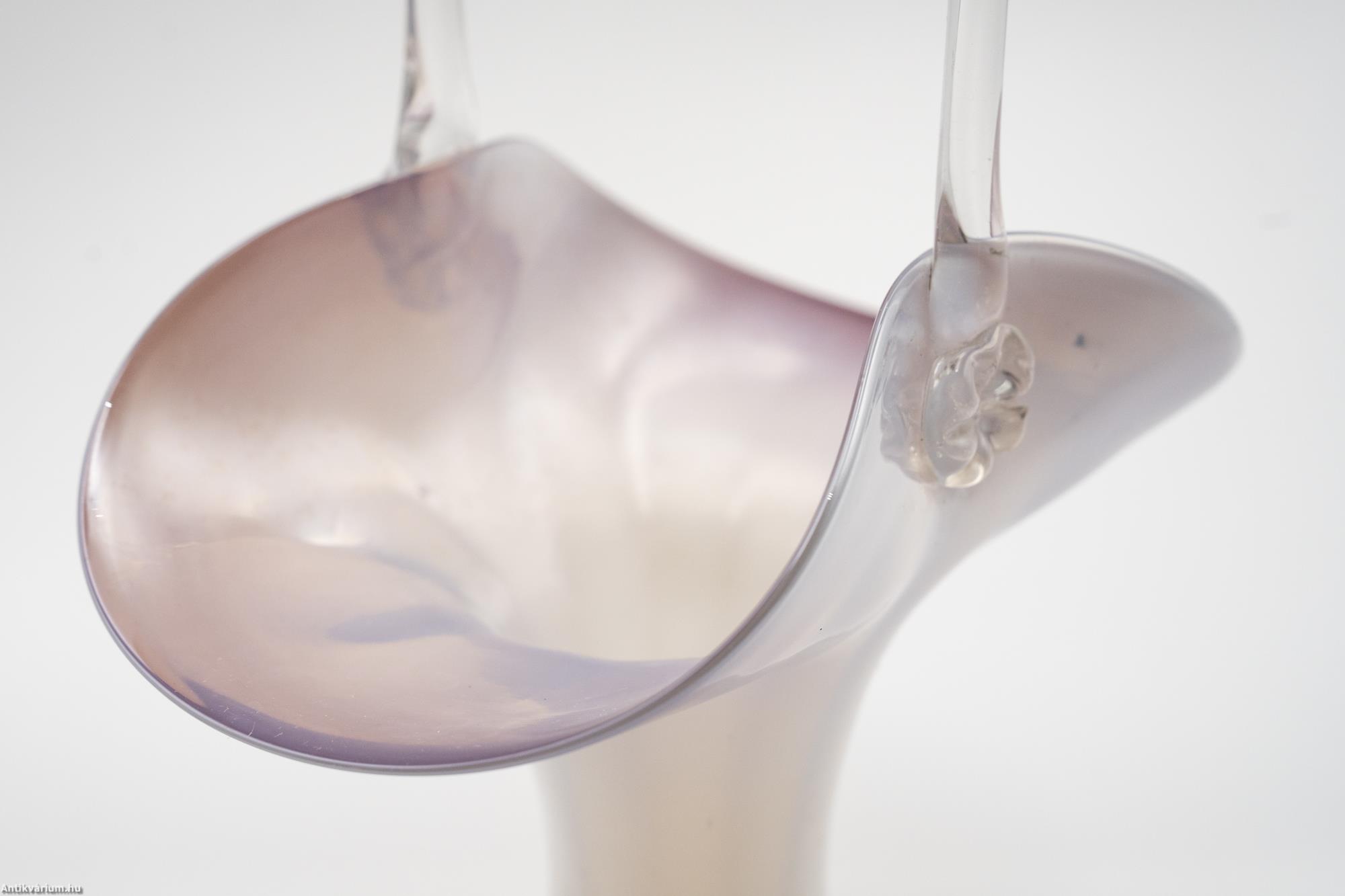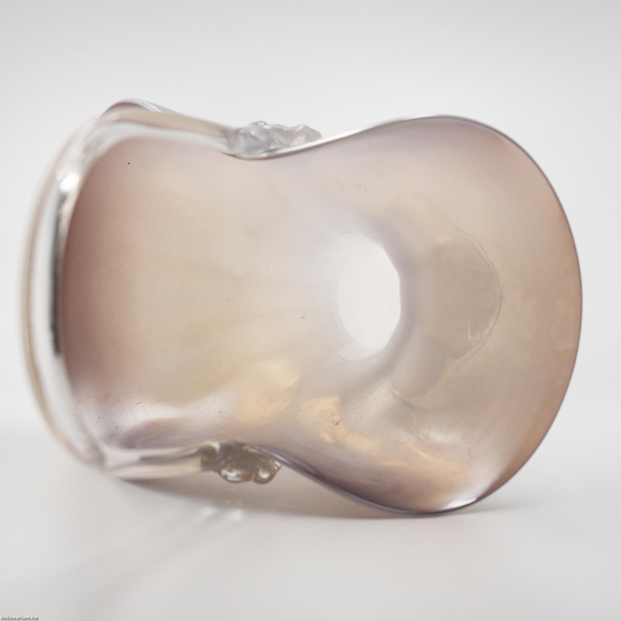 Hibátlan állapotú, lüszteres felületű, gyöngyház fényű nagy méretű Kralik lila üveg kínáló kosár a 20. század elejéről. Fújt és kézzel formázott üveg kínáló kosár, színtelen üvegszálból készített fül díszítéssel, amelyet virág formájú üvegrátét dísz kapcsol az alsó részhez. A fújás helye körkörösen kicsiszolva. Finom pasztell szín árnyalatokat, harmonikus íves vonalakat és arányos formai tagoltságot megjelenítő alkotás. Méretének és funkciójának köszönhetően különleges dísz- és használati tárgy is egyben.