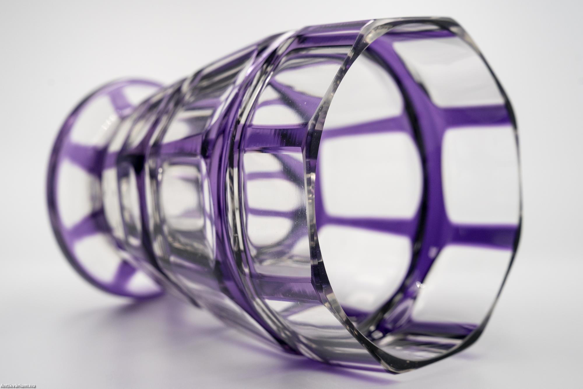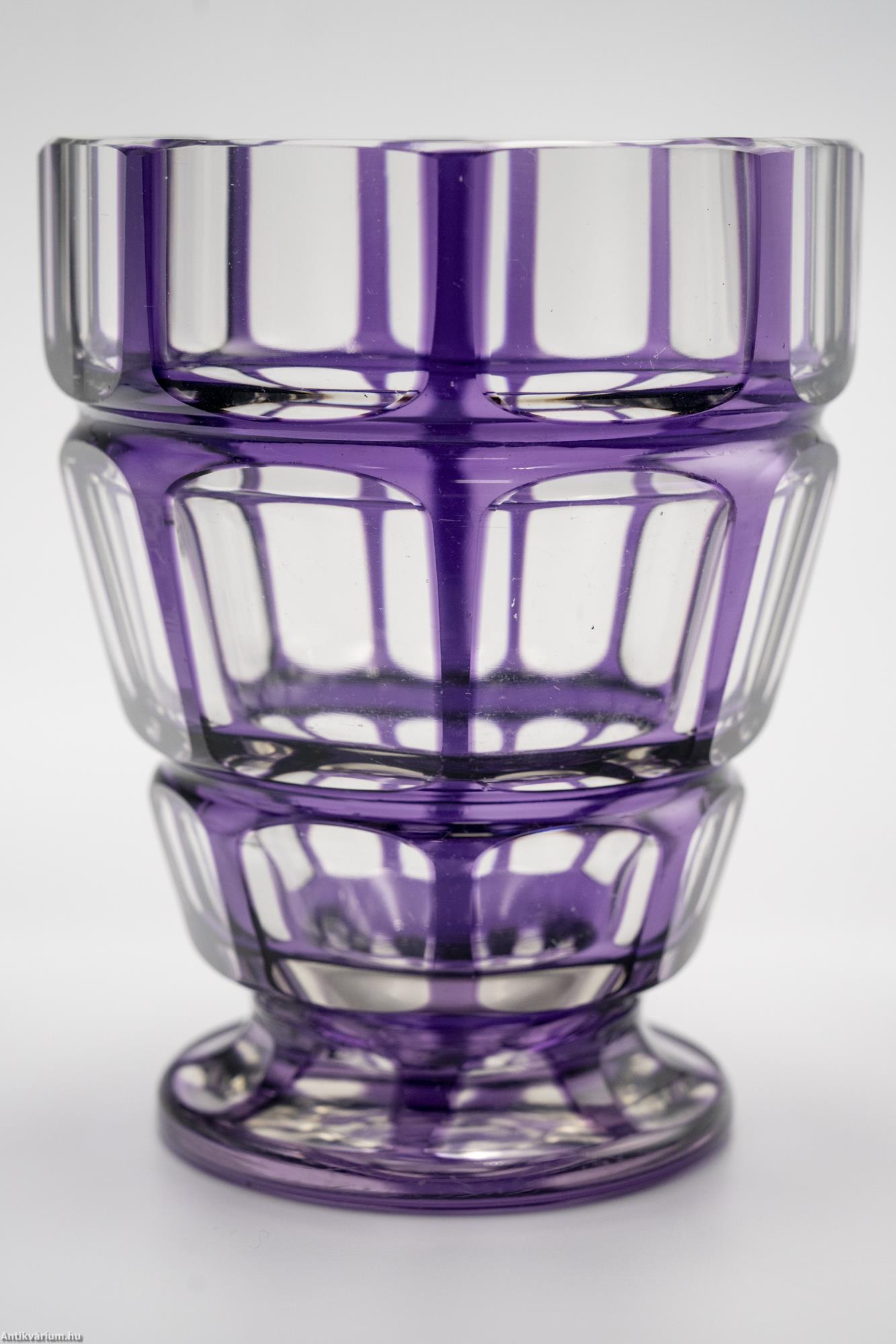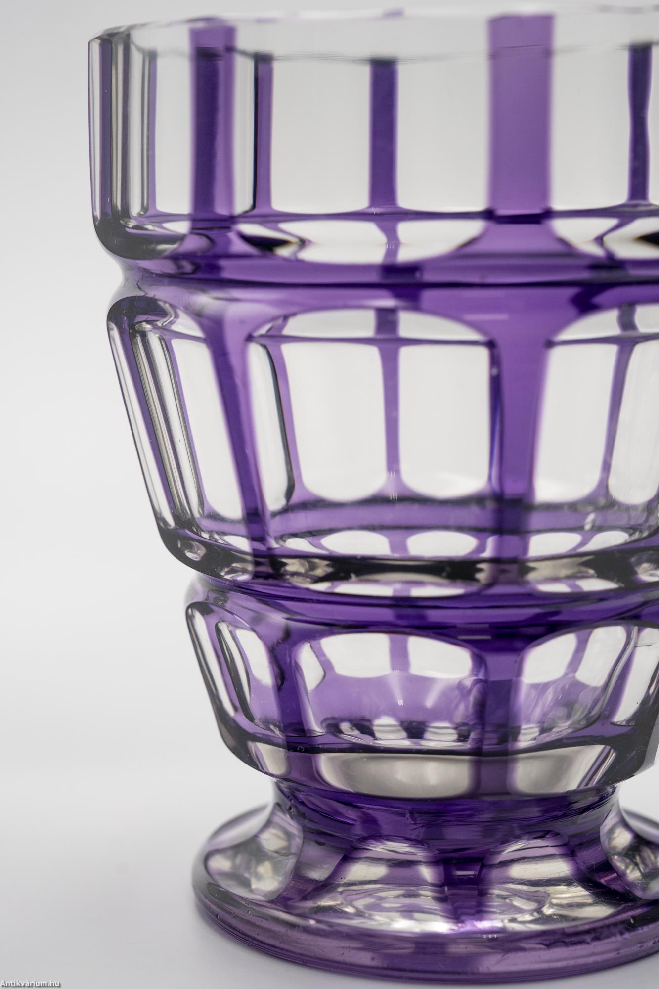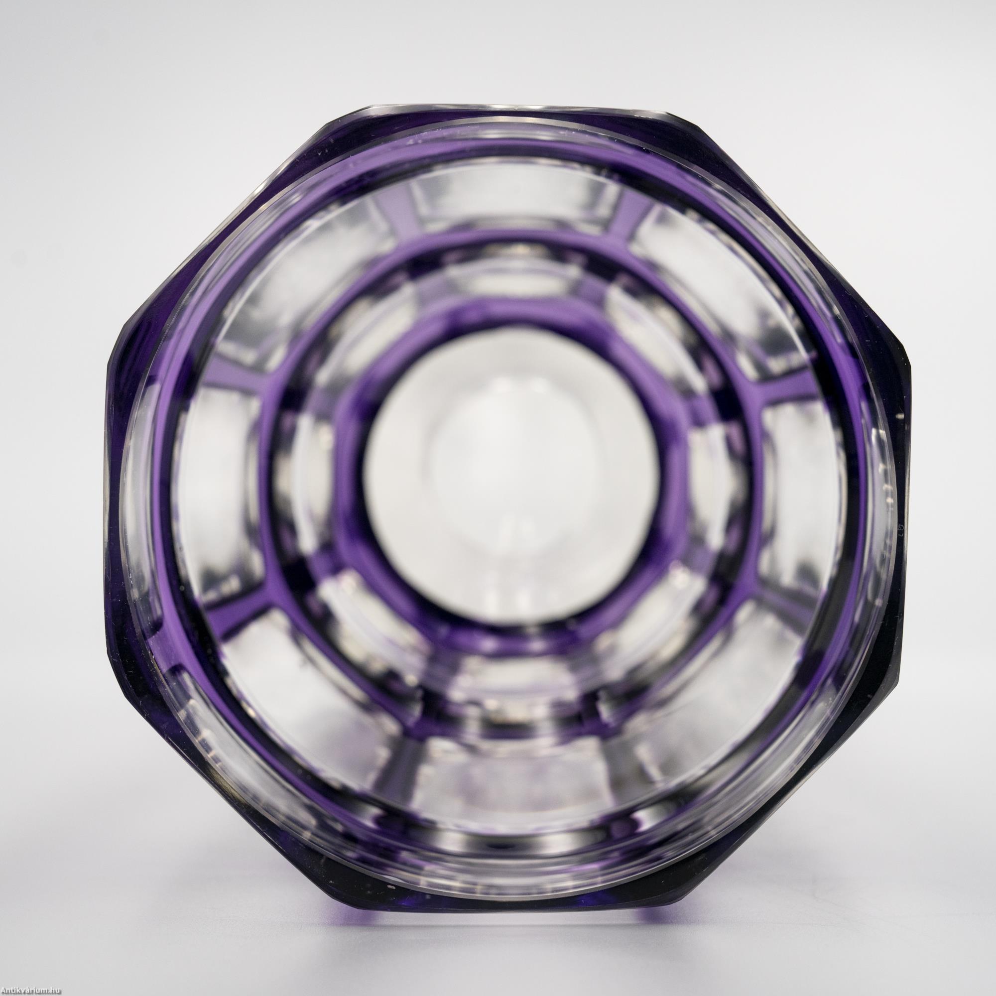 Hibátlan állapotú, fújt, kézzel formázott Haida Üvegmanufaktúrában készült art deco többrétegű üveg váza, külső lila rétegéből optikailag különlegesen kivitelezett geometrikus visszacsiszolásokkal. A vízszintesen három részre tagolt, nyolcosztásos csiszolással díszített kiszélesedő felső rész szűkülő talprészben végződik, amelyen a csiszolás mérete és alakja hűen követ a formát. Talpa lapra csiszolt. Készítésének ideje 20. század eleje.