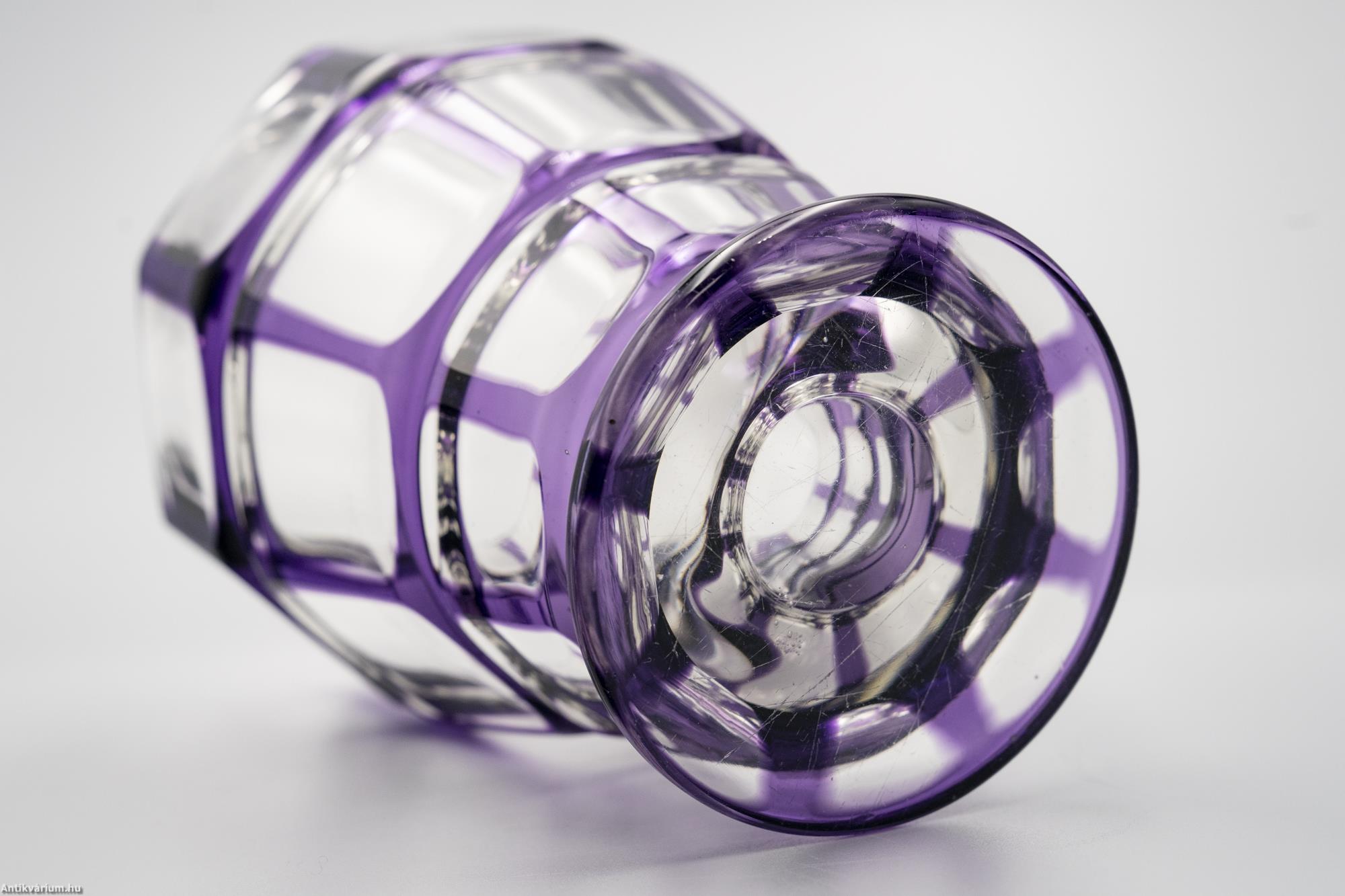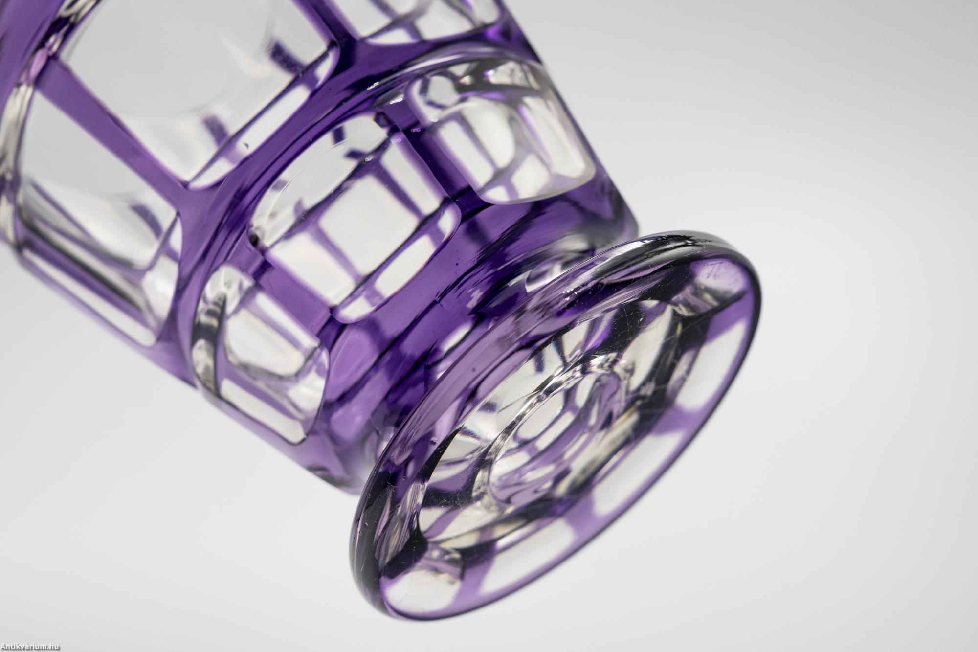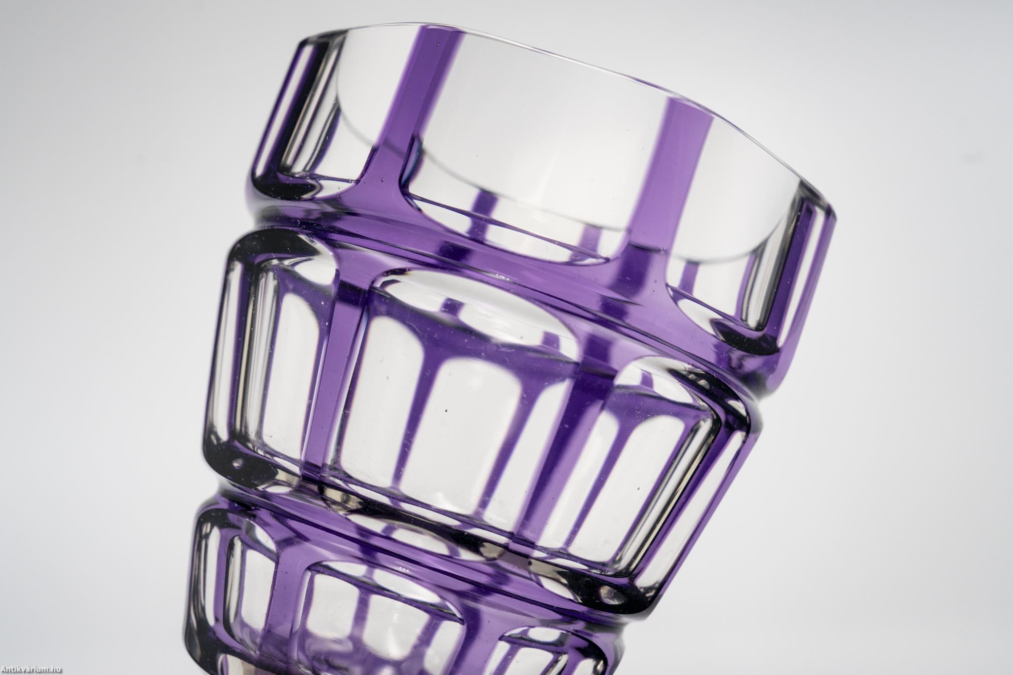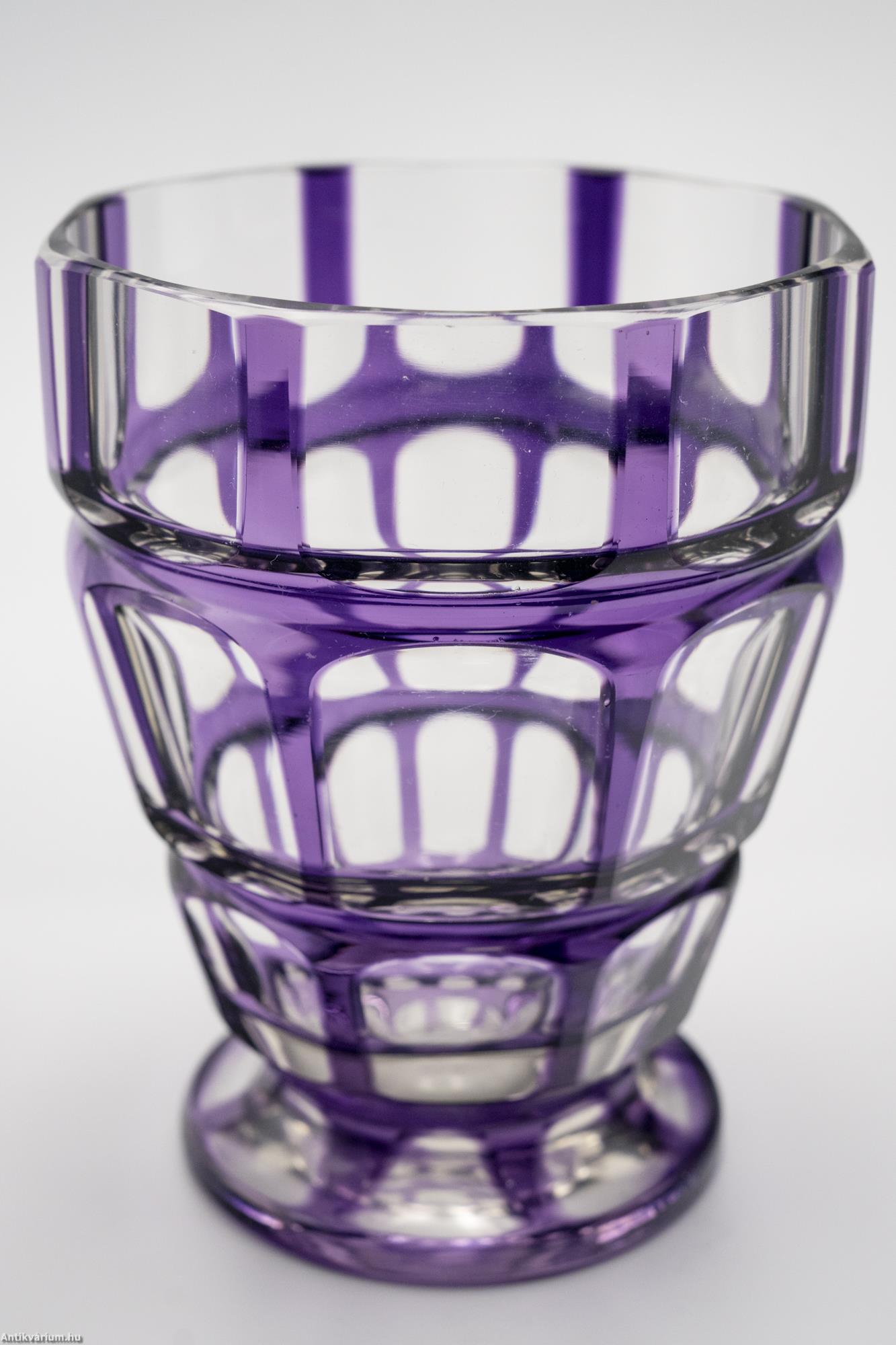 Hibátlan állapotú, fújt, kézzel formázott Haida Üvegmanufaktúrában készült art deco többrétegű üveg váza, külső lila rétegéből optikailag különlegesen kivitelezett geometrikus visszacsiszolásokkal. A vízszintesen három részre tagolt, nyolcosztásos csiszolással díszített kiszélesedő felső rész szűkülő talprészben végződik, amelyen a csiszolás mérete és alakja hűen követ a formát. Talpa lapra csiszolt. Készítésének ideje 20. század eleje.