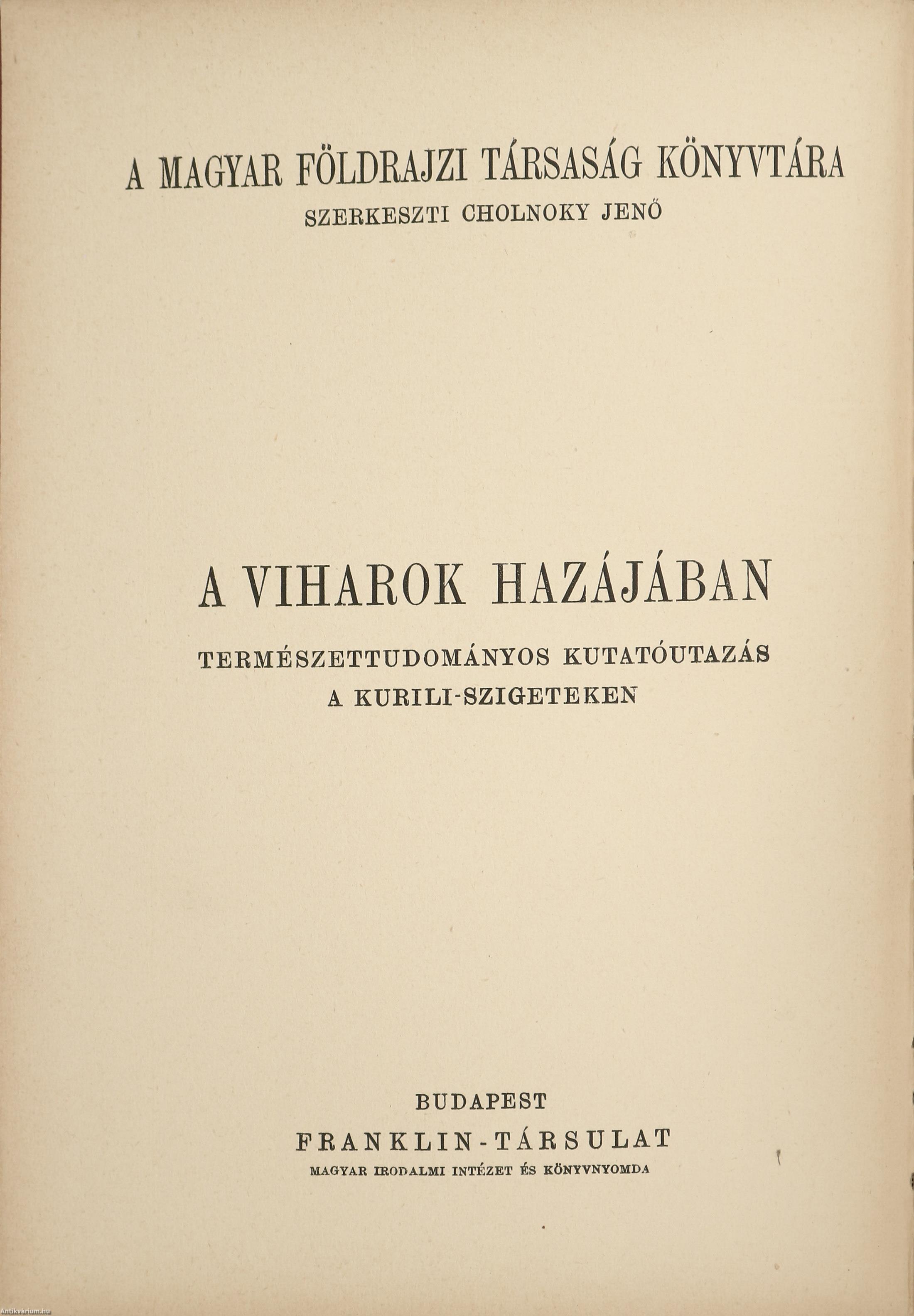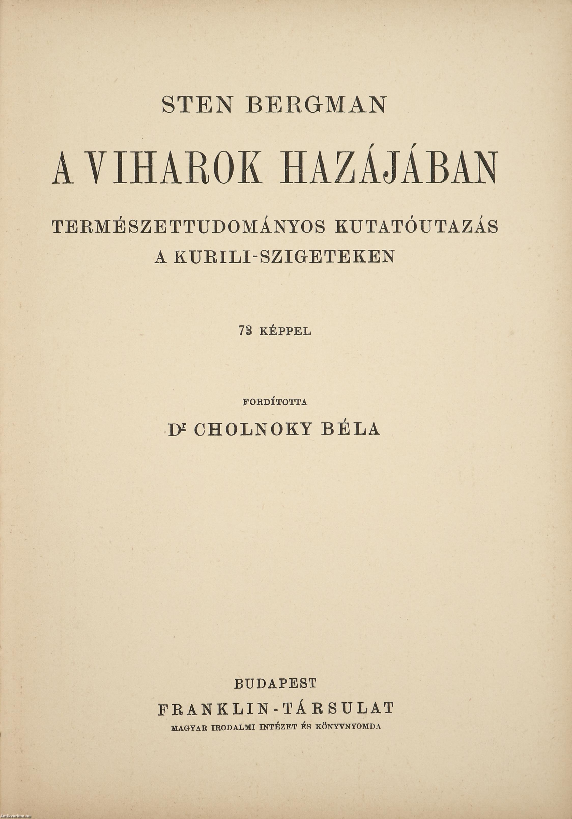 A viharok hazájában. Természettudományos kutatóutazás a Kurili-szigeteken. Írta: Sten Bergman. Fordított: Dr. Cholnoky Jenő.