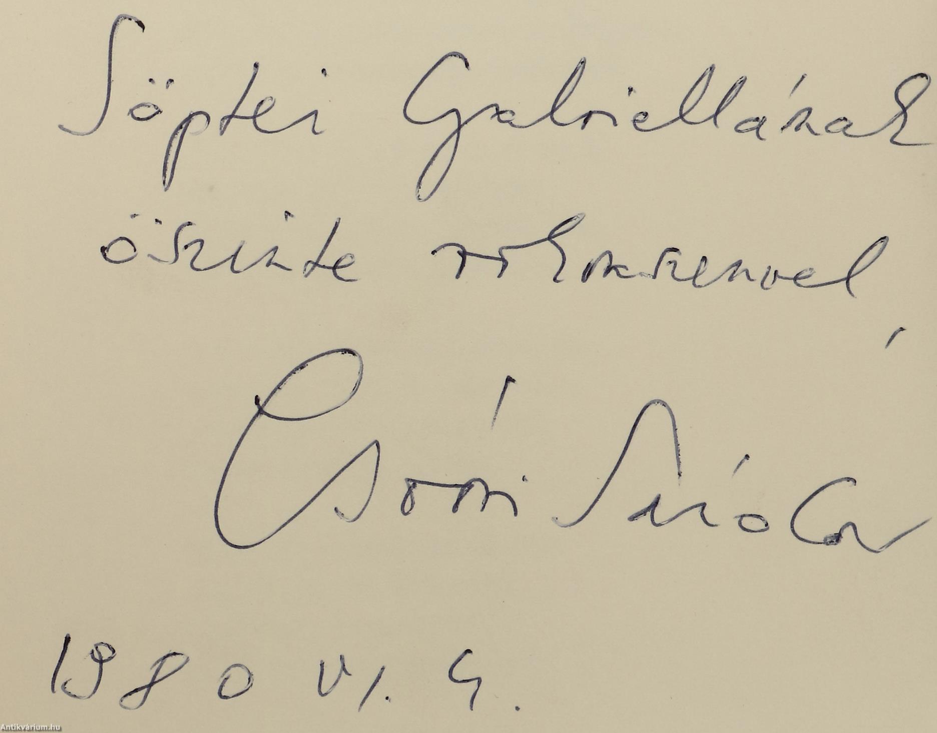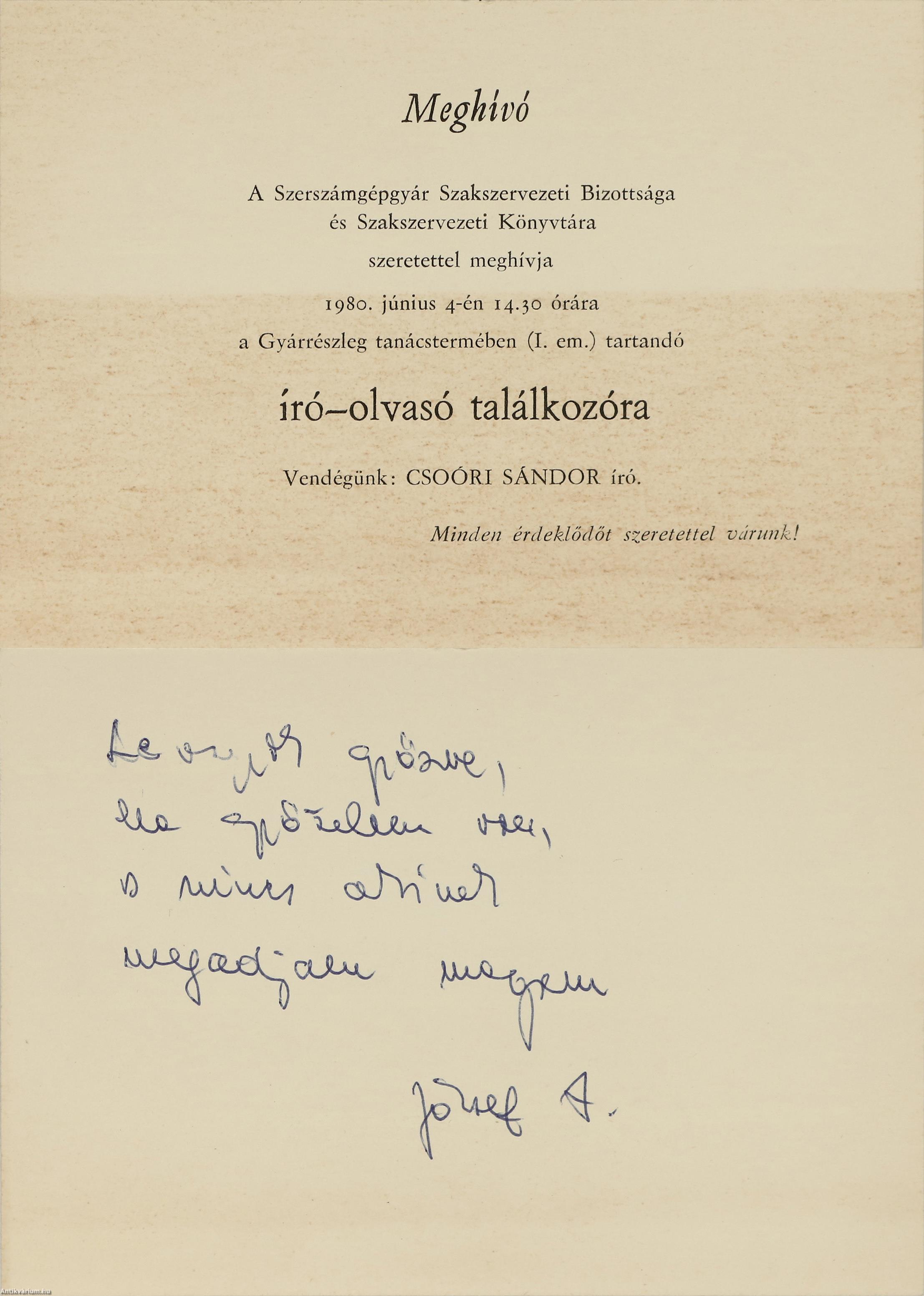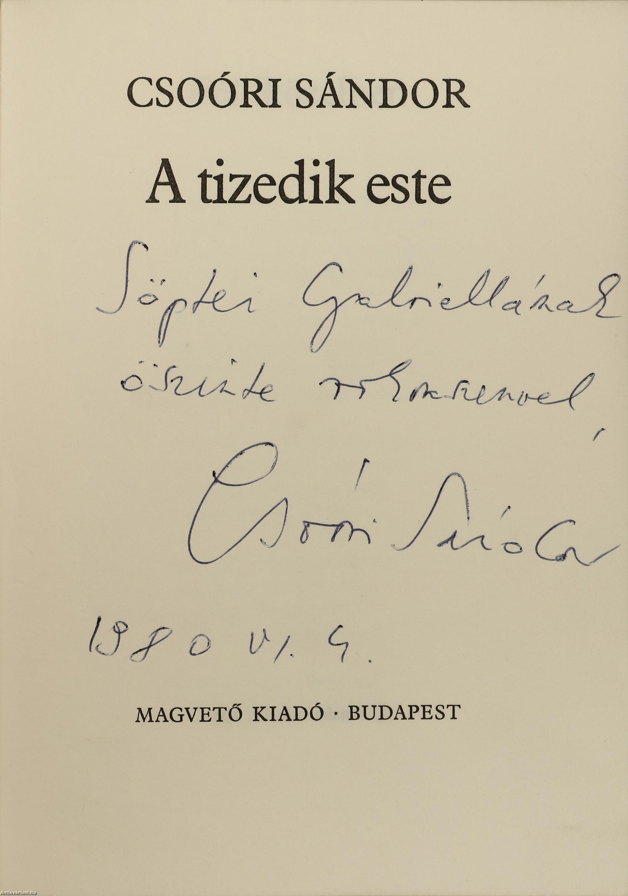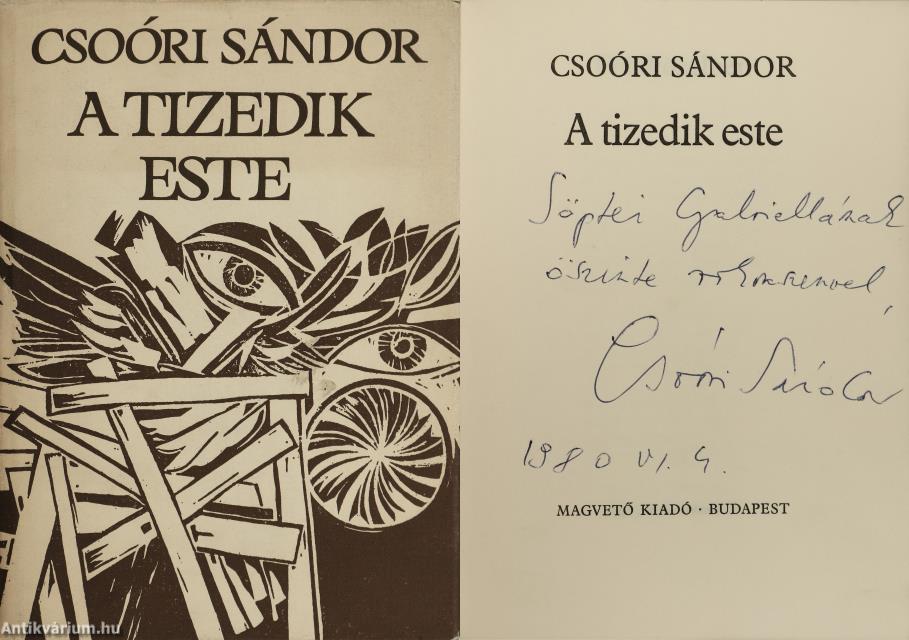 Szerző által dedikált példány. Első kiadás. A tizedik este. Versek. Írta: Csoóri Sándor. A címlapon a szerző, Csoóri Sándor tollal beírt, névre szóló dedikációja olvasható: "S. G.-nak öszinte rokonszenvel, Csoóri Sándor, 1980 VI. 4." A védőborítót Nagy András tervezte. Részletes tartalomjegyzékkel kiegészített kiadás. Nyomtatta a Kner Nyomda, Gyomán. Kiadói fűzött kemény papírkötésben lévő példány feliratozatlan, mintás címfedéllel és hátlappal, feliratos könyvgerinccel, tiszta belívekkel, hiánytalan, jó állapotban, feliratos, illusztrációval ellátott, fülszöveges, amatőr módon javított, kiadói borítófedélben. Különálló egyedi melléklet: Meghívó a Szerszámgépgyár Szakszervezeti Bizottsága és Szakszervezeti Könyvtára által szervezett író-olvasó találkozóra, melynek hátlapján egy kézzel írt József Attila idézet olvasható. A szerző, Csoóri Sándor (Zámoly, 1930. február 3. – Üröm, 2016. szeptember 12.) Kossuth- és kétszeres József Attila-díjas költő, esszéíró, prózaíró, politikus. Az irodalmi életbe 1953. augusztusában robbant be, amikor a Csillag és az Irodalmi Újság egyszerre 14 versét tette közzé. Első megjelent verseskötete Felröppen a madár címmel látott napvilágot 1954-ben, s az ifjú szerző ugyanebben az évben József Attila-díjat kapott. Különböző újságoknál és folyóiratoknál dolgozott. Az "Irodalmi Újság" munkatársaként, az "Új Hang" versrovatának szerkesztőjeként tevékenykedett. Az 1960-as évek elején a Budapesti Műszaki Egyetem újságjának volt a szerkesztői munkatársa, majd 1968-1988 között a Mafilm dramaturgja lett. A hatvanas évektől a népi-nemzeti ellenzék vezető egyénisége volt. Komoly szerepet vállalt a rendszerváltás előkészítésében és konkrét létrejöttében. Prózáját a szókimondás, a politikai érzékenység és nyelvi egyszerűség jellemzi. Költészetét viszont az egyedi szóhasználat, a lendületesség, határozottság, a szellemi finomság és sokrétűség, a végletesség és a sajátos asszociatív hajlam határozza meg.