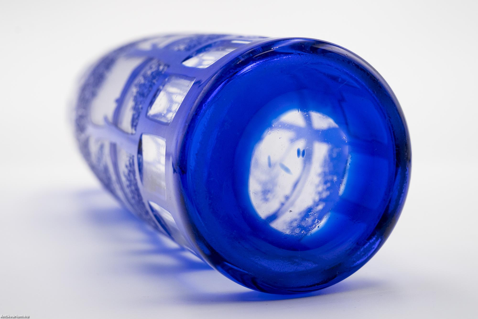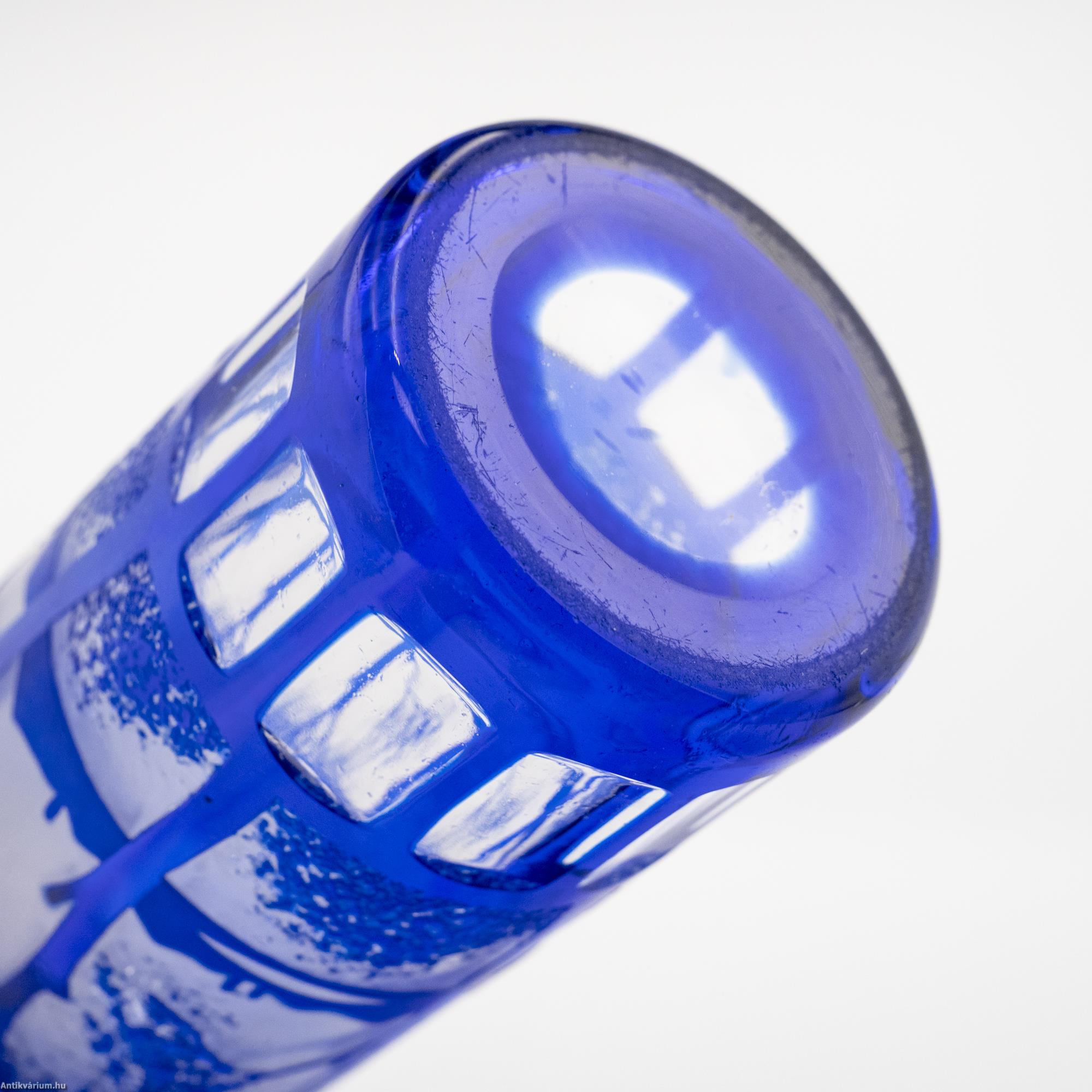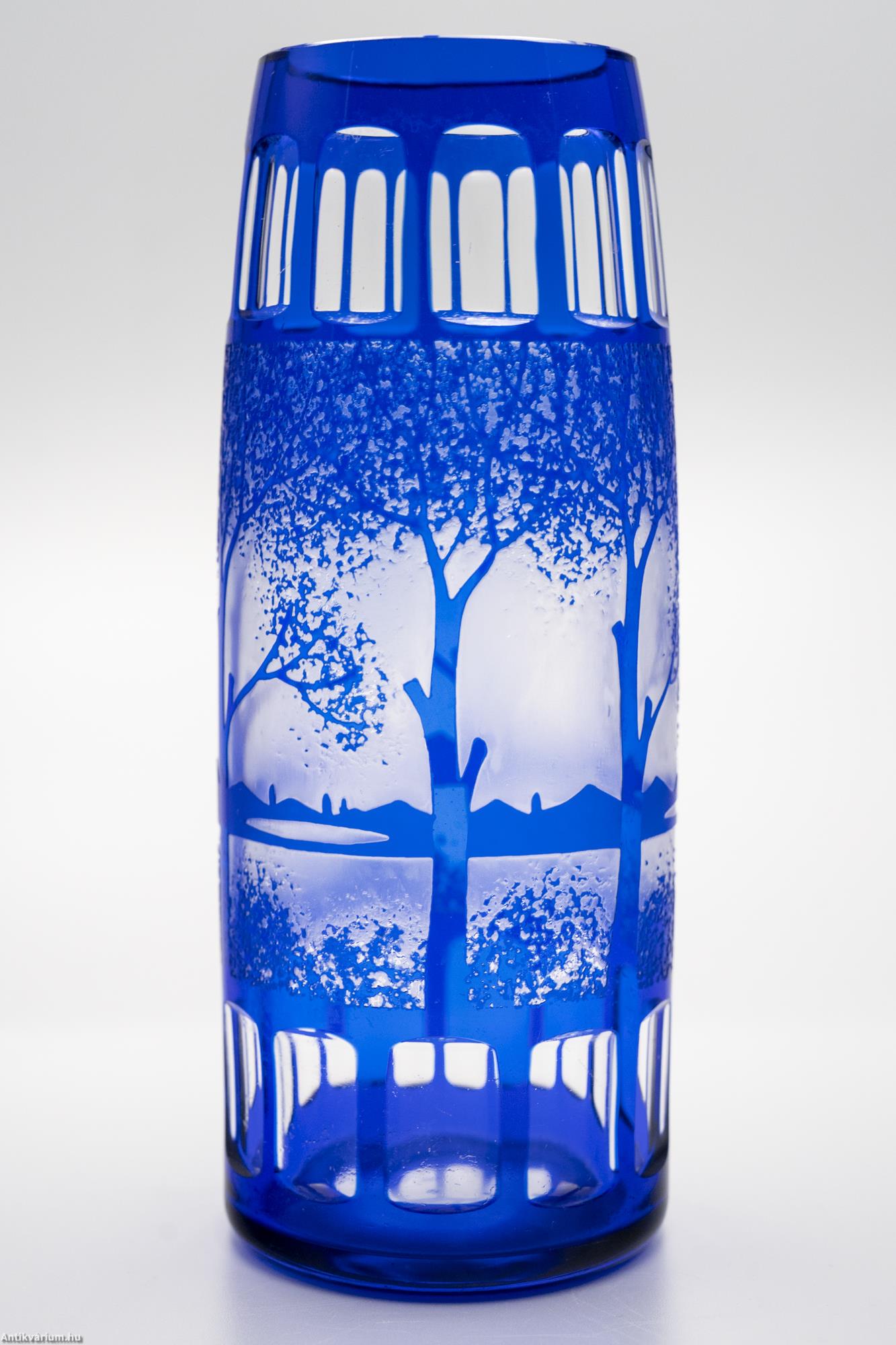 Hibátlan állapotú, fújt és kézzel formázott Kralik art deco üveg váza 1925-ből. Kobaltkék színű, lombos fákkal és hegyekkel tarkított tóparti tájképet ábrázoló váza, amely mintázat körbefutóan ismétlődik az üveg felületén. A váza különlegessége az art deco jegyeit erősen magánviselő geometrikus csiszolás és tagolás a felső és alsó részen. Talpán a fújás helye kicsiszolva. A többrétegű savmaratott cameo üvegváza jellemzője a kiváló perspektívaábrázolás és részletgazdagság, valamint a természetközeli látásmód, amelyben gyakran megjelennek a hegyi és tengeri tájak, állatok és virágok. A cameo üvegek, átlátszatlan, külső színköpenyes üvegek, ami azt jelenti, hogy a belső átlátszó felületre viszik fel a vékony, színes üvegrétegeket.