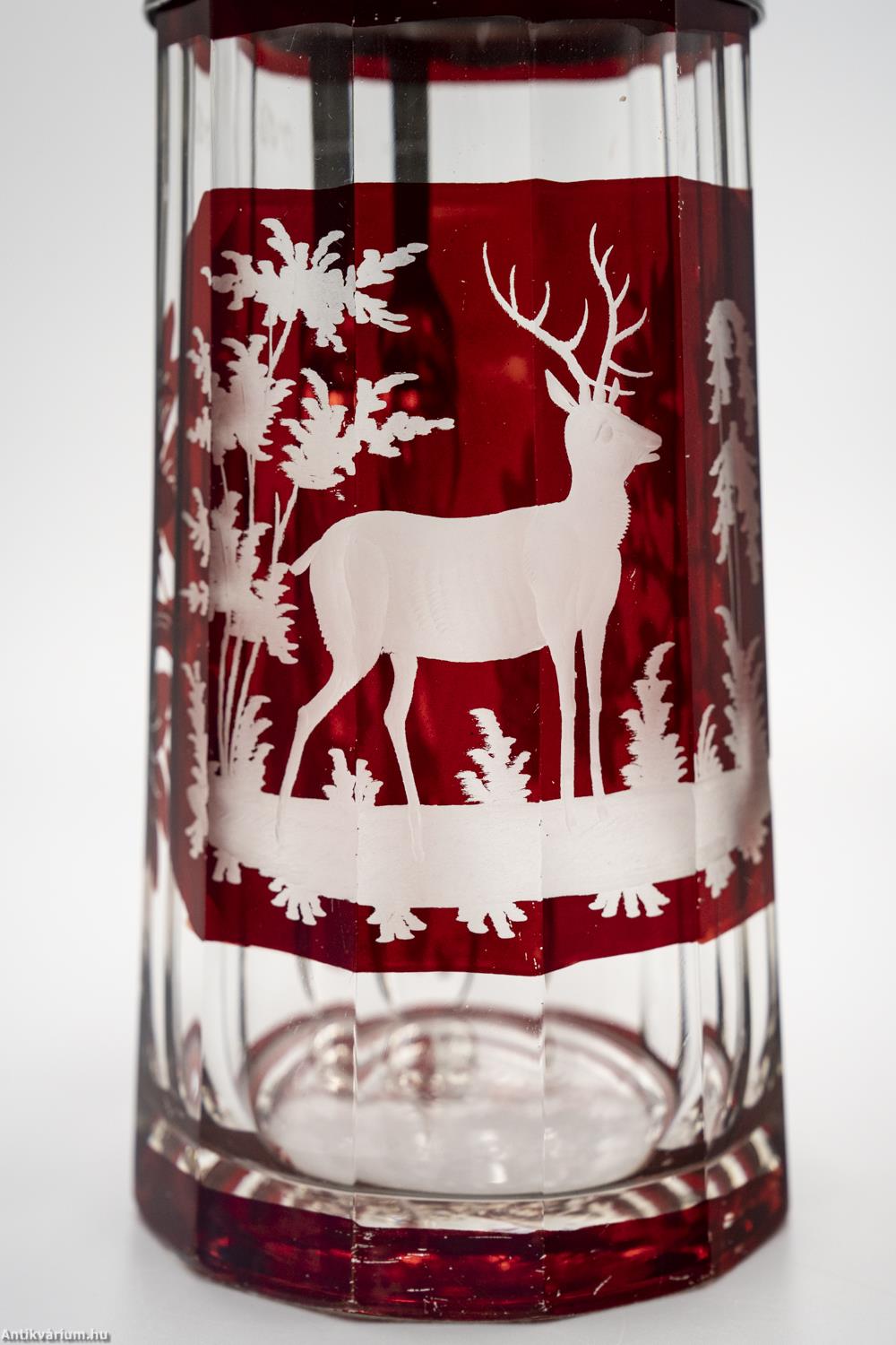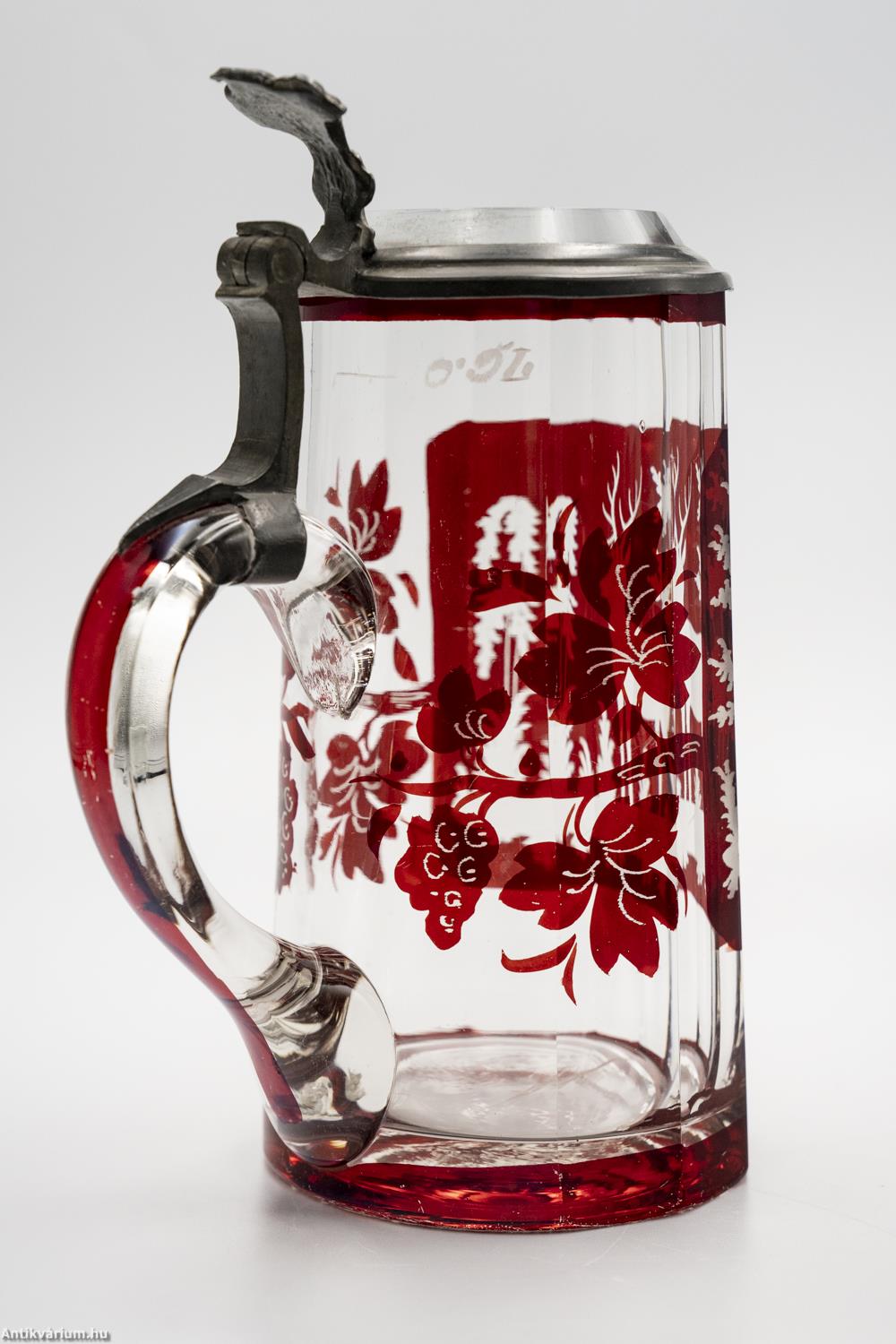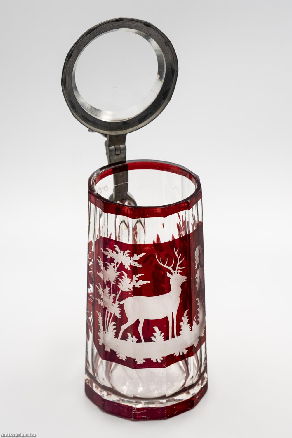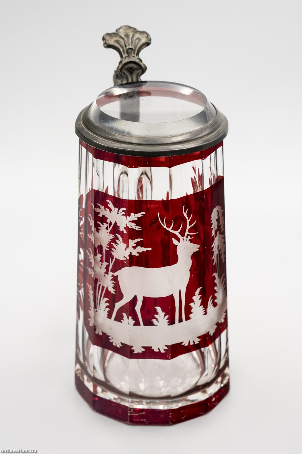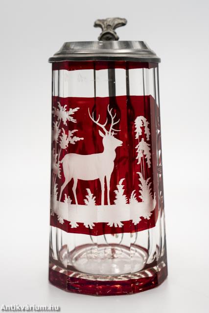 Hibátlan állapotú, fújt és kézzel formázott, valamint csiszolt és gravírozott biedermeier ónfedeles bordó üveg kupa a 19. század második feléből. Überfang technikával készített, külső bordó rétegéből szőlőlevél ornamentikás és erdei jelenetet (szarvast) ábrázoló visszacsiszolásokkal. A fogójánál űrmérték-hitelesítés látható. Talpa simára csiszolt.