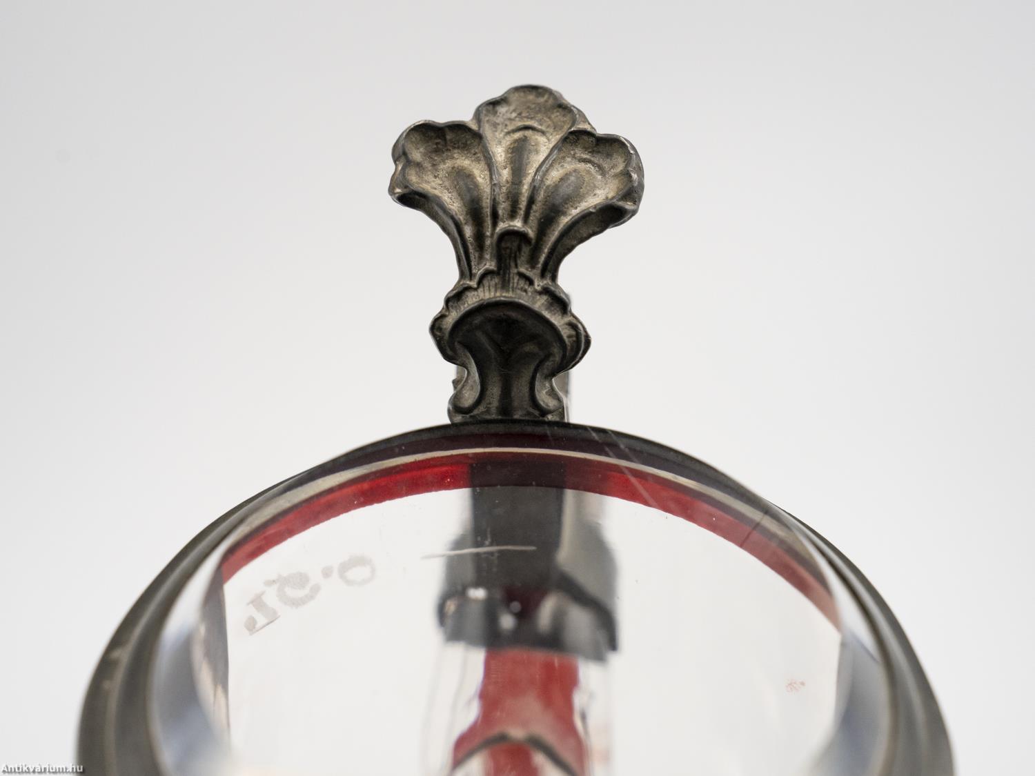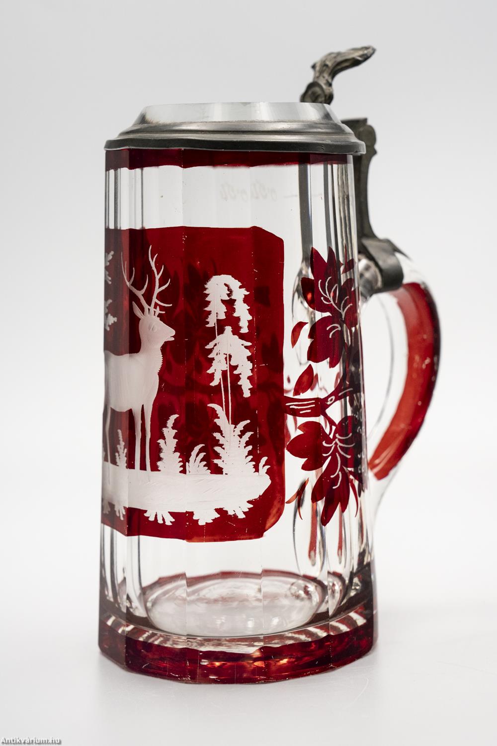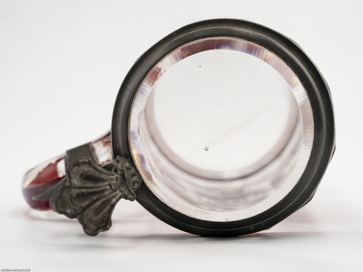 Hibátlan állapotú, fújt és kézzel formázott, valamint csiszolt és gravírozott biedermeier ónfedeles bordó üveg kupa a 19. század második feléből. Überfang technikával készített, külső bordó rétegéből szőlőlevél ornamentikás és erdei jelenetet (szarvast) ábrázoló visszacsiszolásokkal. A fogójánál űrmérték-hitelesítés látható. Talpa simára csiszolt.