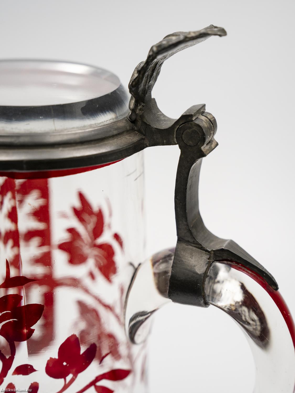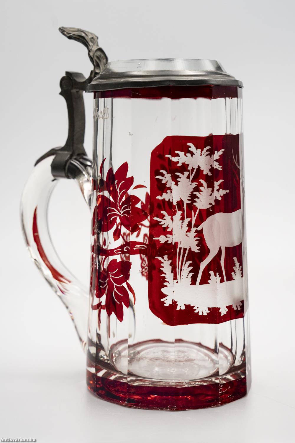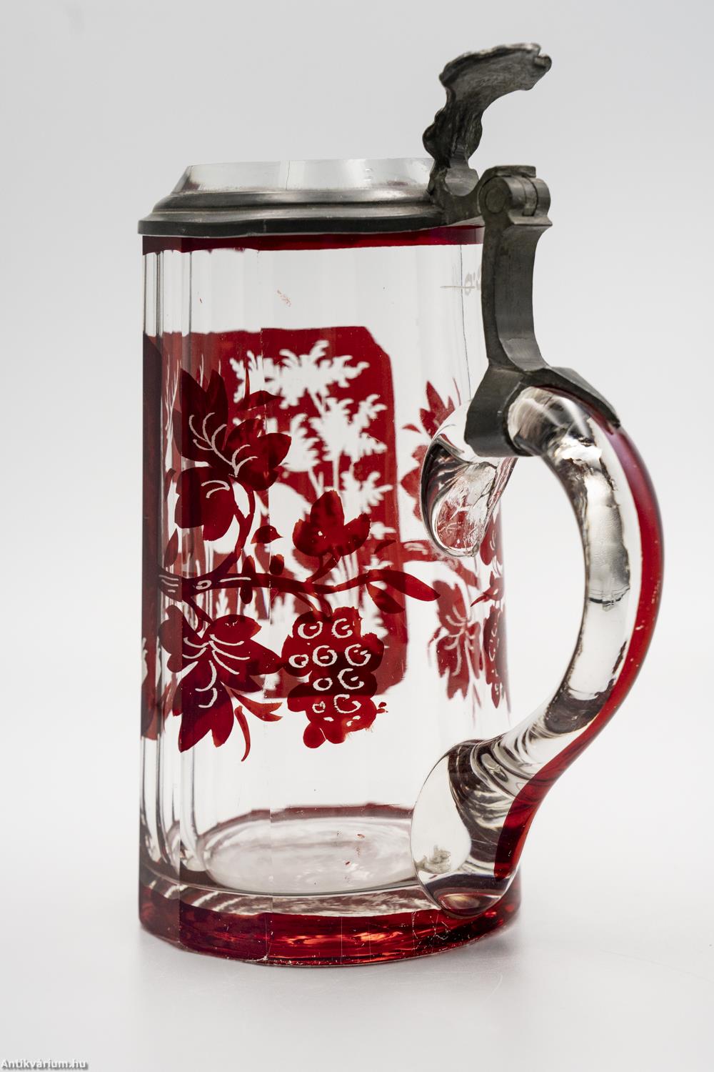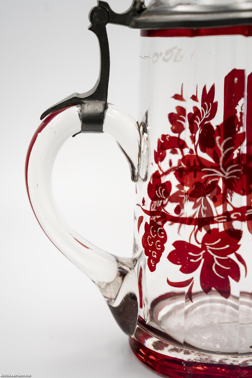Hibátlan állapotú, fújt és kézzel formázott, valamint csiszolt és gravírozott biedermeier ónfedeles bordó üveg kupa a 19. század második feléből. Überfang technikával készített, külső bordó rétegéből szőlőlevél ornamentikás és erdei jelenetet (szarvast) ábrázoló visszacsiszolásokkal. A fogójánál űrmérték-hitelesítés látható. Talpa simára csiszolt.