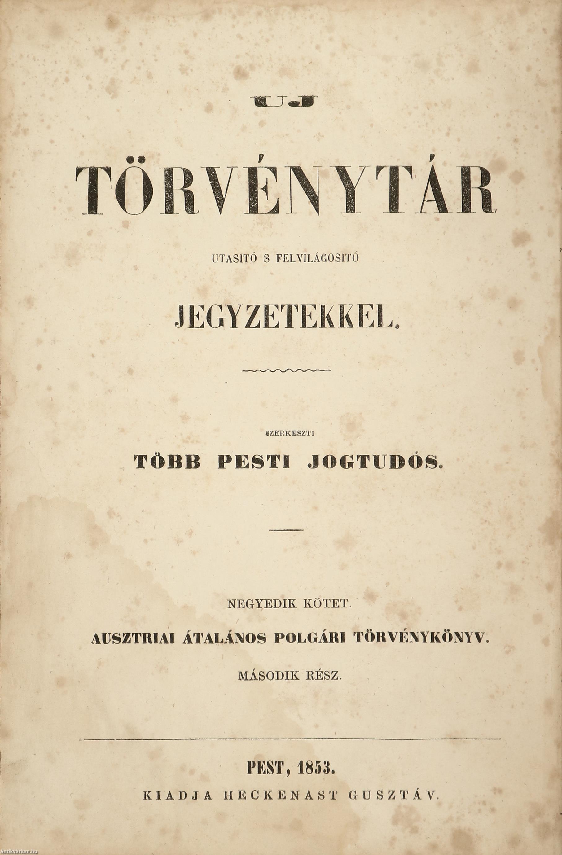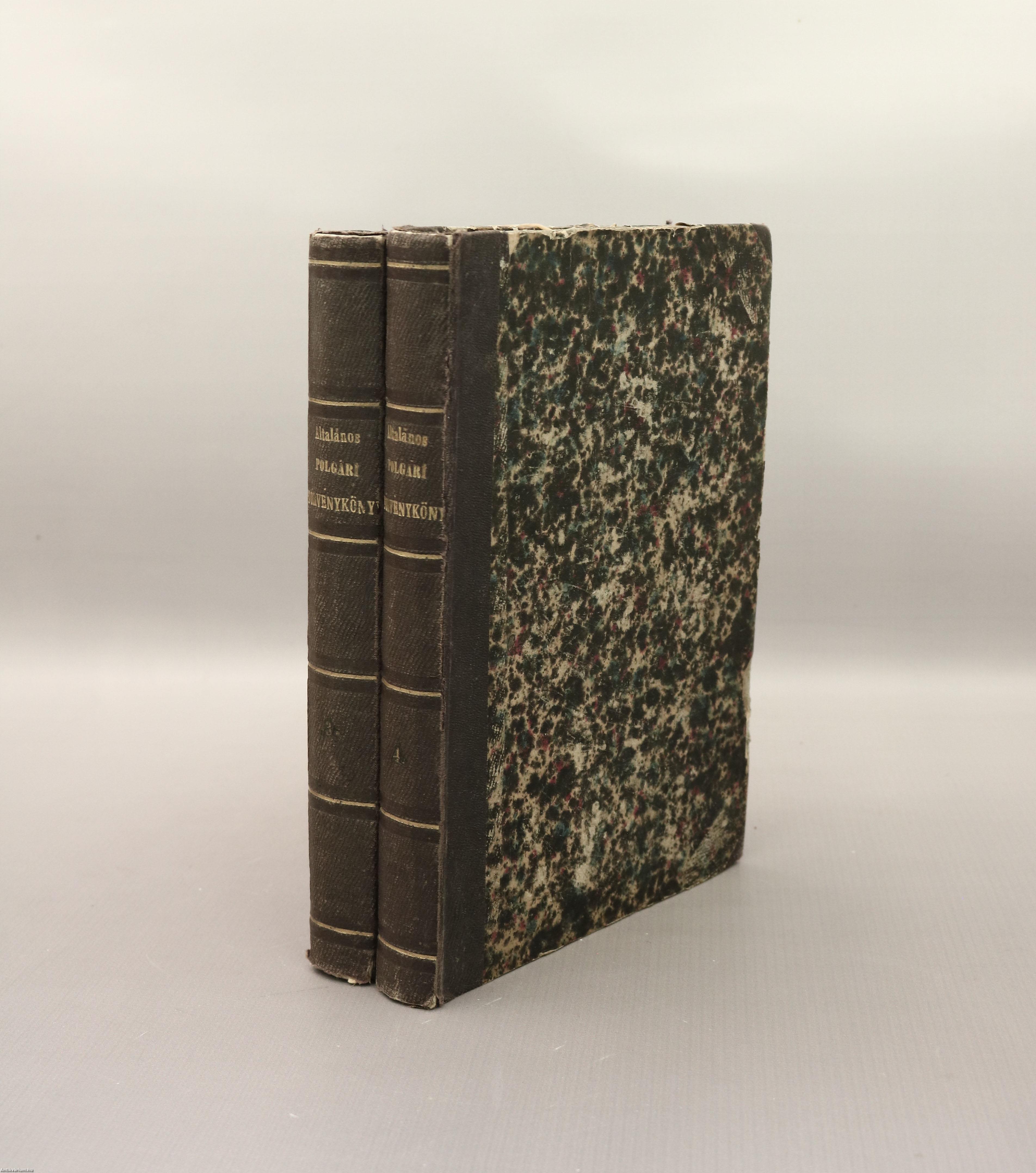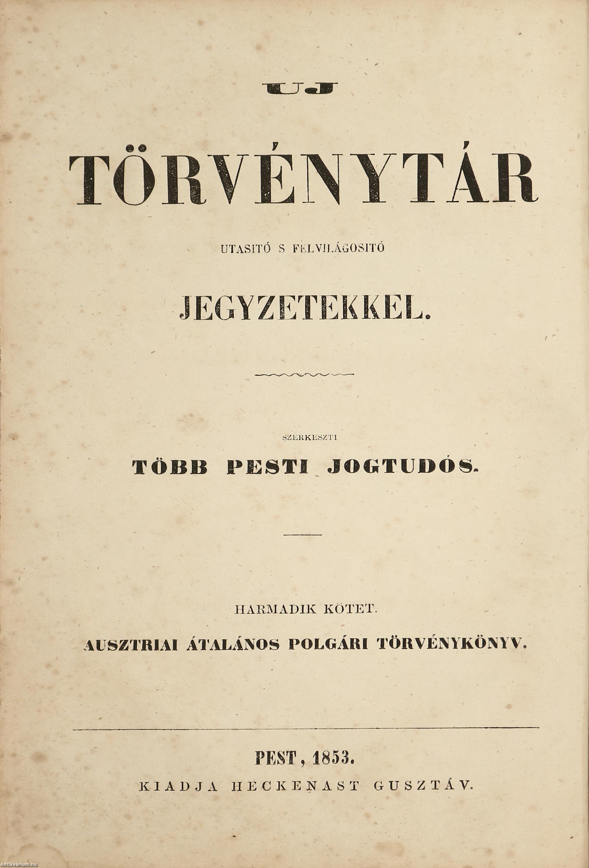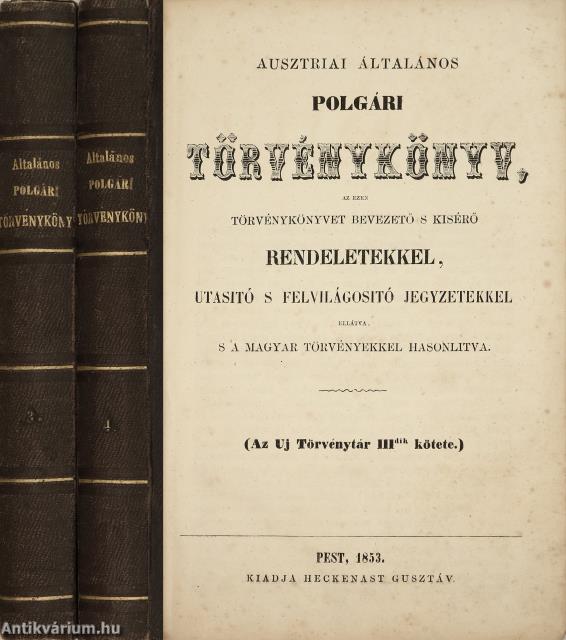 Uj törvénytár utasitó s felvilágositó jegyzetekkel. No.: 3-4. sz. Szerkeszti több pesti jogtudós. Ausztriai általános polgári törvénykönyv, az ezen törvénykönyvet bevezető s kísérő rendeletekkel, utasitó és felvilágositó jegyzetekkel ellátva, s a magyar törvényekkel hasonitva I-II. Bevezetéssel kiegészített kötetek. Az előzéklapokon tollal írt tulajdonosi bejegyzés, az I. kötet előzéklapján ceruzával írt megjegyzés látható. A II. kötet címfedél felőli előzéklapja hiányos. Nyomattak Landerer és Heckenastnál, Pesten. Korabeli félvászon kötésben lévő kötetek, feliratozatlan, színes, mintás címfedéllel (a II. kötet címfedele és hátlapja sérült), aranyozott feliratozású könyvgerinccel, néhány foltos lappal, néhány oldalon ceruzás aláhúzással és jelöléssel, mintázott lapélekkel, feliratozatlan, színes, mintás hátlappal. Egy részlet a könyvből: "A polgári jog fogalma. 1. §. Az álladalomban a polgári jog azon törvények összegéből áll, mellyek szerint az álladalom lakosainak egymás közötti magán-jogai és kötelességei meghatároztatnak. [...] 2. §. Mihelyt valamelly törvény kellőleg kihirdettetett, senki sem mentheti magát avval, hogy az neki tudomására nem esett.".