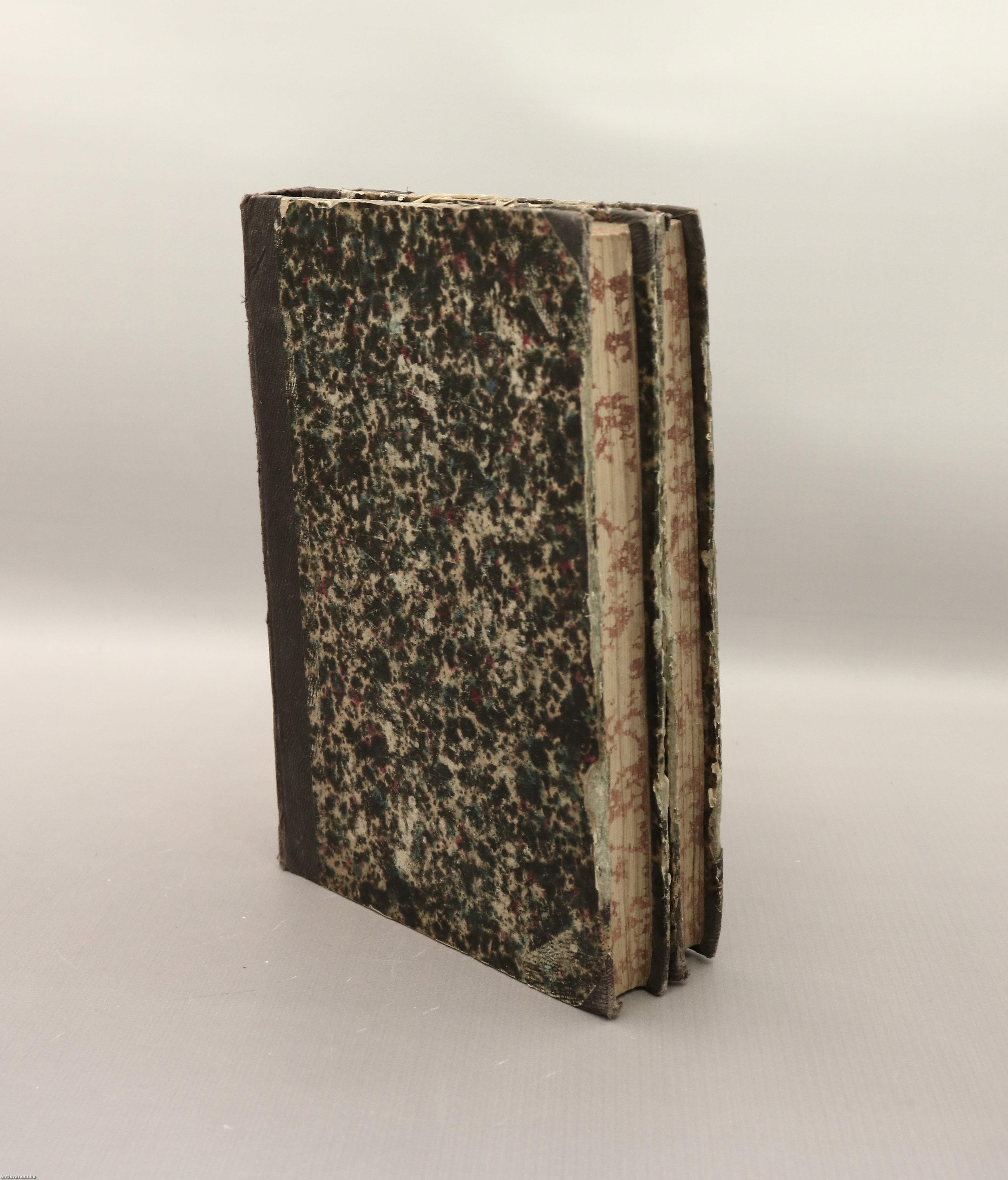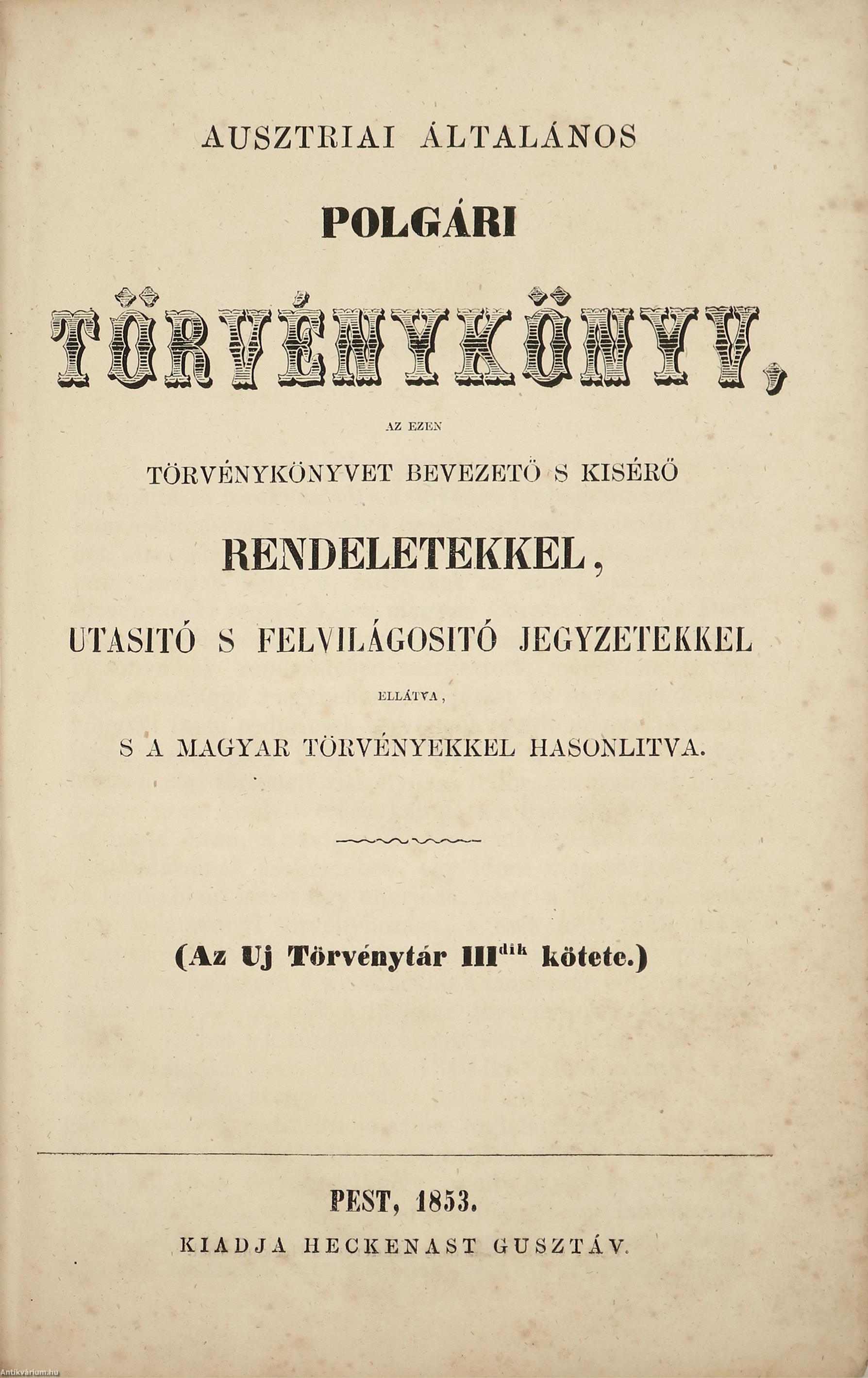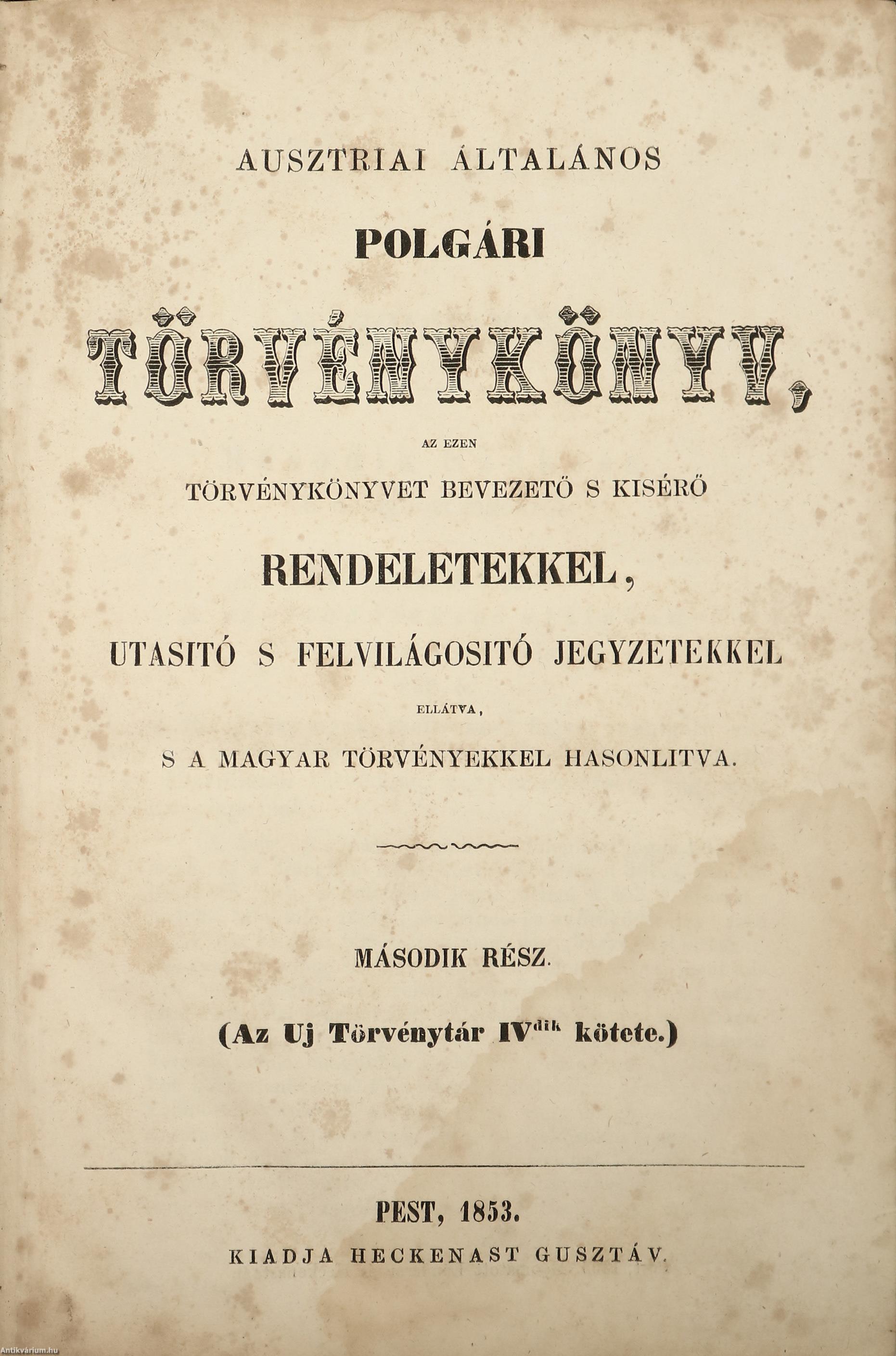 Uj törvénytár utasitó s felvilágositó jegyzetekkel. No.: 3-4. sz. Szerkeszti több pesti jogtudós. Ausztriai általános polgári törvénykönyv, az ezen törvénykönyvet bevezető s kísérő rendeletekkel, utasitó és felvilágositó jegyzetekkel ellátva, s a magyar törvényekkel hasonitva I-II. Bevezetéssel kiegészített kötetek. Az előzéklapokon tollal írt tulajdonosi bejegyzés, az I. kötet előzéklapján ceruzával írt megjegyzés látható. A II. kötet címfedél felőli előzéklapja hiányos. Nyomattak Landerer és Heckenastnál, Pesten. Korabeli félvászon kötésben lévő kötetek, feliratozatlan, színes, mintás címfedéllel (a II. kötet címfedele és hátlapja sérült), aranyozott feliratozású könyvgerinccel, néhány foltos lappal, néhány oldalon ceruzás aláhúzással és jelöléssel, mintázott lapélekkel, feliratozatlan, színes, mintás hátlappal. Egy részlet a könyvből: "A polgári jog fogalma. 1. §. Az álladalomban a polgári jog azon törvények összegéből áll, mellyek szerint az álladalom lakosainak egymás közötti magán-jogai és kötelességei meghatároztatnak. [...] 2. §. Mihelyt valamelly törvény kellőleg kihirdettetett, senki sem mentheti magát avval, hogy az neki tudomására nem esett.".