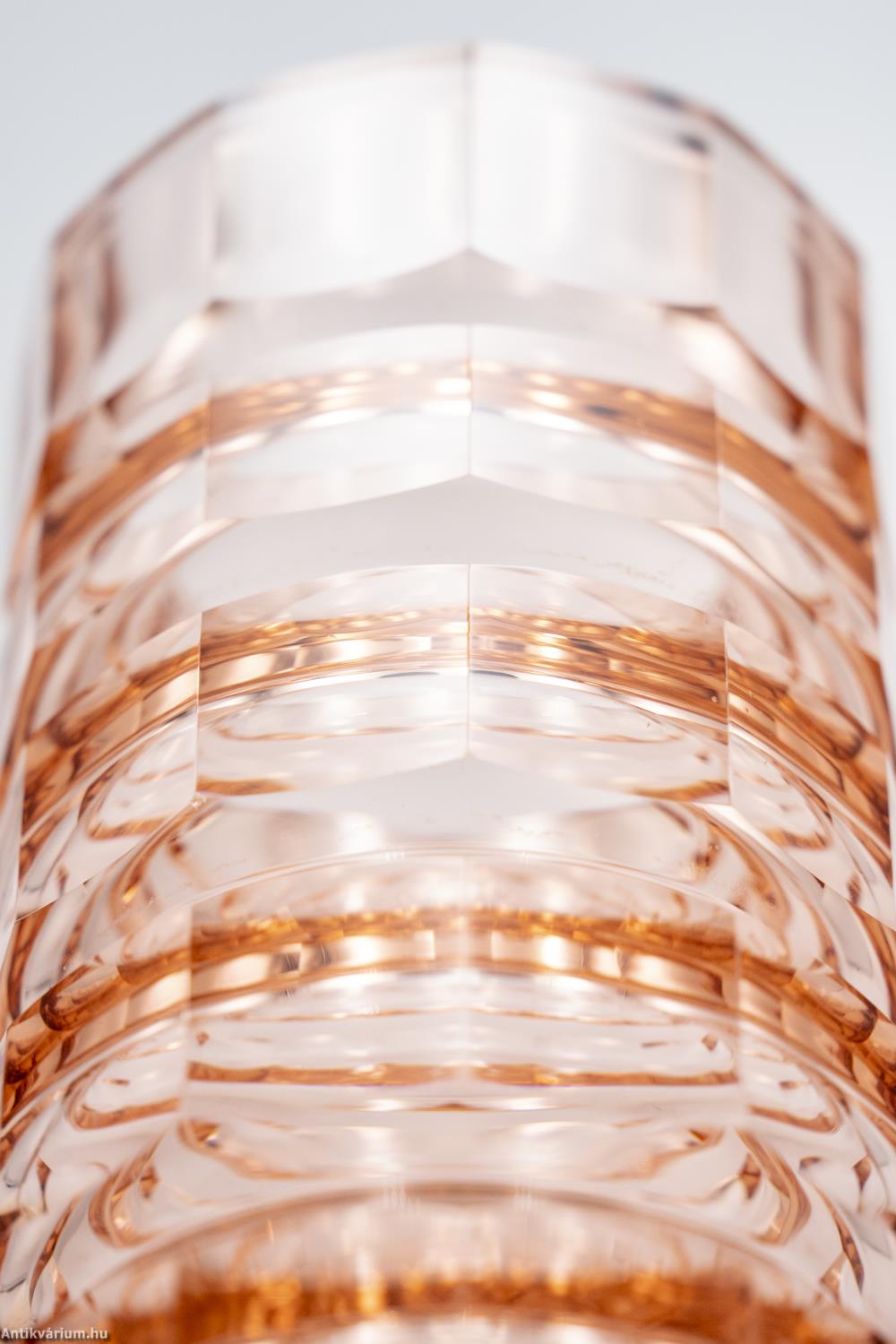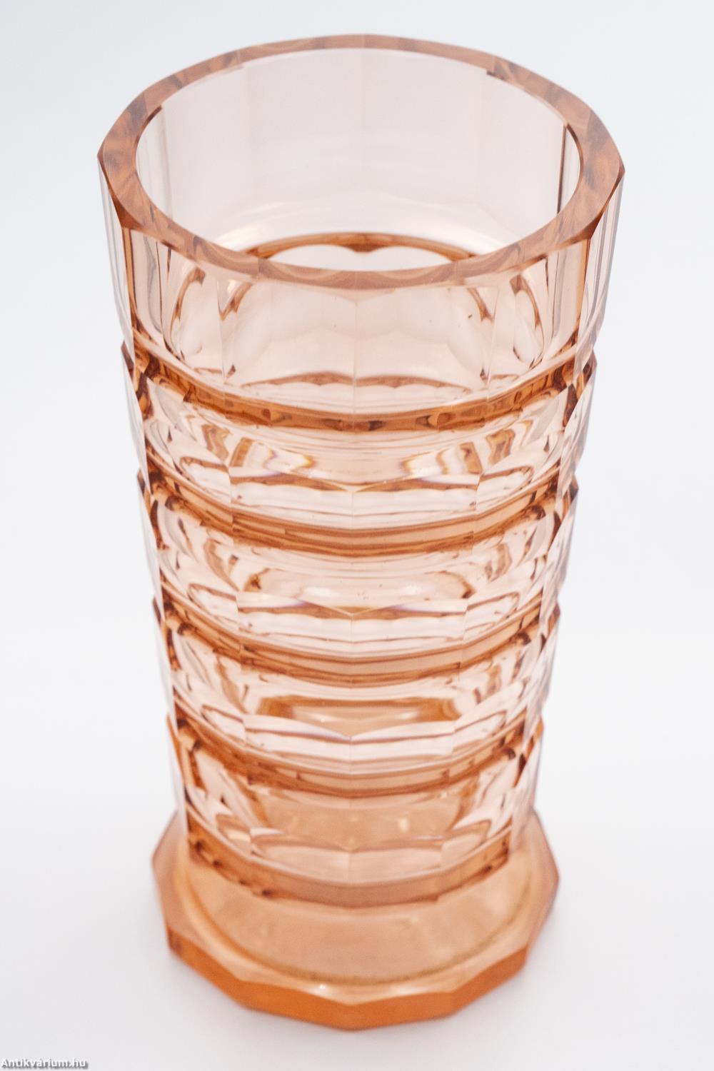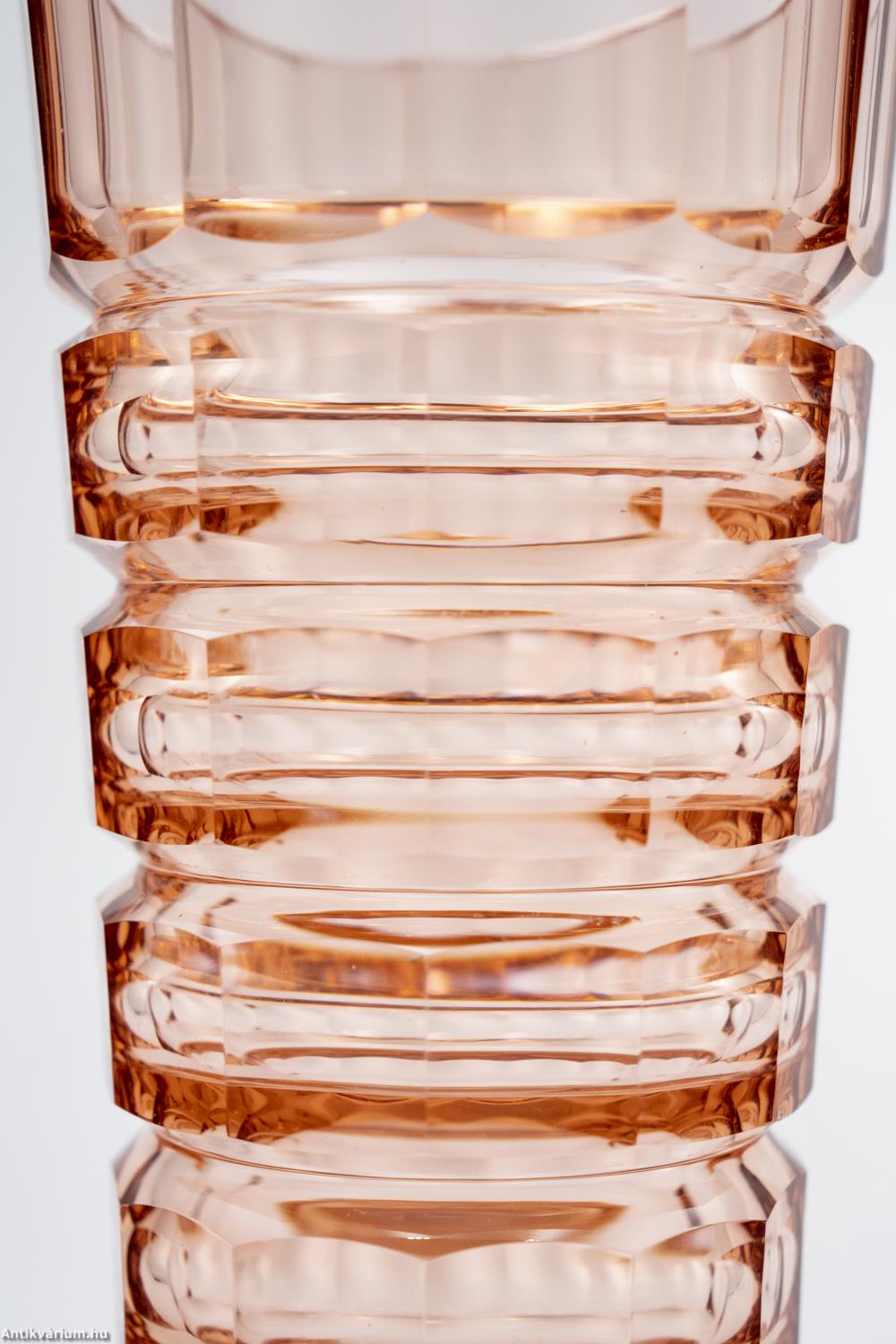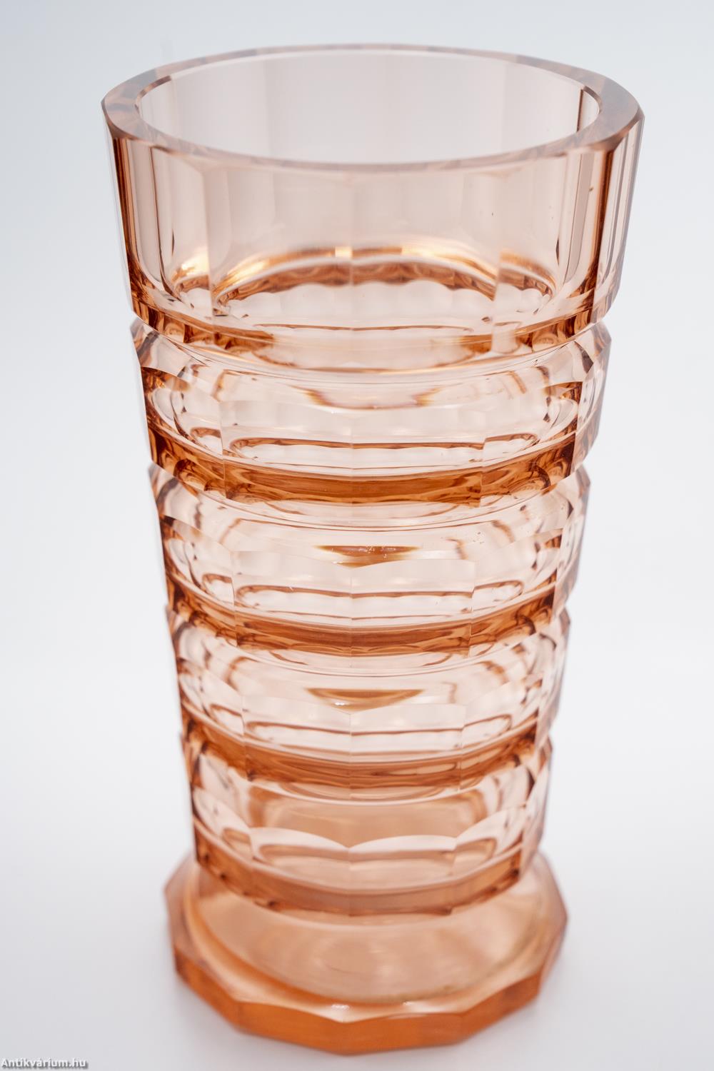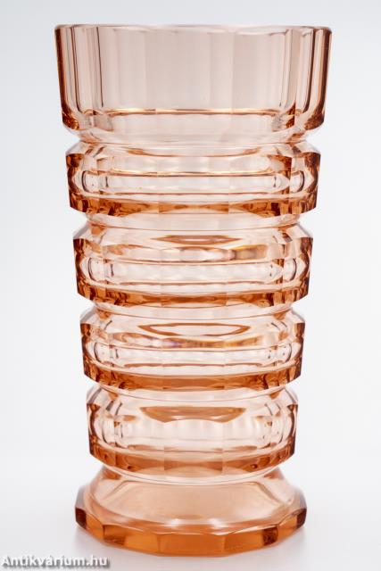 Hibátlan állapotú, fújt és kézzel formázott, valamint kézzel csiszolt art deco Moser üveg váza Josef Hoffmann tervei alapján. Vastagfalú, nagy súlyú, narancs színű üvegből készült művészi üveg váza. Vízszintesen sávszerűen tagolt, négyosztásos oldalát sík csiszolt laptagolás díszíti, amely a legegyszerűbb geometriai formák alkalmazására: a négyszögre és annak különböző méretű megjelenítésére épül. Talpa lapra csiszolt. A kor stílusát és a Moser csiszolás egyedi jellemzőit megjelenítő üveg váza az 1920 - as években készült. A Moser üveggyárban az 1920-as években rendkívül gyümölcsöző együttműködés kezdődött Josef Hoffmann tervezővel (Pirnitz 1870–1956 Bécs, a Wiener Werkstatte társalapítója), amelynek során az uralkodó art deco esztétika jegyeit magán viselő elegáns üvegáruk készültek, kihangsúlyozva az egyenes, leegyszerűsített vonalvezetést és modern formát, valamint az erős, tiszta színvilág használatát. Mindezeket tökéletes kivitelezésben.