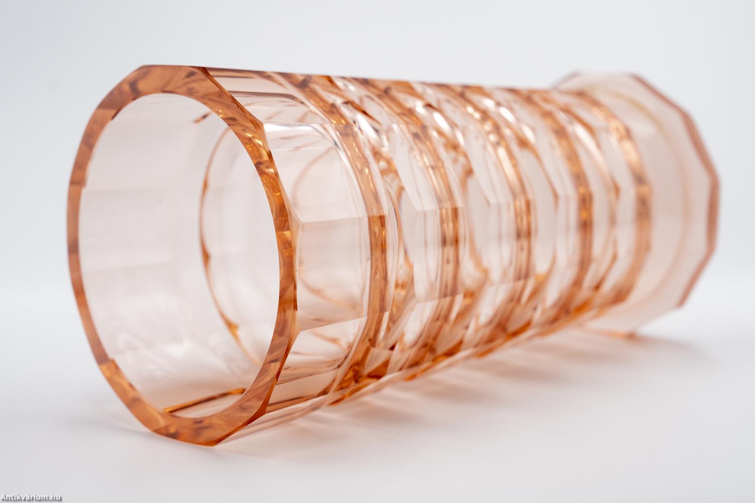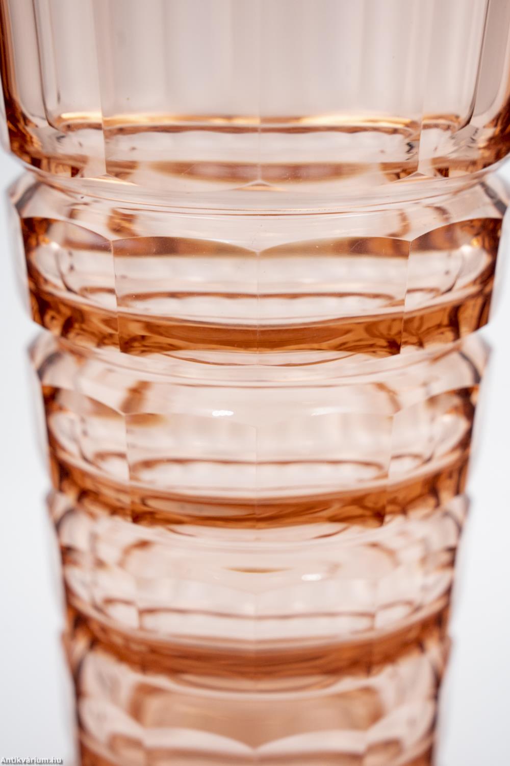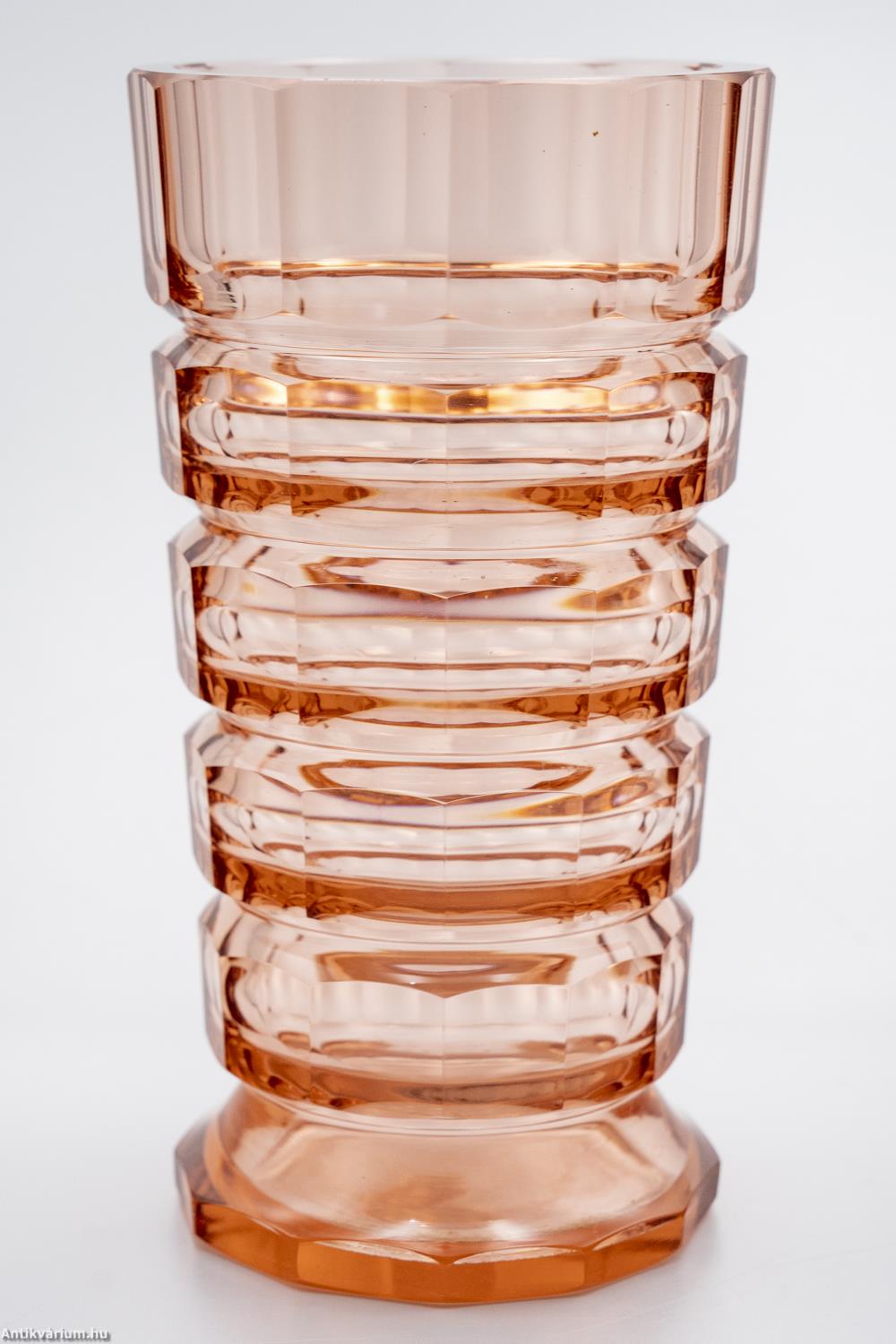Hibátlan állapotú, fújt és kézzel formázott, valamint kézzel csiszolt art deco Moser üveg váza Josef Hoffmann tervei alapján. Vastagfalú, nagy súlyú, narancs színű üvegből készült művészi üveg váza. Vízszintesen sávszerűen tagolt, négyosztásos oldalát sík csiszolt laptagolás díszíti, amely a legegyszerűbb geometriai formák alkalmazására: a négyszögre és annak különböző méretű megjelenítésére épül. Talpa lapra csiszolt. A kor stílusát és a Moser csiszolás egyedi jellemzőit megjelenítő üveg váza az 1920 - as években készült. A Moser üveggyárban az 1920-as években rendkívül gyümölcsöző együttműködés kezdődött Josef Hoffmann tervezővel (Pirnitz 1870–1956 Bécs, a Wiener Werkstatte társalapítója), amelynek során az uralkodó art deco esztétika jegyeit magán viselő elegáns üvegáruk készültek, kihangsúlyozva az egyenes, leegyszerűsített vonalvezetést és modern formát, valamint az erős, tiszta színvilág használatát. Mindezeket tökéletes kivitelezésben.