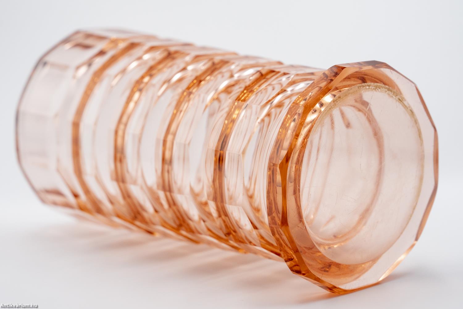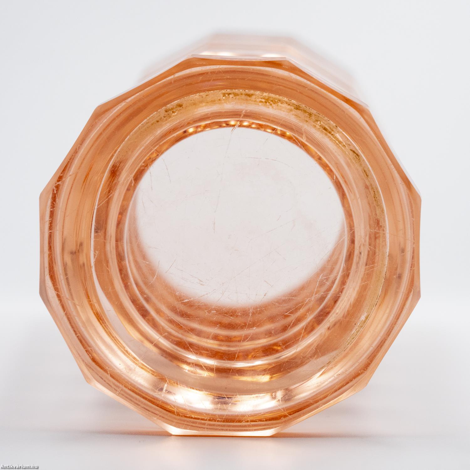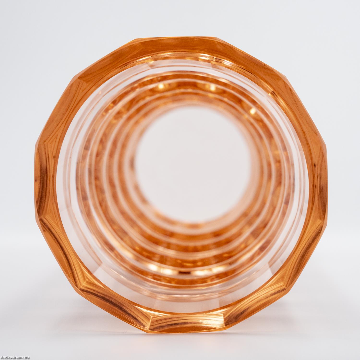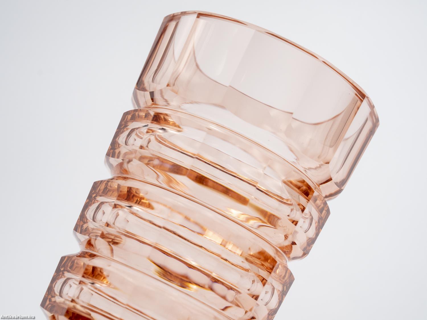 Hibátlan állapotú, fújt és kézzel formázott, valamint kézzel csiszolt art deco Moser üveg váza Josef Hoffmann tervei alapján. Vastagfalú, nagy súlyú, narancs színű üvegből készült művészi üveg váza. Vízszintesen sávszerűen tagolt, négyosztásos oldalát sík csiszolt laptagolás díszíti, amely a legegyszerűbb geometriai formák alkalmazására: a négyszögre és annak különböző méretű megjelenítésére épül. Talpa lapra csiszolt. A kor stílusát és a Moser csiszolás egyedi jellemzőit megjelenítő üveg váza az 1920 - as években készült. A Moser üveggyárban az 1920-as években rendkívül gyümölcsöző együttműködés kezdődött Josef Hoffmann tervezővel (Pirnitz 1870–1956 Bécs, a Wiener Werkstatte társalapítója), amelynek során az uralkodó art deco esztétika jegyeit magán viselő elegáns üvegáruk készültek, kihangsúlyozva az egyenes, leegyszerűsített vonalvezetést és modern formát, valamint az erős, tiszta színvilág használatát. Mindezeket tökéletes kivitelezésben.