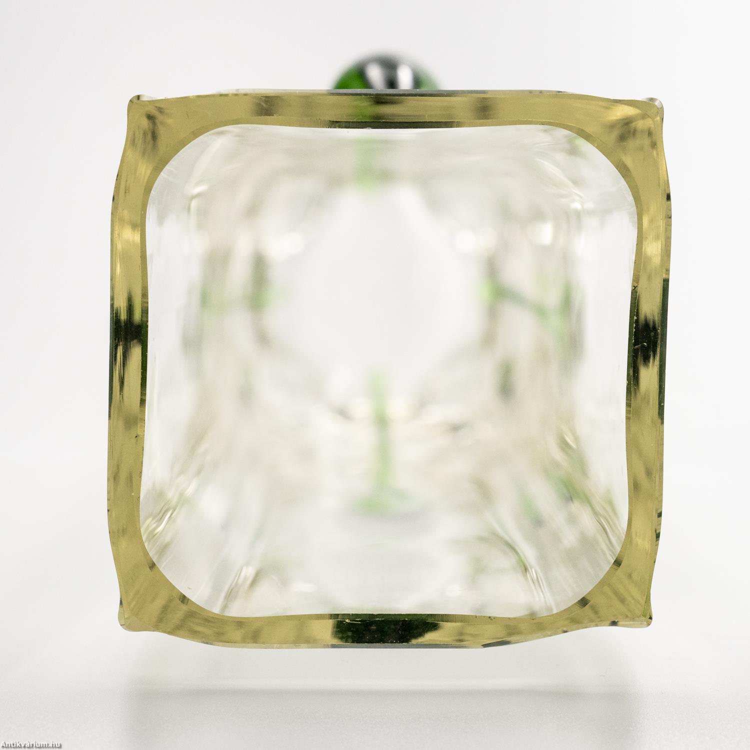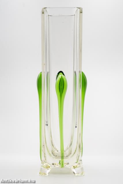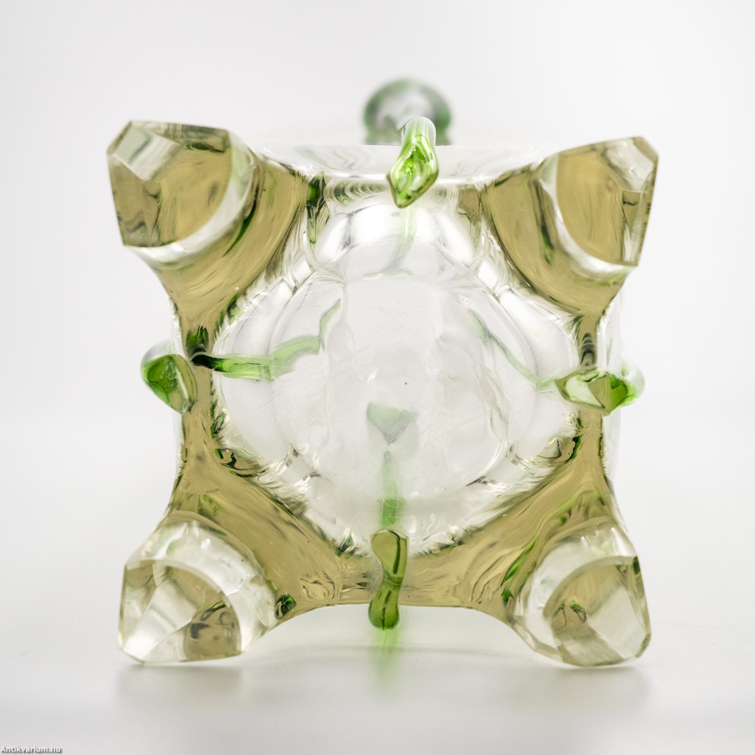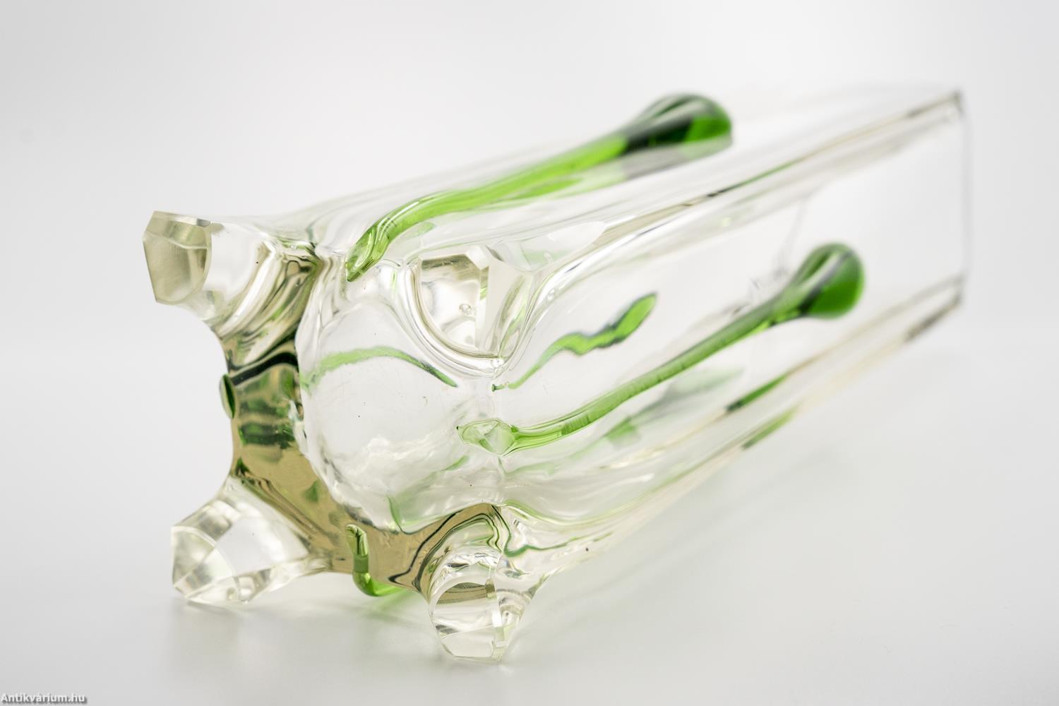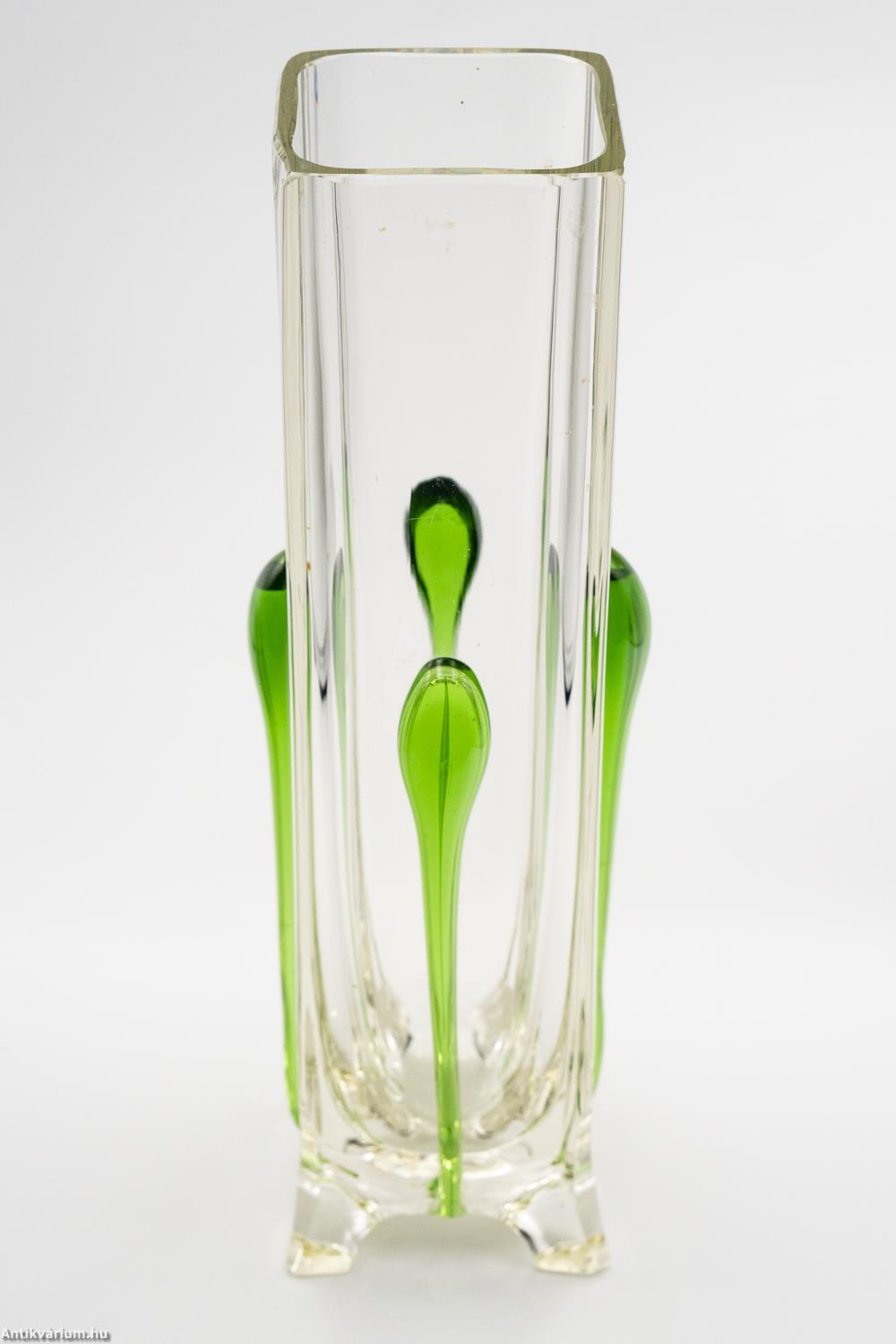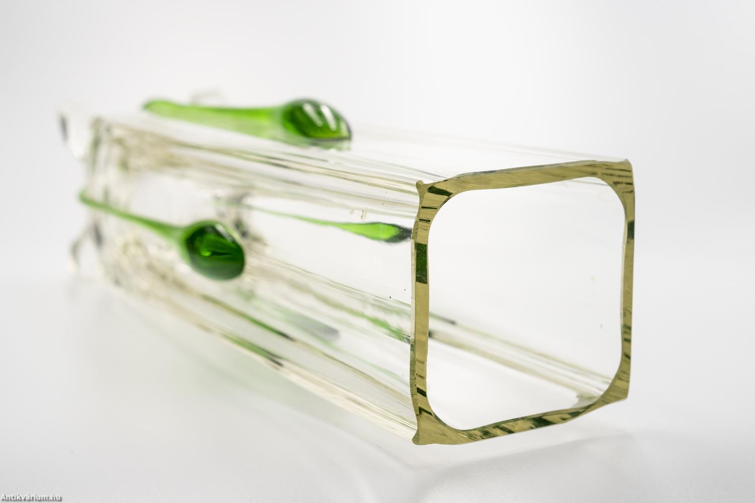 Fújt és kézzel formázott, nagy méretű négyszögletű bécsi üveg váza a 20. század elejéről. Színtelen áttetsző üvegrétegének mind a négy oldalát egy-egy élénkzöld színű nyújtott csepp alakú üveg rátét díszíti. A magas üveg váza különleges módon négy darab, szinte faragott hatású üveglábon áll, amelyeknek talprészei lapra csiszoltak. Modern, letisztult formavilágú alkotás, szolid, mégis rendkívül ötletes és látványos dekor rátétekkel párosítva.