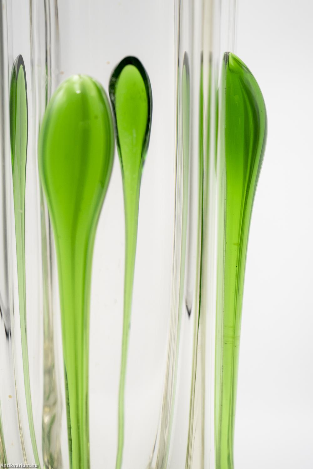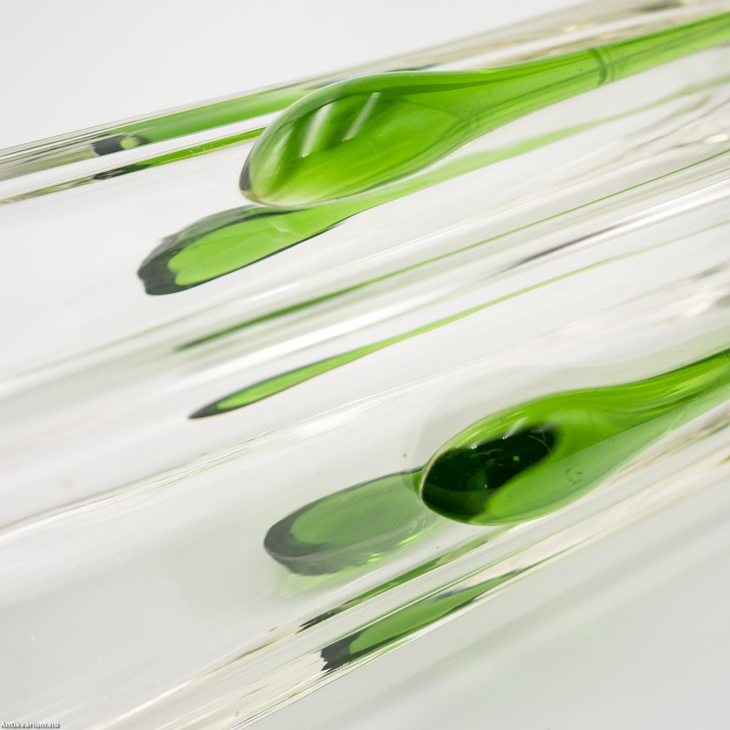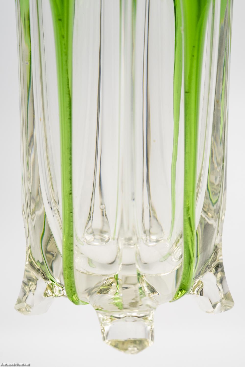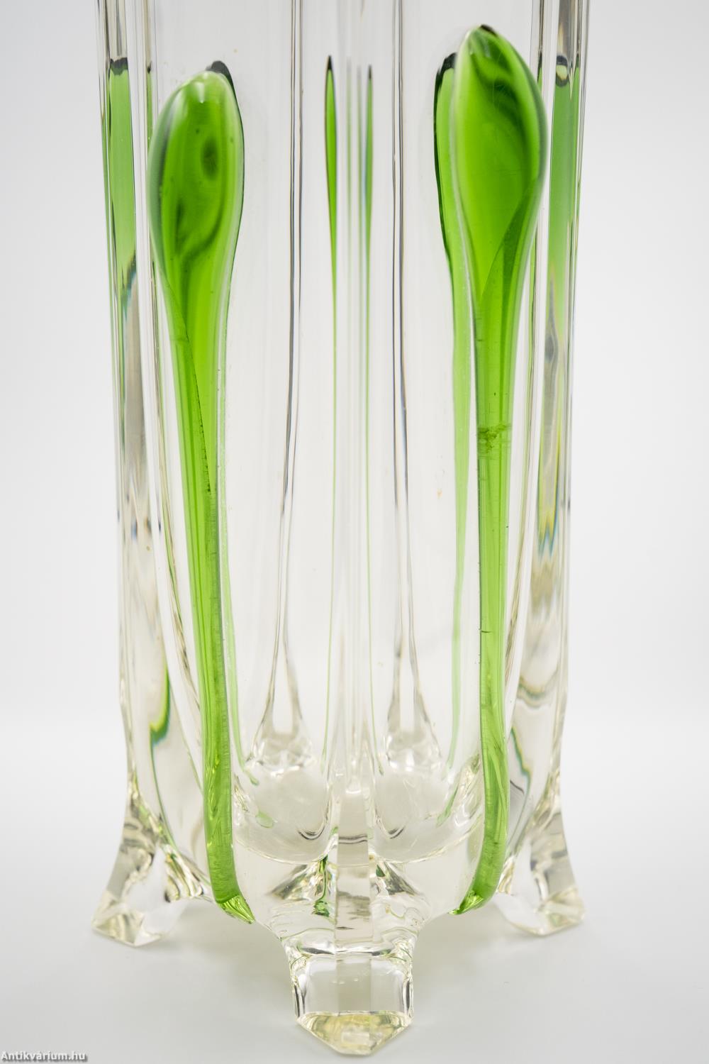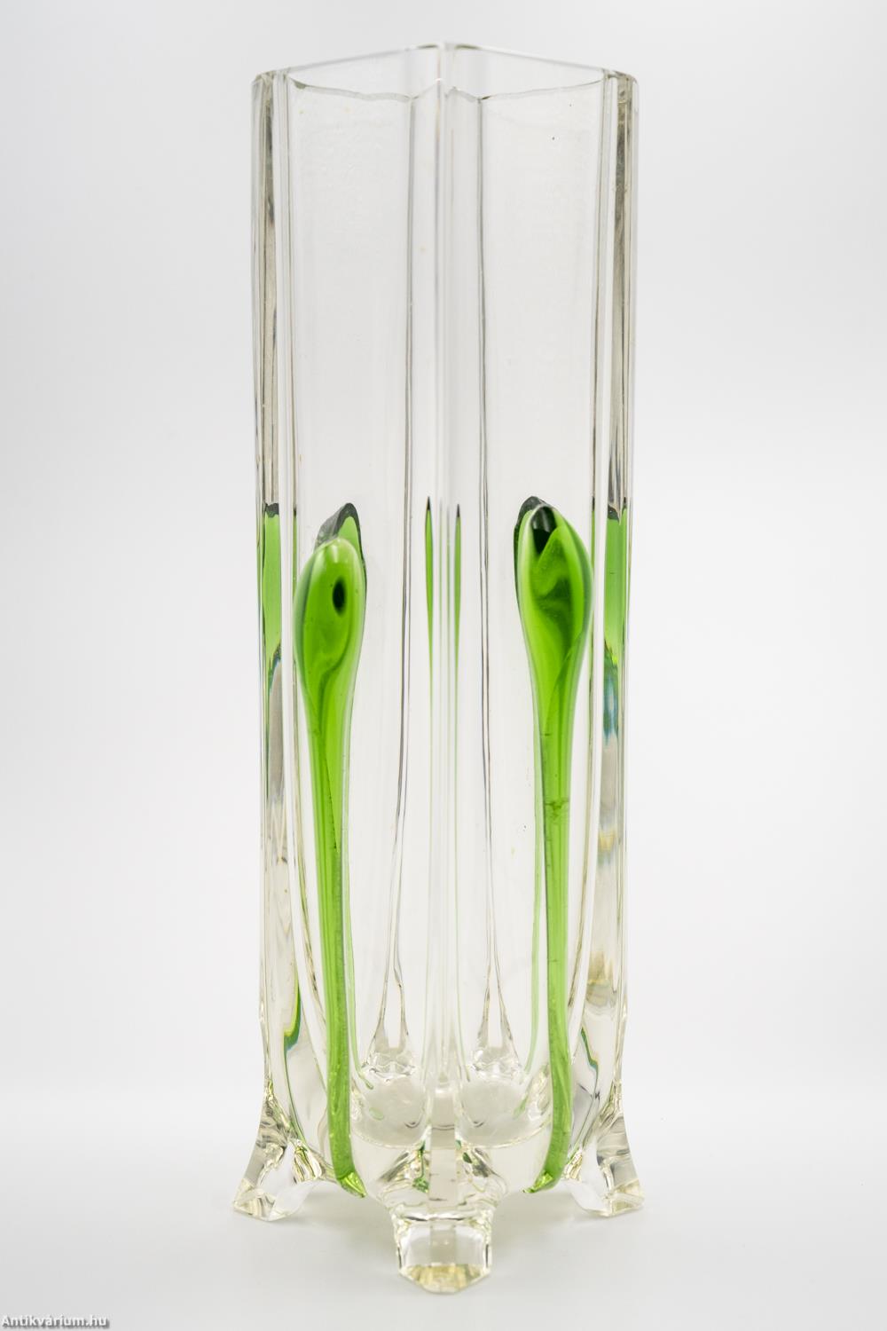 Fújt és kézzel formázott, nagy méretű négyszögletű bécsi üveg váza a 20. század elejéről. Színtelen áttetsző üvegrétegének mind a négy oldalát egy-egy élénkzöld színű nyújtott csepp alakú üveg rátét díszíti. A magas üveg váza különleges módon négy darab, szinte faragott hatású üveglábon áll, amelyeknek talprészei lapra csiszoltak. Modern, letisztult formavilágú alkotás, szolid, mégis rendkívül ötletes és látványos dekor rátétekkel párosítva.