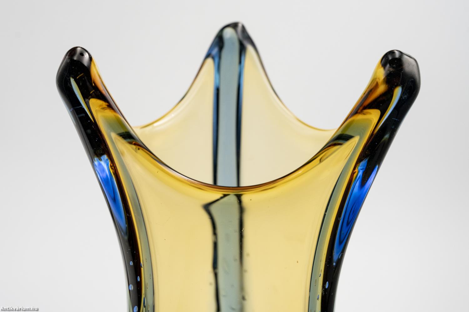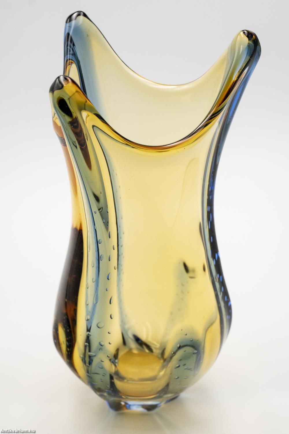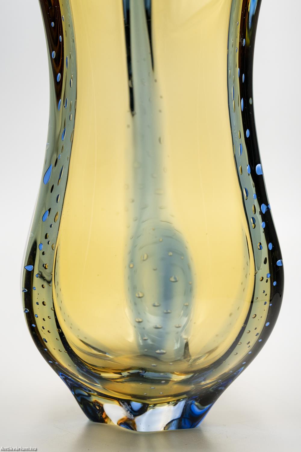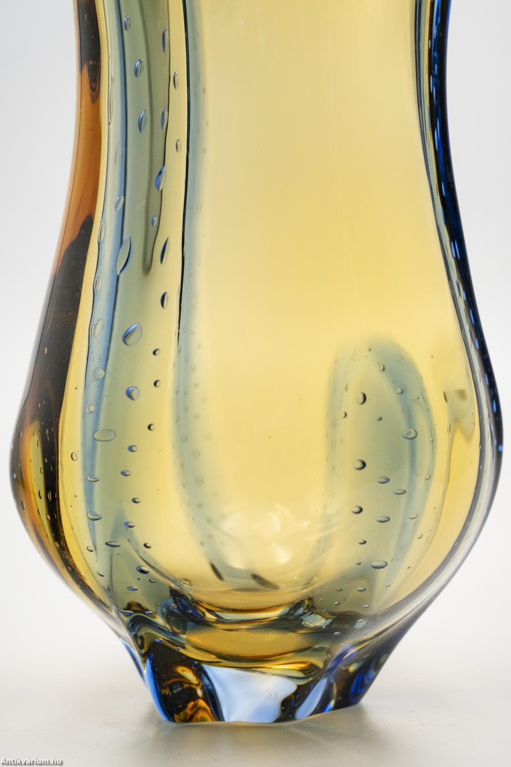Hibátlan állapotú, fújt és kézzel formázott Karel Zemek által a Mstisov ( Novy Bor ) Üveggyár számára tervezett " Hana" kollekcióba tartozó üveg váza az 1960- as évekből. (modellszám 53647/30) Ez a sommerso ( eltérő színű üvegrétegek egymásba olvasztása ) és bullicante technikával ( szabályozott méretű és elhelyezésű buborékokkal díszített üvegmegmunkálási eljárás ) készített nagy méretű, organikus alakú üveg váza vastagfalú borostyán színű üvegből készült, amelyet három oldalról kobaltkék színű, hosszanti elrendezésű üvegbetétek díszítenek. Talpa lapra csiszolt. Dekoratív, több üvegtechnikai eljárást gyönyörűen kombináló művész üveg váza.
