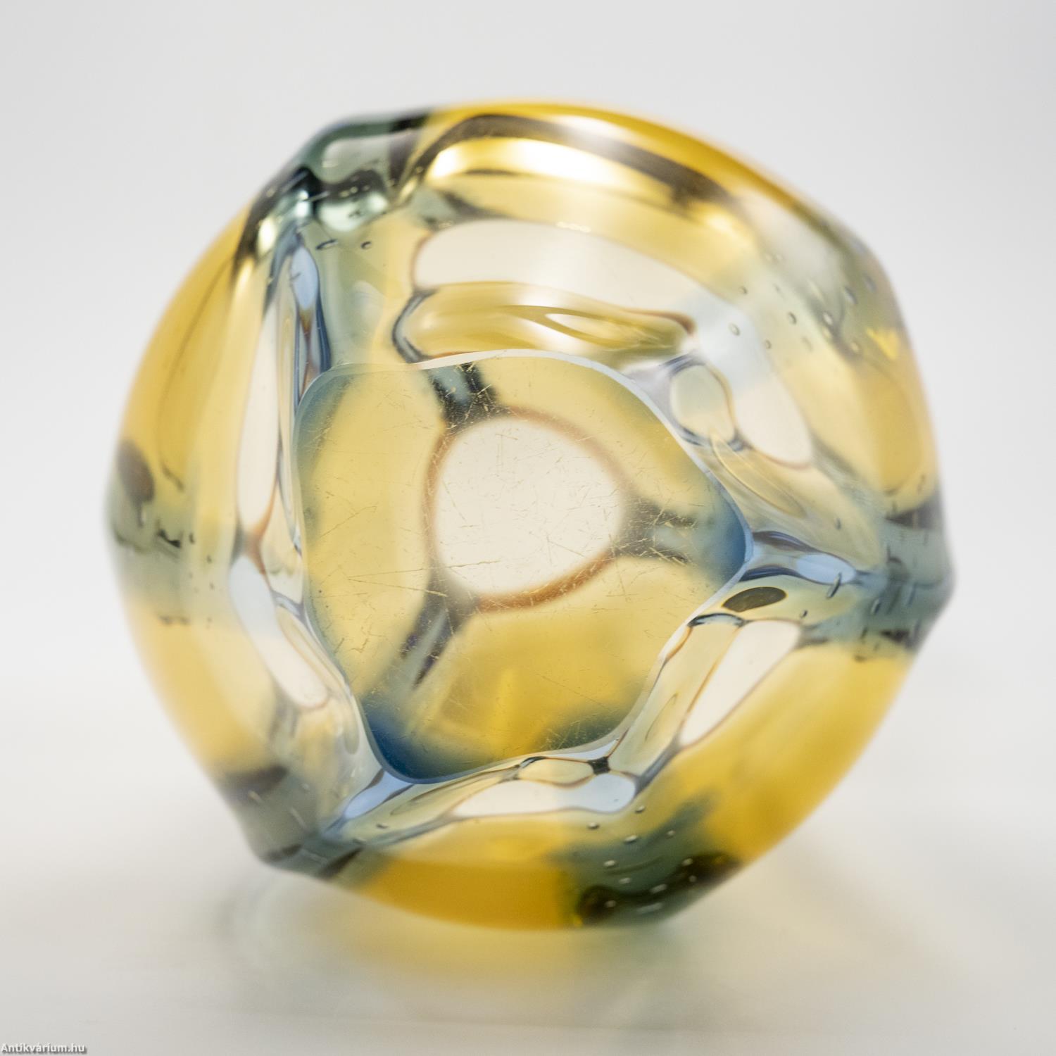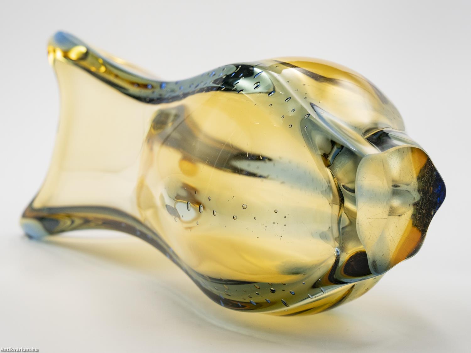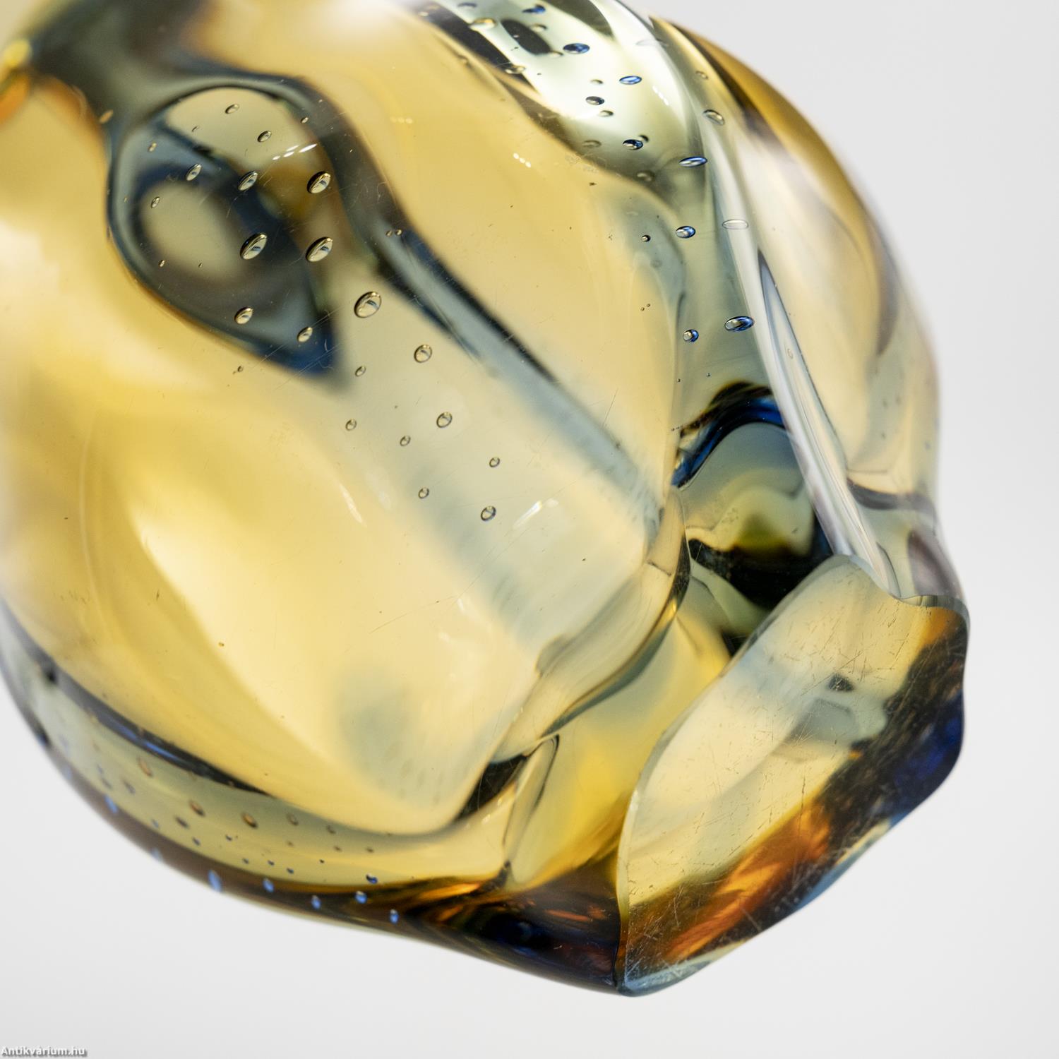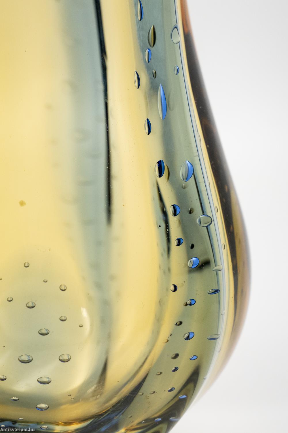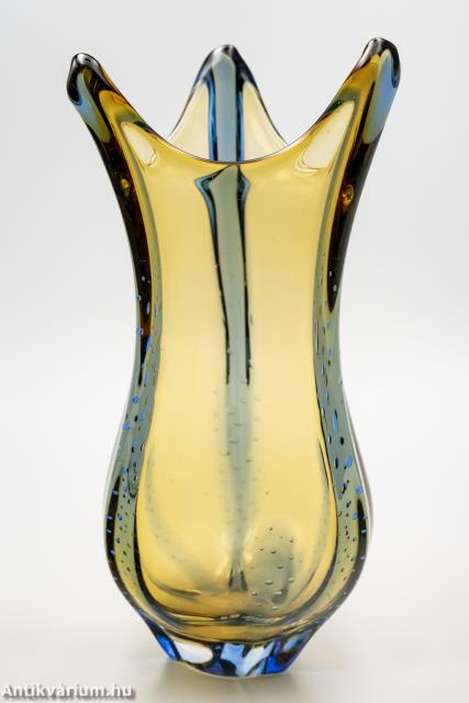 Hibátlan állapotú, fújt és kézzel formázott Karel Zemek által a Mstisov ( Novy Bor ) Üveggyár számára tervezett " Hana" kollekcióba tartozó üveg váza az 1960- as évekből. (modellszám 53647/30) Ez a sommerso ( eltérő színű üvegrétegek egymásba olvasztása ) és bullicante technikával ( szabályozott méretű és elhelyezésű buborékokkal díszített üvegmegmunkálási eljárás ) készített nagy méretű, organikus alakú üveg váza vastagfalú borostyán színű üvegből készült, amelyet három oldalról kobaltkék színű, hosszanti elrendezésű üvegbetétek díszítenek. Talpa lapra csiszolt. Dekoratív, több üvegtechnikai eljárást gyönyörűen kombináló művész üveg váza.