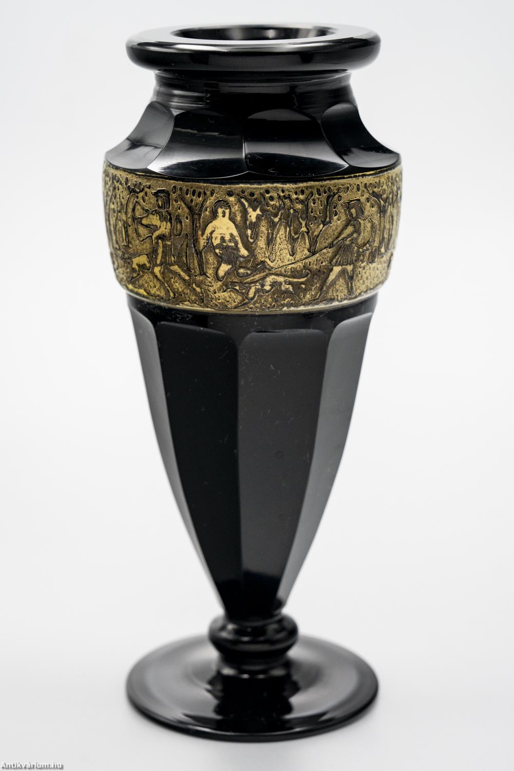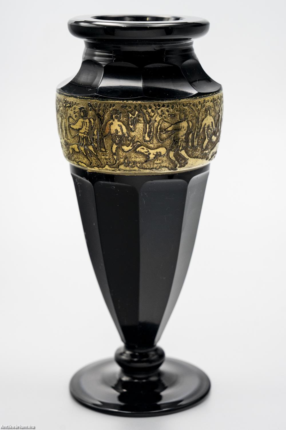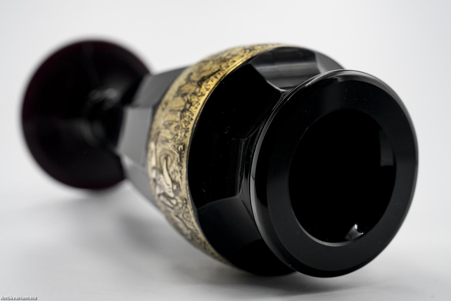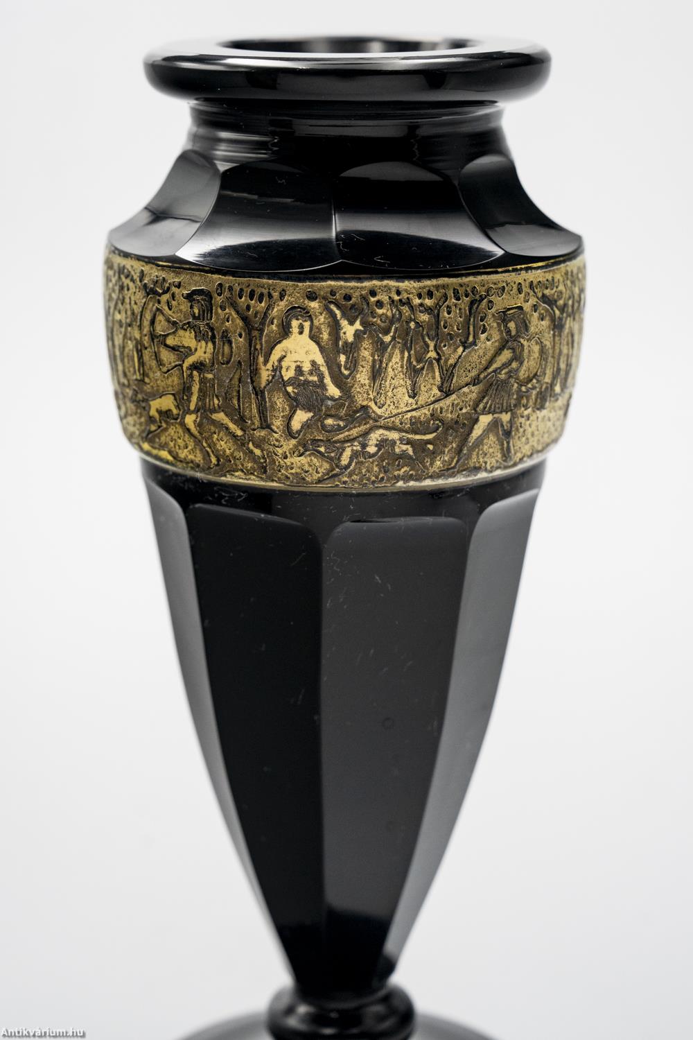 Hibátlan állapotú, fújt és kézzel formázott valamint kézzel csiszolt Moser üveg váza. Art deco stílusú sötét lila színű üvegből készült művészi üveg váza, pereme alatt hibátlan aranyozású, körbefutó, ókori vadászjeleneteket ábrázoló plasztikus frízzel, maratott és csiszolt díszítéssel. Oldalát síkra csiszolt laptagolás díszíti. A kor stílusát és a Moser csiszolás egyedi jellemzőit megjelenítő üveg váza az 1920 - as évekből.