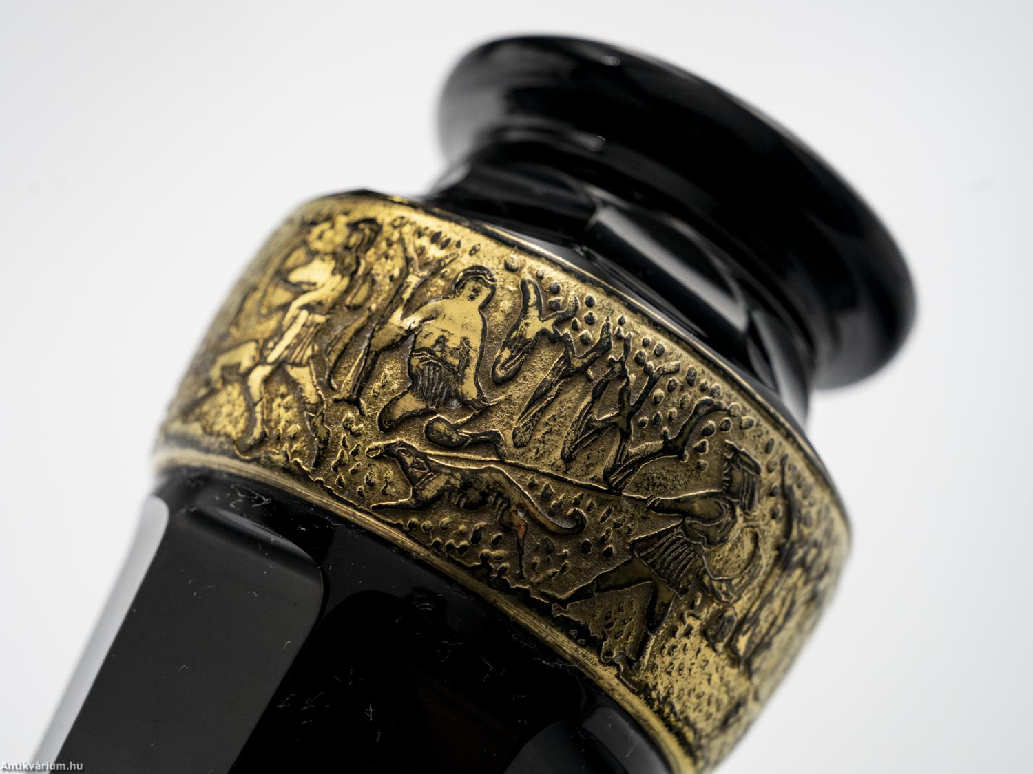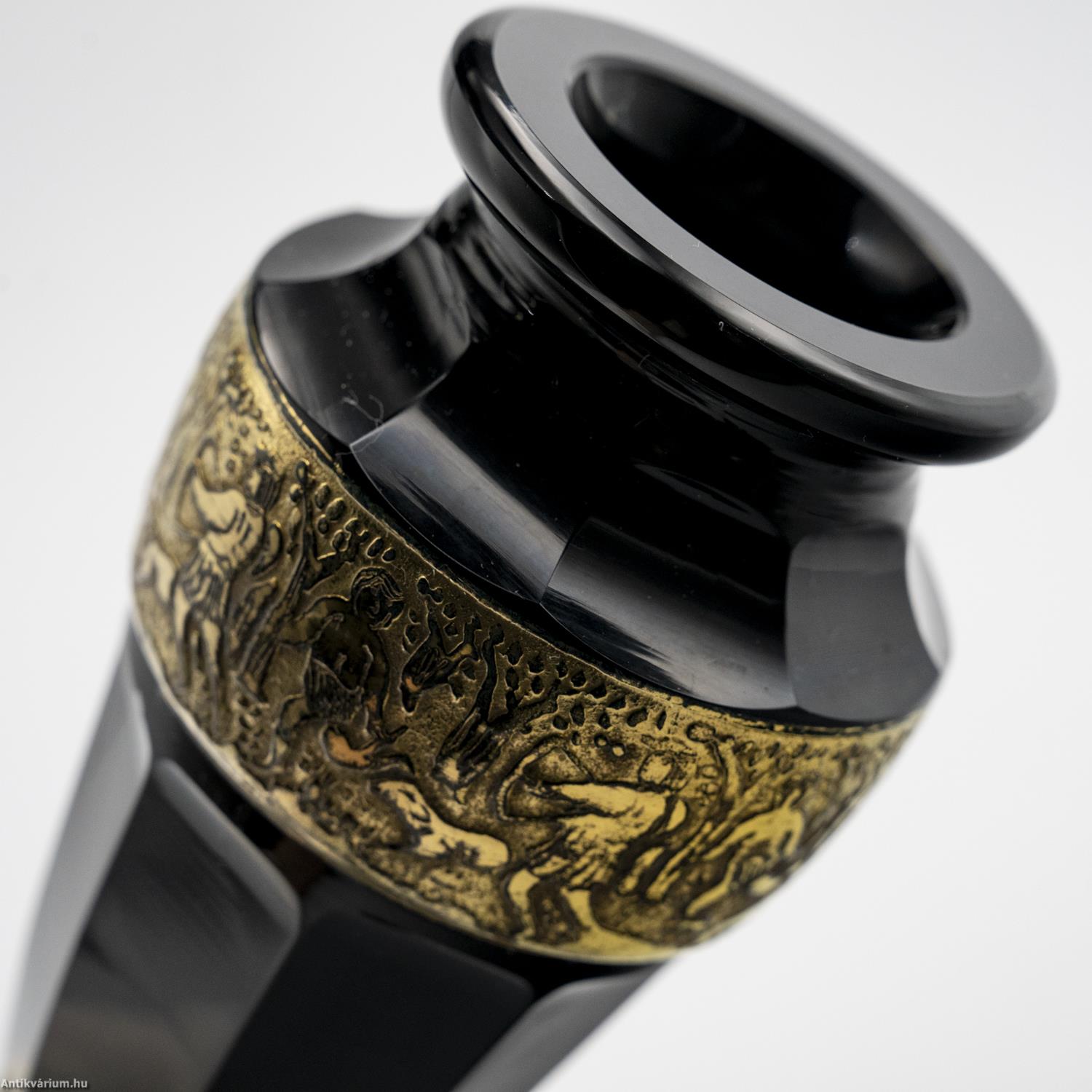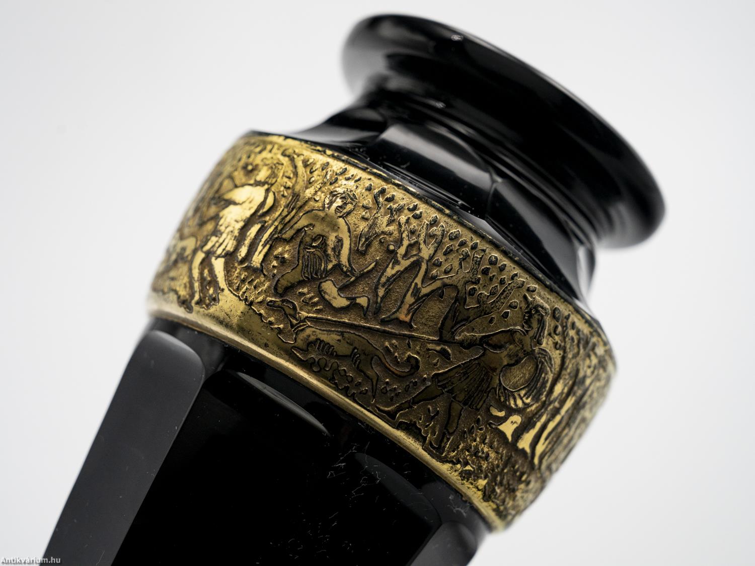 Hibátlan állapotú, fújt és kézzel formázott valamint kézzel csiszolt Moser üveg váza. Art deco stílusú sötét lila színű üvegből készült művészi üveg váza, pereme alatt hibátlan aranyozású, körbefutó, ókori vadászjeleneteket ábrázoló plasztikus frízzel, maratott és csiszolt díszítéssel. Oldalát síkra csiszolt laptagolás díszíti. A kor stílusát és a Moser csiszolás egyedi jellemzőit megjelenítő üveg váza az 1920 - as évekből.