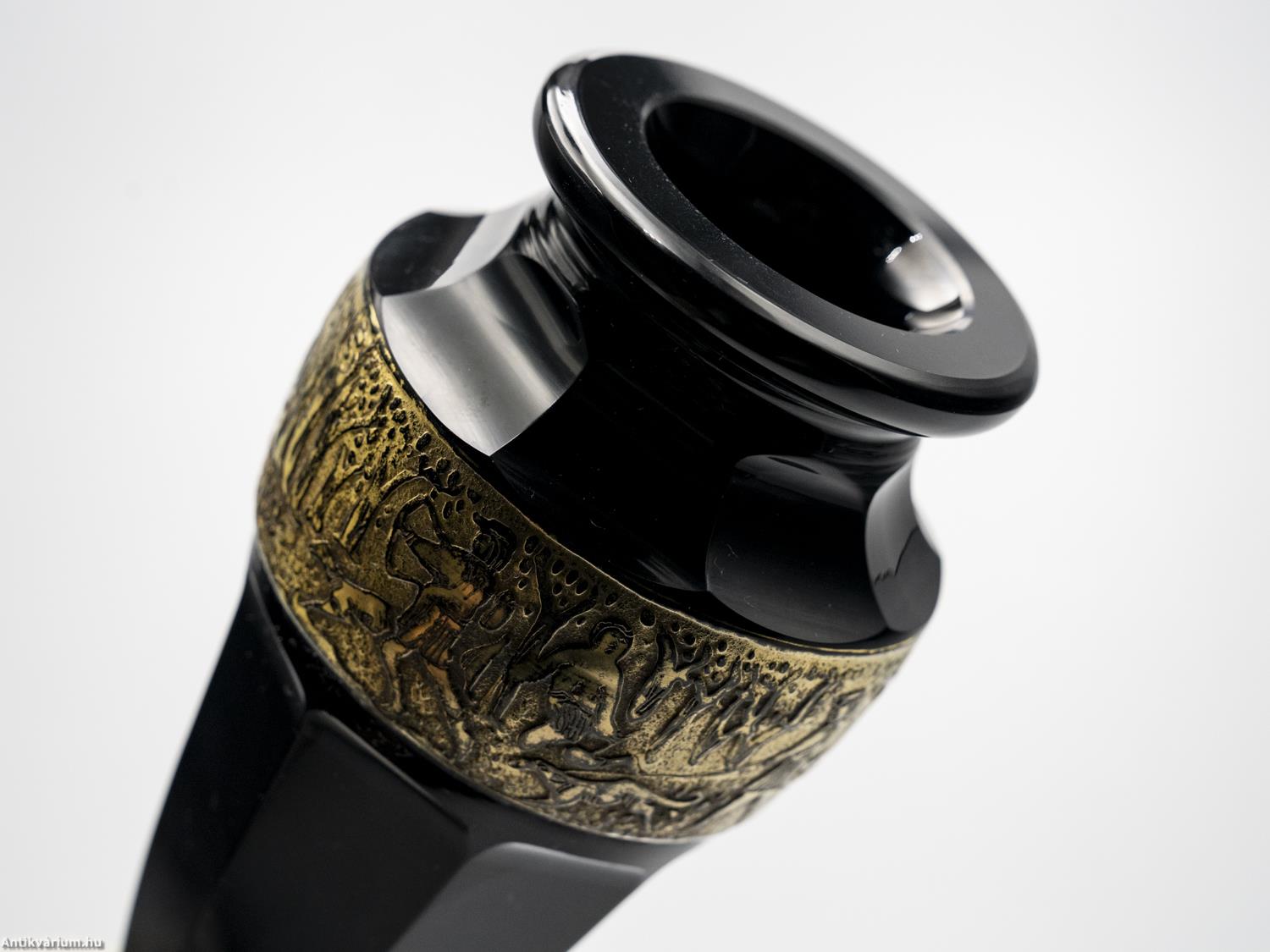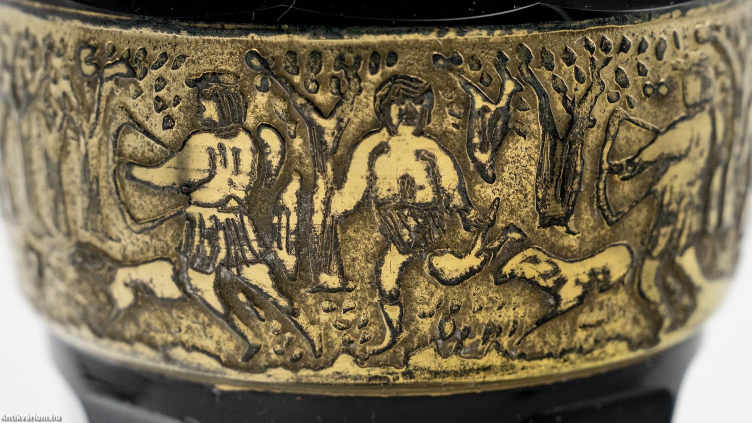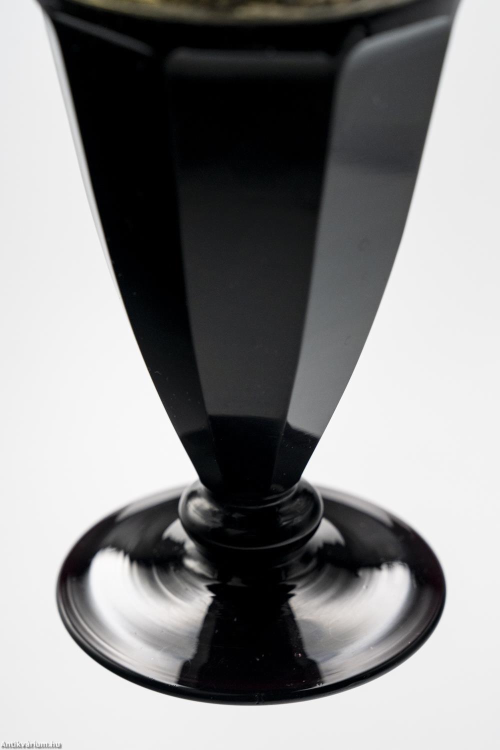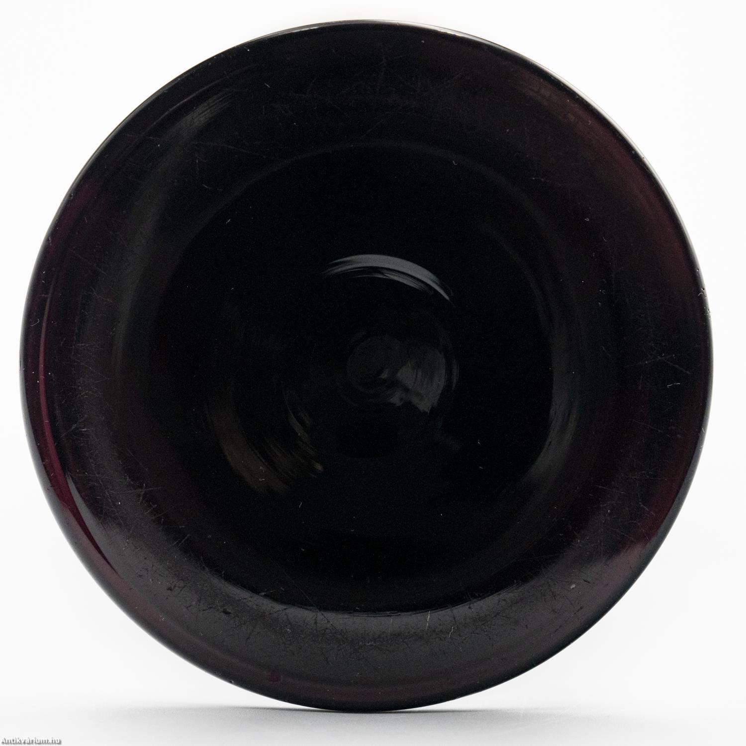 Hibátlan állapotú, fújt és kézzel formázott valamint kézzel csiszolt Moser üveg váza. Art deco stílusú sötét lila színű üvegből készült művészi üveg váza, pereme alatt hibátlan aranyozású, körbefutó, ókori vadászjeleneteket ábrázoló plasztikus frízzel, maratott és csiszolt díszítéssel. Oldalát síkra csiszolt laptagolás díszíti. A kor stílusát és a Moser csiszolás egyedi jellemzőit megjelenítő üveg váza az 1920 - as évekből.