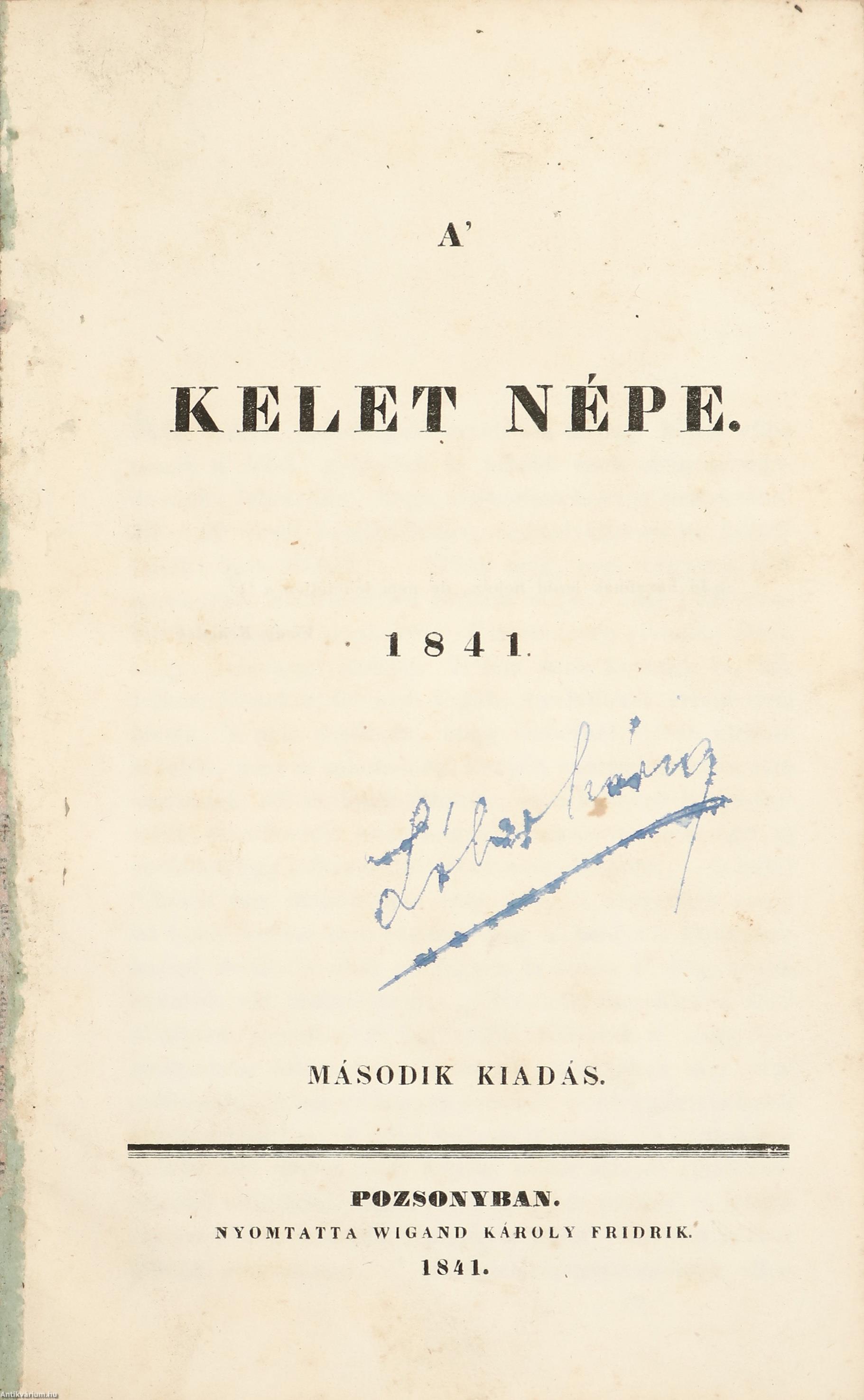 A' kelet népe 1841. Írta: gróf Széchenyi István. Második kiadás. A javítások jegyzékével kiegészített kötet. A címlapon tollal írt tulajdonosi bejegyzés látható. A könyv teljes, de a 93-94. oldalak nem a bekötési rendnek megfelelően következnek. Korabeli varrott kemény papírkötésben lévő példány feliratozatlan, színes, mintás címfedéllel és hátlappal, aranyozott feliratozású, sérült könyvgerinccel, két megerősített lappal, hiánytalan állapotban. A kötet szerzője gróf Széchenyi István (Bécs, 1791. szeptember 21. – Döbling, 1860. április 8.) politikus, császári és királyi kamarás, író, közgazdász, a reformkor egyik legkiemelkedőbb és legjelentősebb alakja, a Batthyány-kormány közlekedési minisztere, „a legnagyobb magyar”. A' kelet népe Széchenyi egyik legismertebb röpirata, amelyben legnagyobb politikai ellenfele, Kossuth Lajos reformelképzeléseit támadta. Széchenyi szerint a Kossuth által képviselt politikai irány azért veszélyes, mert annak túlságos térnyerése a reformmozgalmak radikalizálódásához, a lázító szellemiség elterjedéséhez vezet.