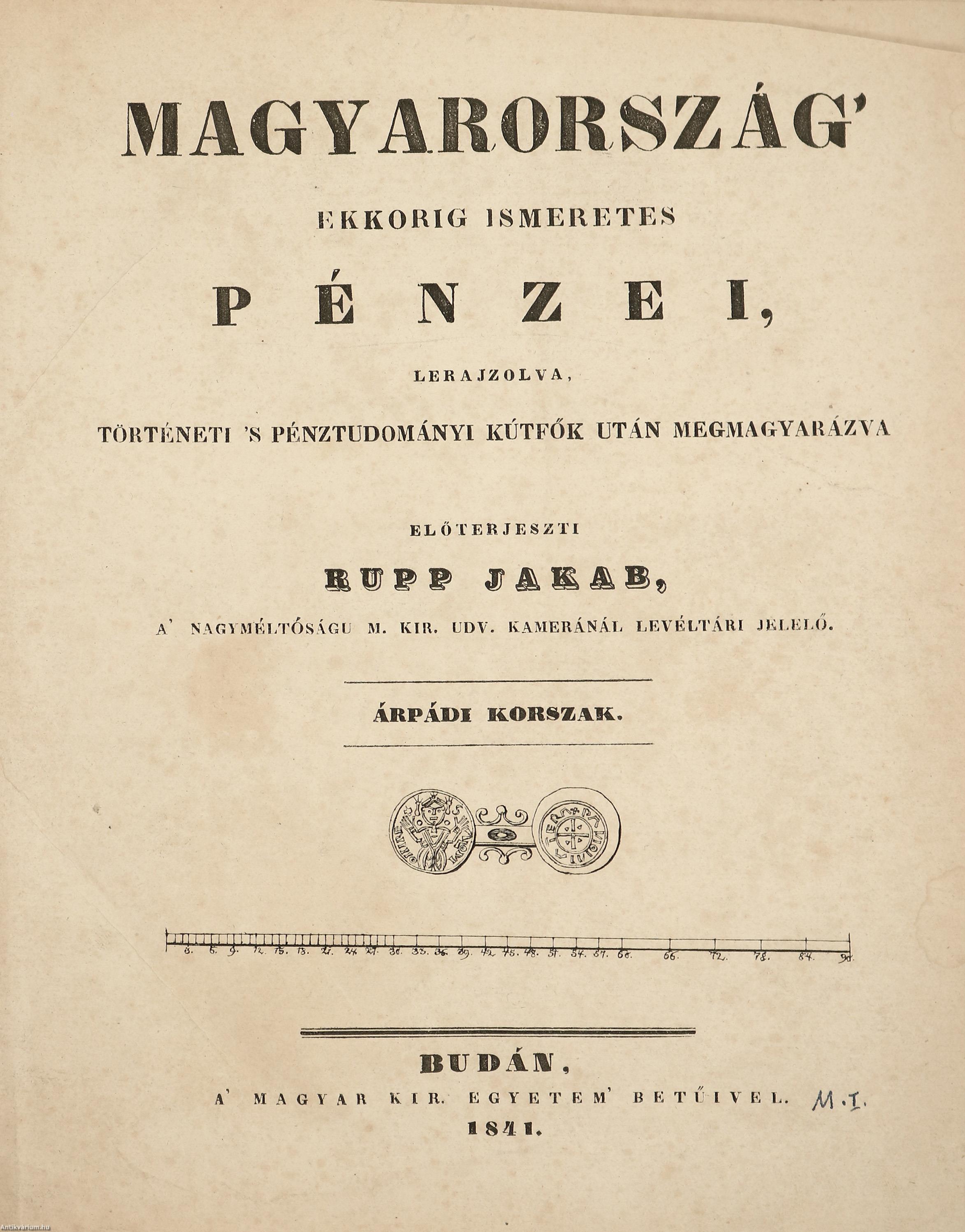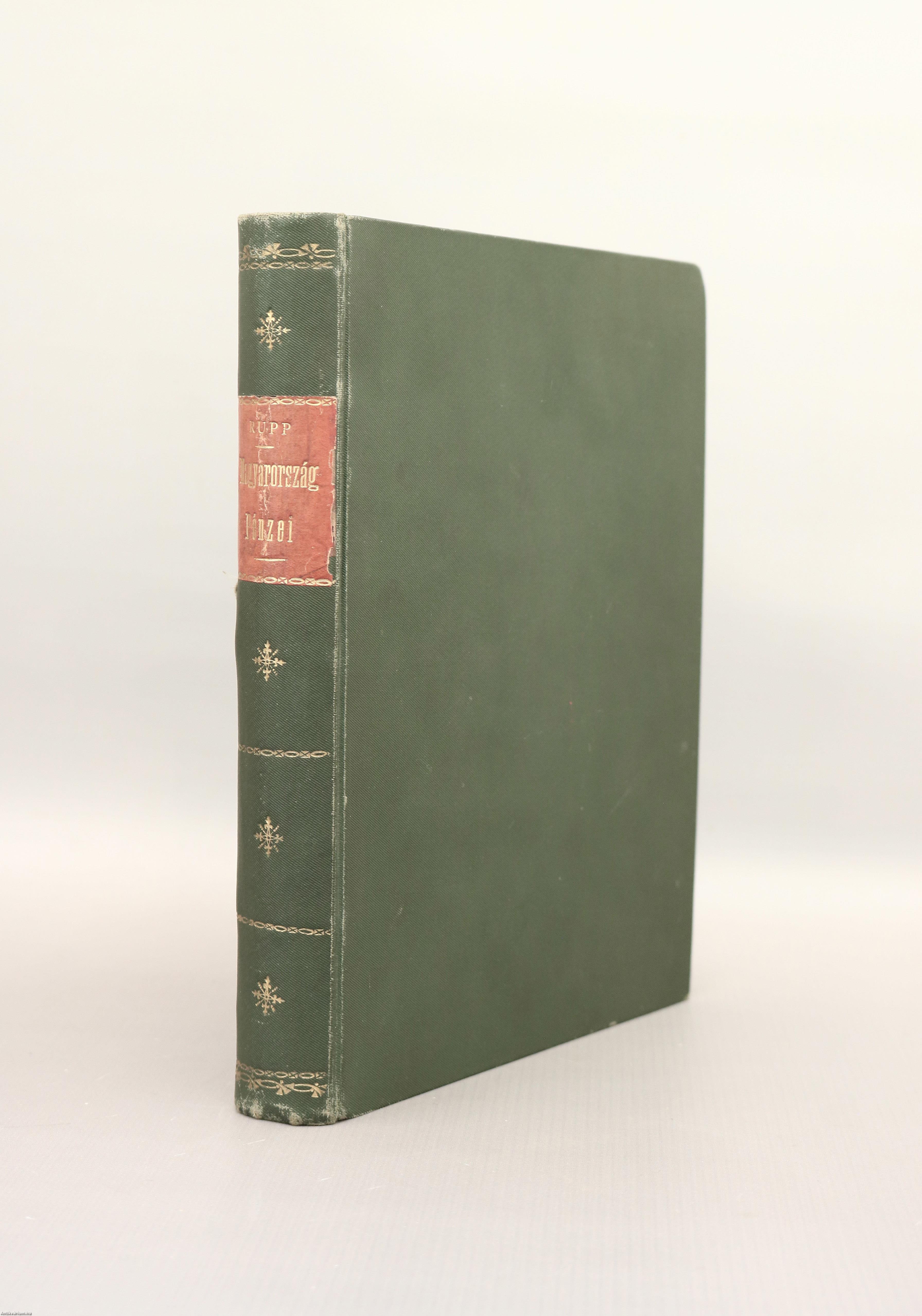 Első kiadás. Magyarország ekkorig ismeretes pénzei, lerajzolva, történeti s pénztudományi kútfők után megmagyarázva I-II. (két kötet egy könyvben). Árpádi korszak. / A vegyes házakbóli királyok korszaka. Előterjeszti Rupp Jakab, a nagyméltóságú m. kir. udv. kamaránál levéltári jelelő. 26 fekete-fehér, számozott képtáblával illusztrált, valamint Rupp Jakab bevezetőjével és az értelem zavaró sajtóhibák kiigazításával kiegészített numizmatikai kiadvány. Nyomatott a Magyar Királyi Egyetem betűivel, Budán. Könyvkötői egészvászon kötésben lévő példány, feliratozatlan címfedéllel és hátlappal, aranyozott feliratozású, díszes könyvgerinccel, mintás előzéklapokkal, több oldalon színes ceruzás jelölésekkel és aláhúzásokkal, néhány oldalon ceruzás bejegyzésekkel, vászonnal megerősített képtáblákkal, hiánytalan állapotban. Ritka numizmatikai szakanyag! Rupp Jakab (Buda, 1800. április 13. – Budapest, 1879. október 14.) numizmatikus, levéltáros. Pozsonyban és Pesten jogot végzett, később a Magyar udvari kamara levéltárának munkatársa lett. 1858-ban első osztályú lajstromozó volt. Nemcsak a magyarországi pénztörténettel foglalkozott, hanem kiváló történeti topográfiai munkásságot is kifejtett. 1841-ben Pesten, megjelentette az Árpád-kori magyar pénzek ismertetését latin és magyar nyelven: Magyarország 1841-ig ismeretes pénzei lerajzolva, történeti és pénztudományi kútfők után megmagyarázva (Numi Hungariae hactenus cogniti, Periodus Arpadiana). A könyve elején felsorolta a magyar numizmatikával kapcsolatos irodalmi forrásmunkákat, a magyar anyagot tartalmazó nagyobb éremgyűjtemények és gyűjtők névsorát. 1846-ban pedig kiadta munkájának 2. részét "Vegyes házakbóli kiárályok korszaka" alcímmel. Cikkei többek között az Archaeológiai Értesítőben és az Archaeológiai Közleményekben jelentek meg.
