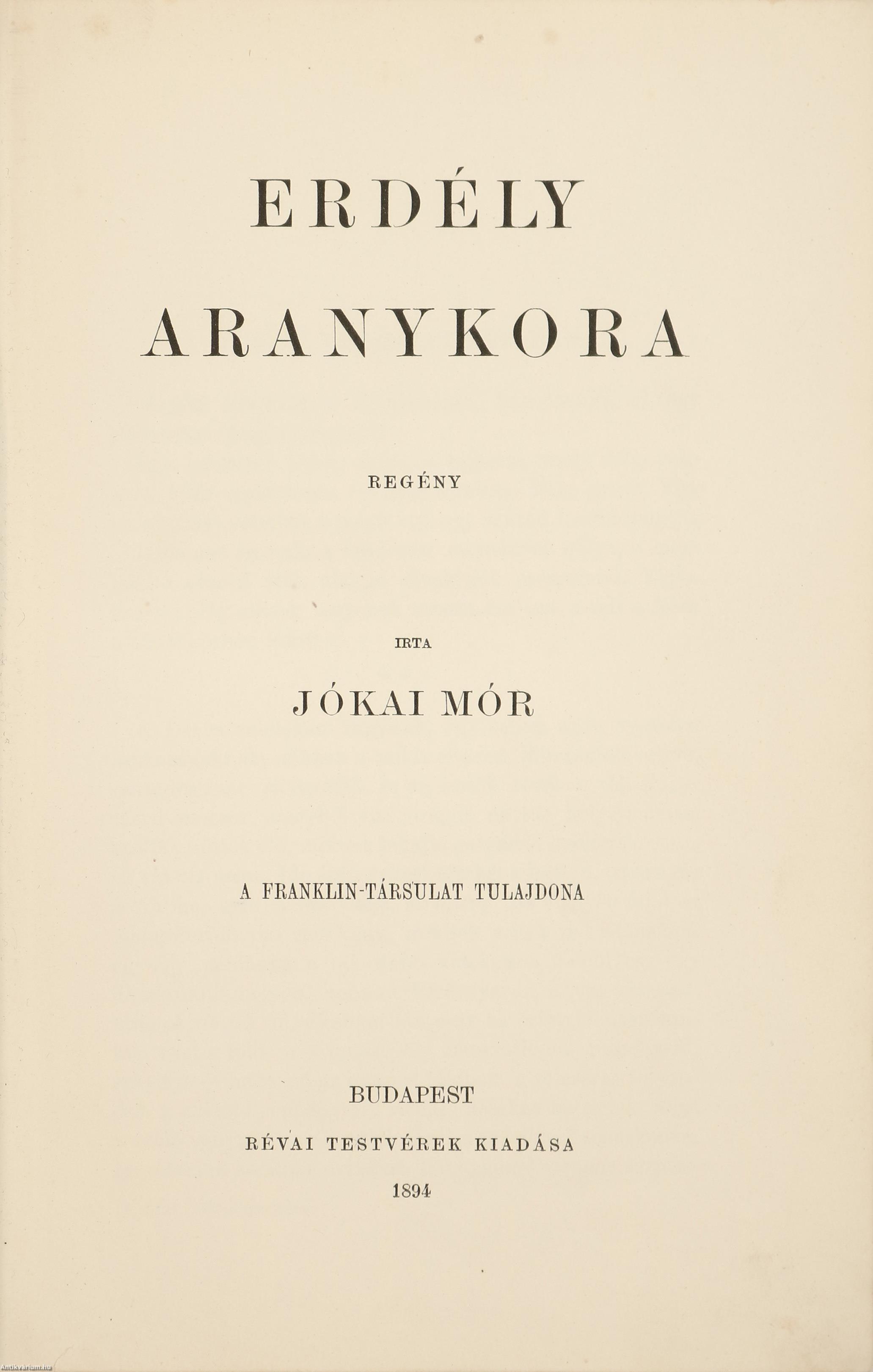 Szerző által aláírt példány. Jókai Mór Összes Művei. Nemzeti díszkiadás. No.: I. kötet. Erdély Aranykora. Regény. Írta: Jókai Mór. A címlapkép alatt a szerző, Jókai Mór tollal beírt, jól olvasható aláírása látható. Közrebocsátja a Jókai Mór ötven éves írói jubileuma alkalmából alakult bizottság. Jókai Mór fekete-fehér, hártyapapírral védett portréjával (Pest, Horowitz) illusztrált, valamint részletes tartalomjegyzékkel kiegészített kiadás. Kötötte Gottermayer Nándor Könyvkötői Műintézet, Budapesten. Kiadói egészvászon Gottermayer sorozatkötésben lévő példány aranyozott díszítéssel gazdagon ellátott címfedéllel, aranyozott feliratozású, dúsan aranyozott könyvgerinccel, mintás előzéklapokkal, mintázott lapélekkel, hátlapon a kötészet feltüntetésével, hiánytalan állapotban. A szerző, Jókai Mór (Komárom, 1825. február 18. – Budapest, 1904. május 5.) író, újságíró, politikus, a "Márciusi Ifjak" egyike. Első regényének, a "Hétköznapok"-nak a sikere után az írásnak szentelte az egész életét. A "Pesti Füzetek", majd az "Életképek" szerkesztője volt. Az "Életképek" az idők folyamán egyértelműen politikai lappá alakul át. Jókai ebben cikkeivel a nemzeti politikát támogatja a "Szabadság, egyenlőség, testvériség" eszméjének jegyében. Az "Életképek" után a "Pesti Hírlap" szerkesztését vállalta el, majd megindította az "Esti Lapokat", a radikálisok főorgánumát. A forradalom bukása után Jókai tevékenységét többnyire a "Vasárnapi Újságnak" szentelte, ami ugyan eszmeiségben megegyezett a nagy író gondolataival, de a lapnak politikai okokból a szerkesztője nem lehetett. A 19. századi magyar irodalom rendkívüli népszerűséget elérő, nagy regényírója volt, gazdag és tartalmas életművet hagyott hátra. Regényeinek befogadását, értelmezését a keletkezésüktől az utóbbi évtizedekig a realista és a romantikus stílus kettőssége határozta meg; e két irodalmi stílus ötvözése tette Jókait "a magyar nemzet íróóriásává".