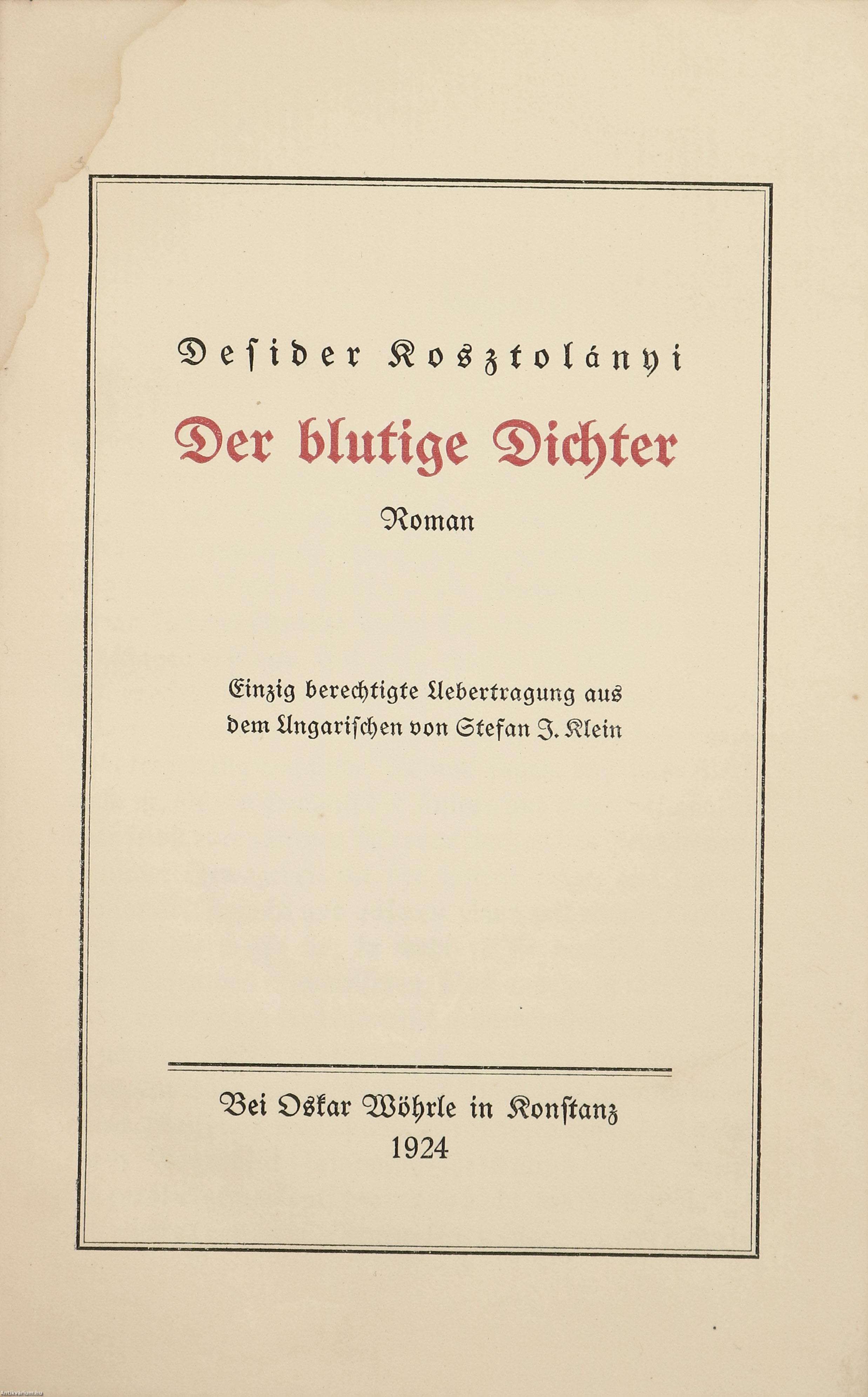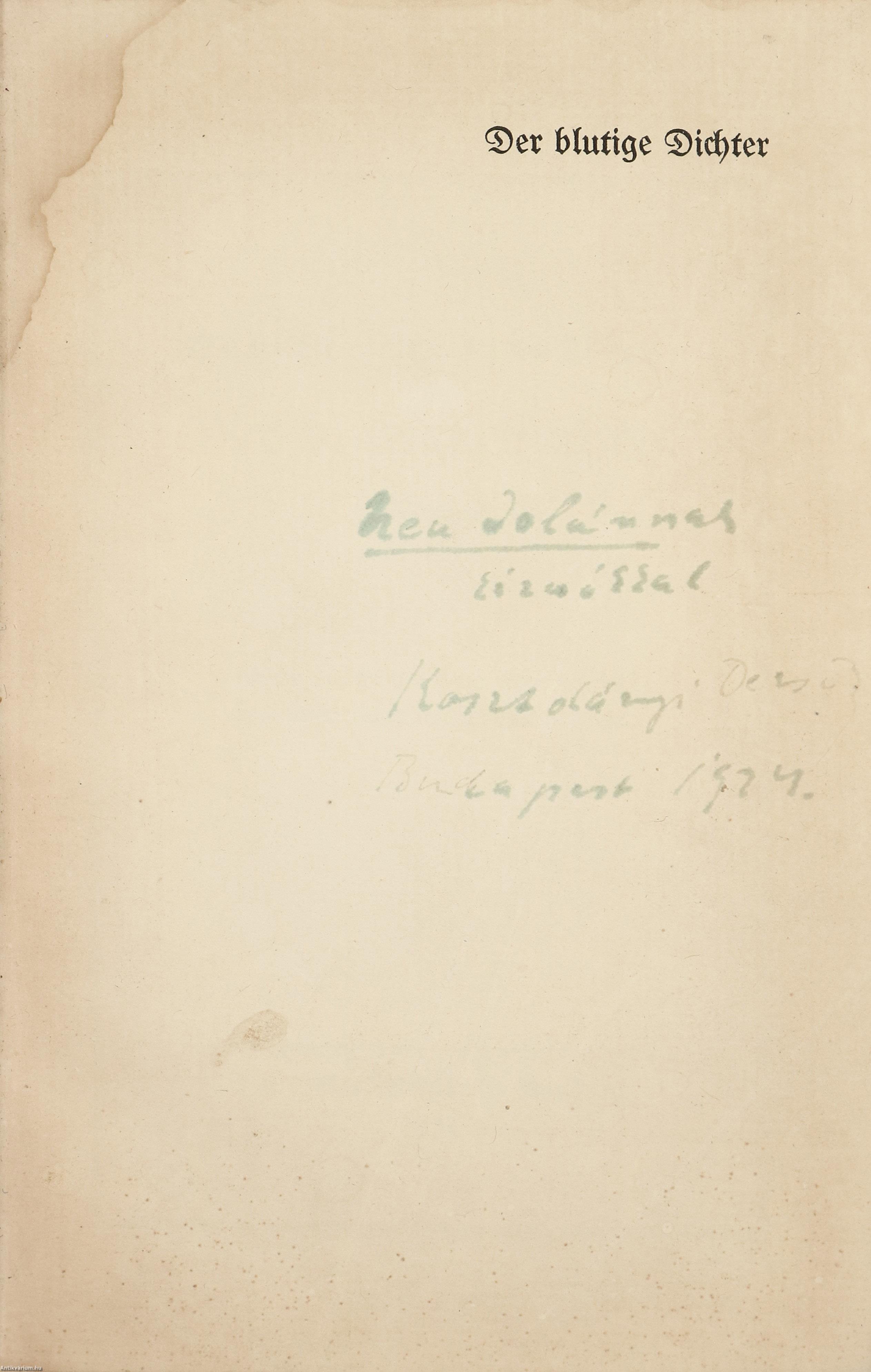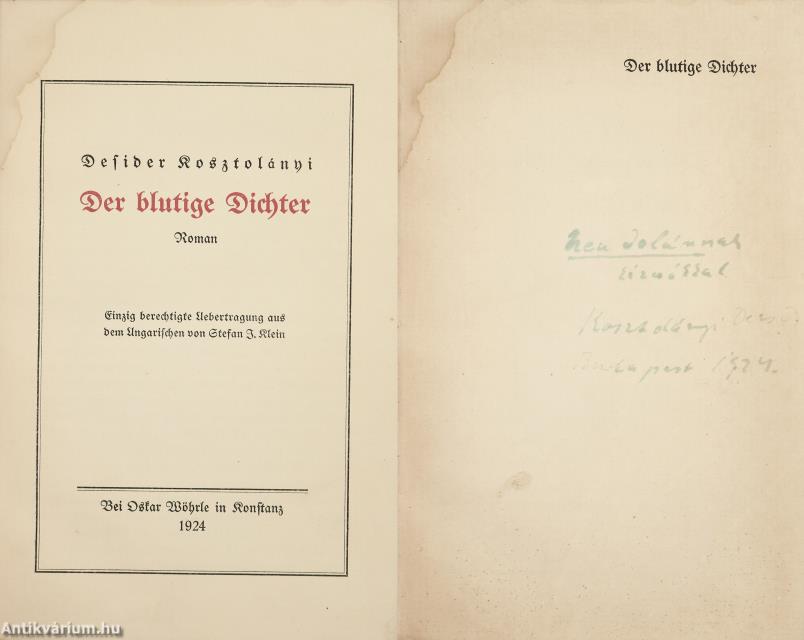 Szerző által dedikált példány. Első német nyelvű kiadás. Der blutige Dichter. Roman. / A véres költő. Regény. Írta: Kosztolányi Dezső. Magyar nyelvből fordította: Stefan J. Klein.