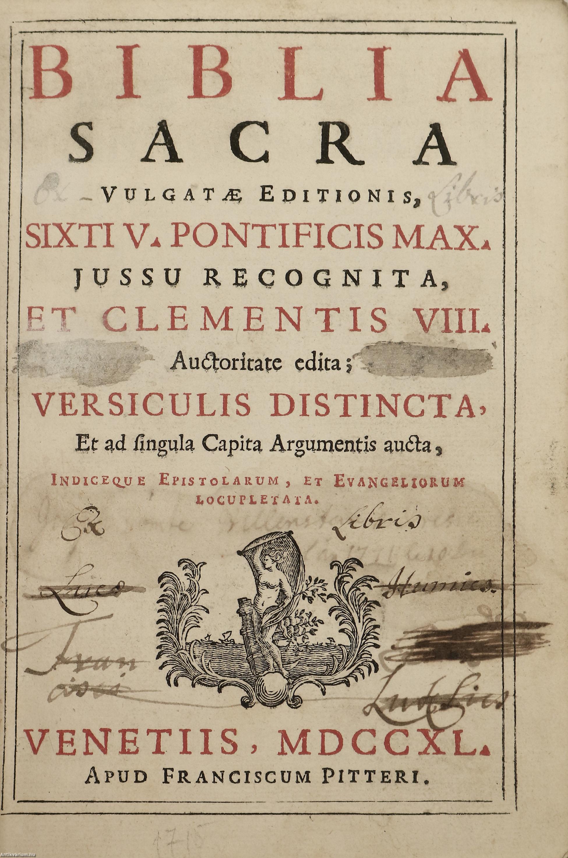 Biblia Sacra Vulgatae editionis. Sixti V. Pontificis Max. jussu recognita, et Clementis VIII. Auctoritate edita./ Szent Biblia a Vulgata szerint. V. Szixtusz pápa rendelkezése nyomán átdolgozott, és VIII. Kelemen pápa által jóváhagyott kiadás.