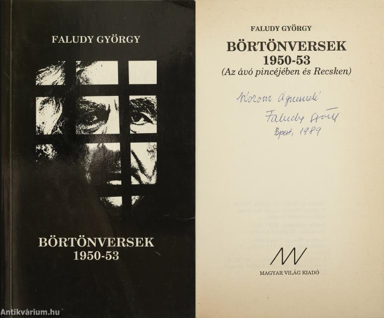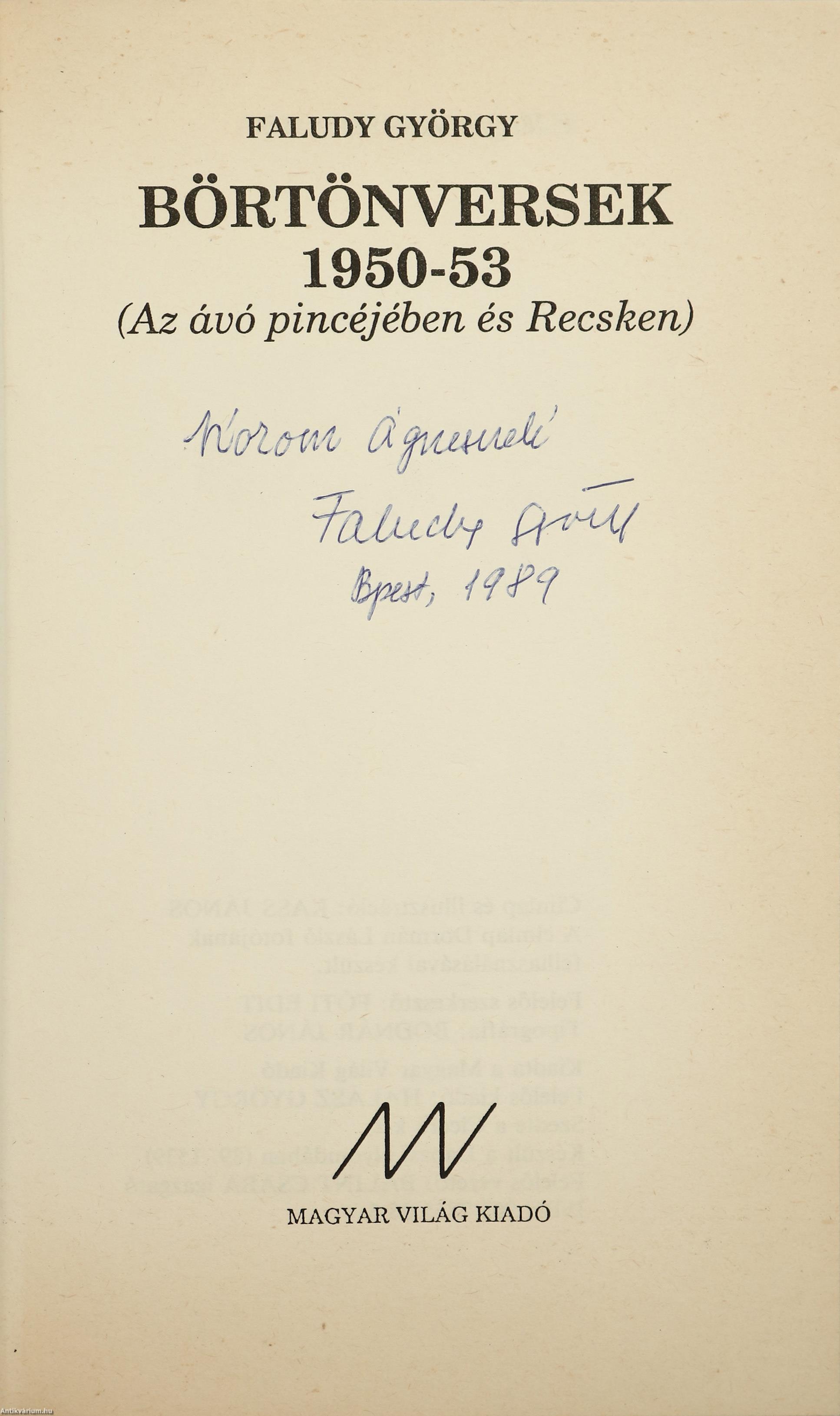 Szerző által dedikált példány. Első magyarországi kiadás. Börtönversek. 1950-53. (Az ávó pincéjében és Recsken). Írta: Faludy György.