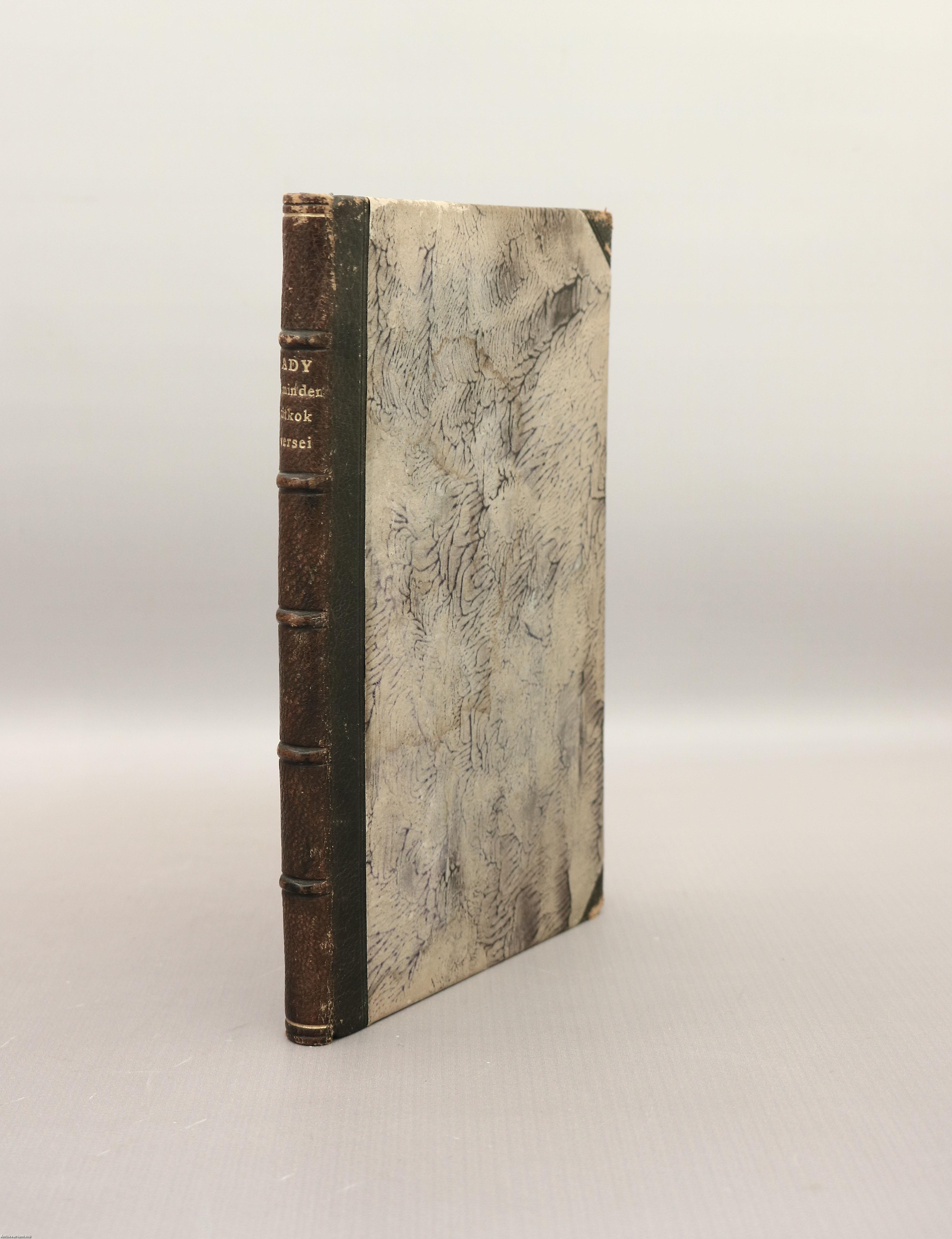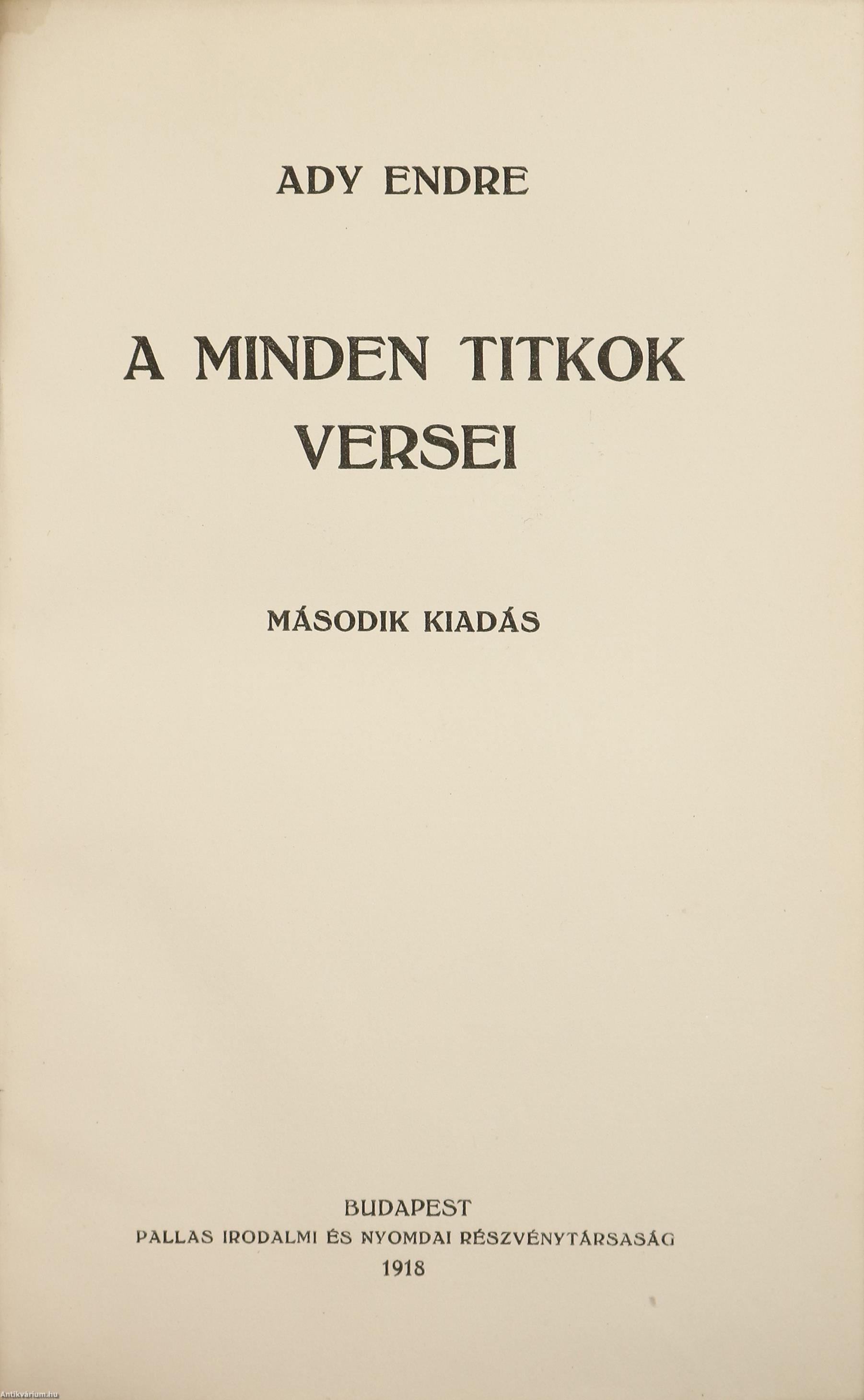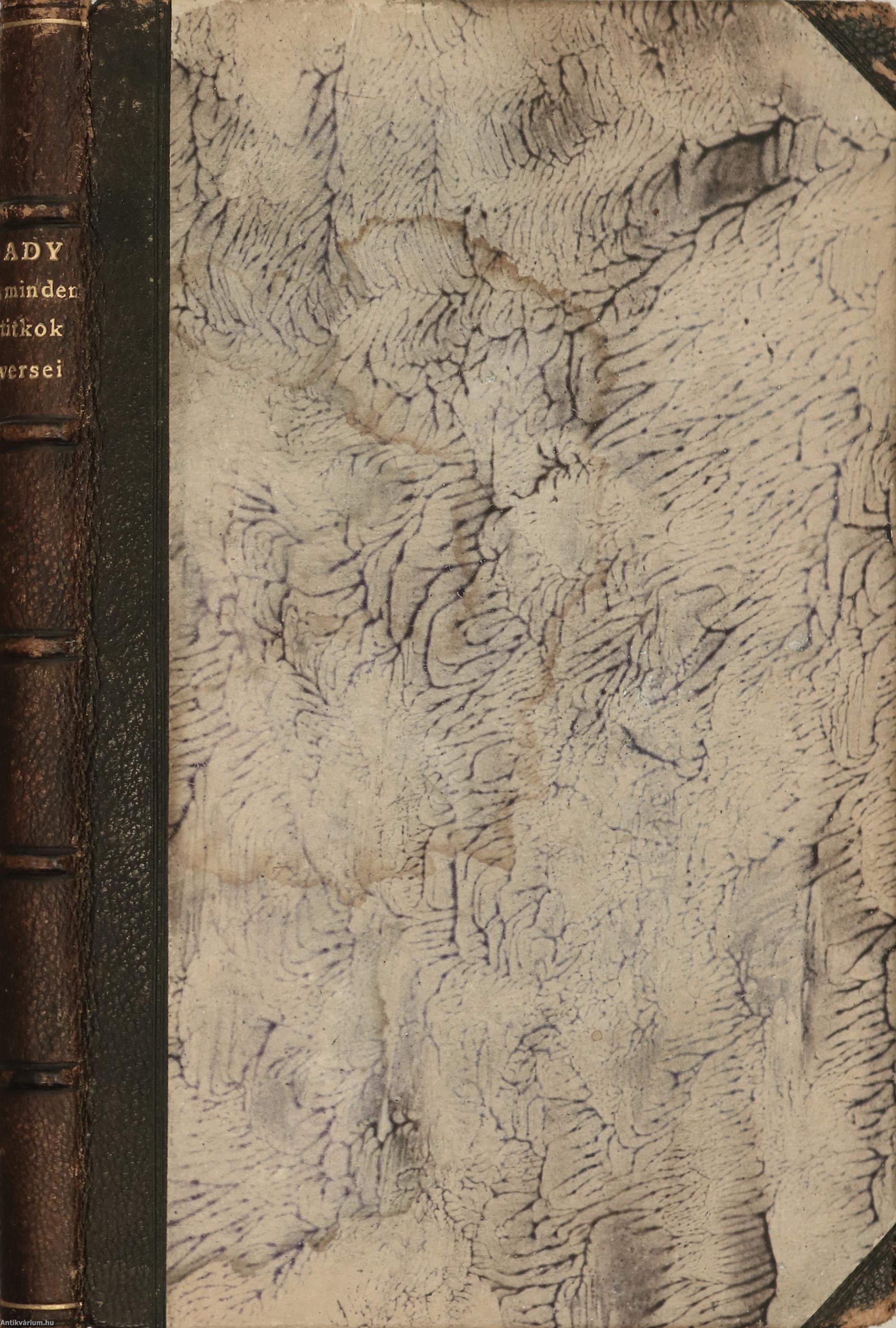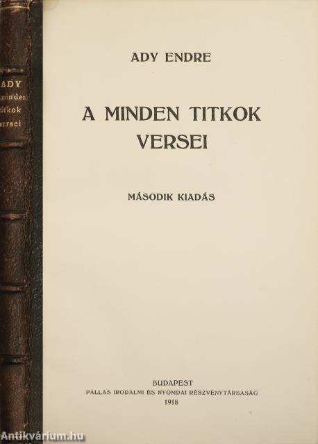 A minden titkok versei. Írta: Ady Endre. Második kiadás. Részletes tartalomjegyzékkel és korabeli hirdetésekkel kiegészített kötet. Nyomtatta a Pallas Irodalmi és Nyomdai Részvénytársaság, Budapesten. Korabeli félbőr kötésben lévő példány, feliratozatlan, mintás címfedéllel és hátlappal, aranyozott feliratozású, ötbordás könyvgerinccel, virágmintás előzéklapokkal, színezett felső lapélekkel, hiánytalan állapotban. "...Titokról szólni, annyi mint a jövő titkosítását megfejteni. A titok tehát nagy várakozás és még nagyobb bizonytalanságot jelent. Az egyik történelmi perc már elárulta gyermekét, a másik még nem ölelte magához. A titkot csak az tudja, aki szenvedélyesen tudja, hogy az övé a jövő, vagyis egy kisebbséghez tartozik, mert a többség nem érzékeli a titkot, sokszor ellenséges is iránta. S a titok még több is ennél: hangos kérdés és halk válasz. Aki kérdez, reméli, hogy a válasz majd megerősödik. A Minden-titkok versei mintha erről a nagy titokról szóló eposz akarna lenni. Talán azért tűnik annak, mert a versek hangvételében van valami komor, biblikus ünnepélyesség és kaján csúfolódás, szecessziós fáradtság és paraszti gorombaság. Egy fáradt és elárult szubjektivitás egészséges és cinkos birkózása az istenekkel..." - írta a műről Végel László (Híd, 1977. november 01./41. évfolyam/11. szám). A kötet szerzője Ady Endre (Érmindszent, 1877. november 22. – Budapest, 1919. január 27.), a huszadik század egyik legjelentősebb magyar költője, a modern kori magyar politikai újságírás meghatározó, a haladást, európaiságot hirdető szerzője, a Nyugat alapító nemzedékének tagja. Költészetének témái szinte az emberi lét minden jelentős területére kiterjednek (szabadság, egyenlőség, hit, nemzet, szerelem, mulandóság, stb.).