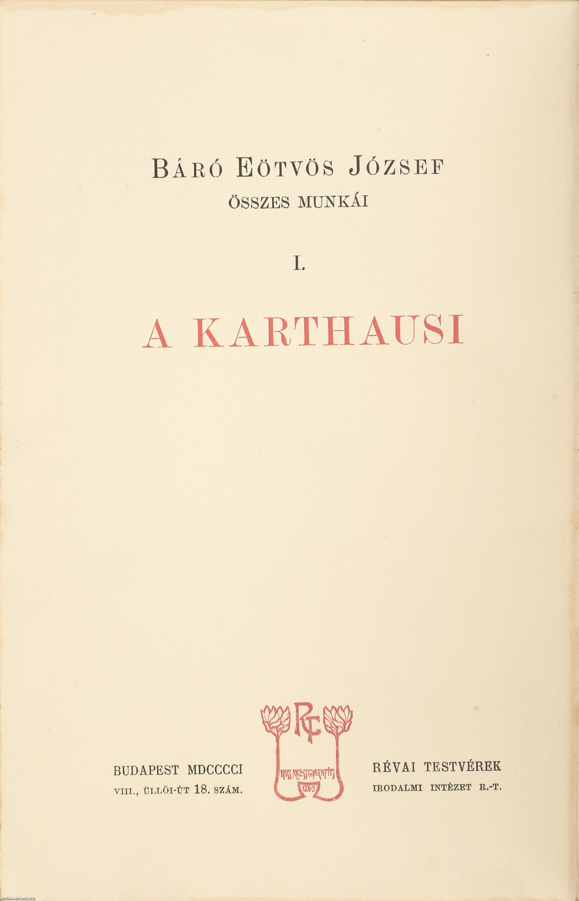 I. kötet: A karthausi. A címfedél felőli előzék sérült, a címlapon tulajdonosi bejegyzés, néhány oldalon ceruzás jelölés és aláhúzás látható, valamint néhány lap foltos. Budapest, 1901, III p. + [1] p. + 520 p.