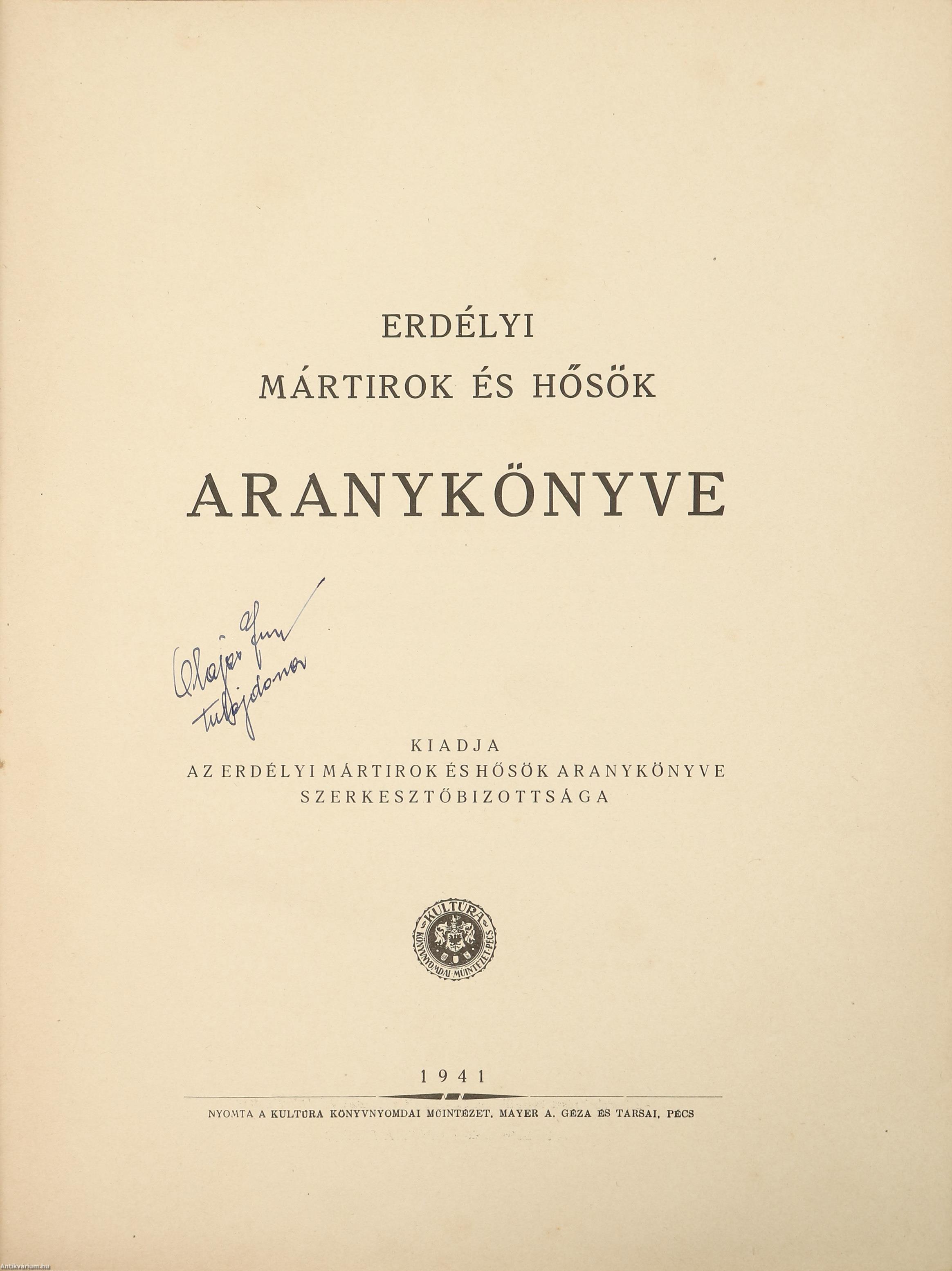 Első kiadás. Erdélyi mártirok és hősök aranykönyve. Kiadta az Erdélyi mártírok és hősök aranykönyve szerkesztőbizottsága. A szerkesztőbizottság elnöke: Dr. Lukács György v. b. t. t. ny. miniszter, a Reviziós Liga elnöke.