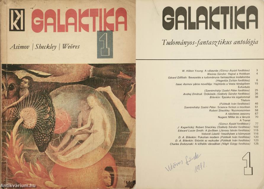 Weöres Sándor Kossuth- és Baumgarten-díjas költő által aláírt példány. Galaktika 1. Tudományos-fantasztikus antológia. Összeállította és szerkesztette: Kuczka Péter. A címlapon az egyik szerző, Weöres Sándor tollal beírt, jól olvasható aláírása látható. Számos szövegközti, fekete-fehér képpel illusztrált, valamint könyvhirdetésekkel és tartalomjegyzékkel ellátott kötet. A fedélterv és a tipográfia Erdélyi János munkája. A fedélen részlet Hyeronimus Bosch: Gyönyörök kertje c. művéből (Prado Múzeum, Madrid). A színes reprodukciót Schiller Alfréd készítette. Nyomtatta a Zrínyi Nyomda. Kiadói ragasztott papírkötésben lévő példány feliratozott, színes illusztrációval ellátott címfedéllel, feliratos könyvgerinccel, szöveges hátlappal, átlagos, hiánytalan állapotban. A Galaktika az egyik legjelentősebb sci-fi-antológia, ami eredeti formájában 1972 és 1995 között jelent meg Magyarországon. Kiadója, a Kozmosz Könyvek volt. Hosszú és sikeres fennállása során 2257 novellát és cikket közölt le, több mint 1000 szerzőtől. Jelen példány a sorozatot megindító, 1972-ben kiadott első szám. A kötetet aláírta, Weöres Sándor (Szombathely, 1913. június 22. – Budapest, 1989. január 22.) Kossuth- és Baumgarten-díjas, irodalmi Nobel-díjra jelölt magyar költő, író, műfordító, irodalomtudós, a XX. századi magyar irodalom sokoldalú, spirituálisan érzékeny költője. Kifinomult, több rétegű költészete formabontó és példaértékű lett a magyar lírában.