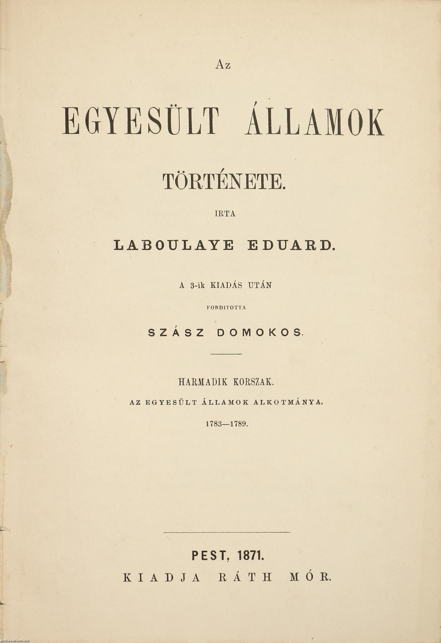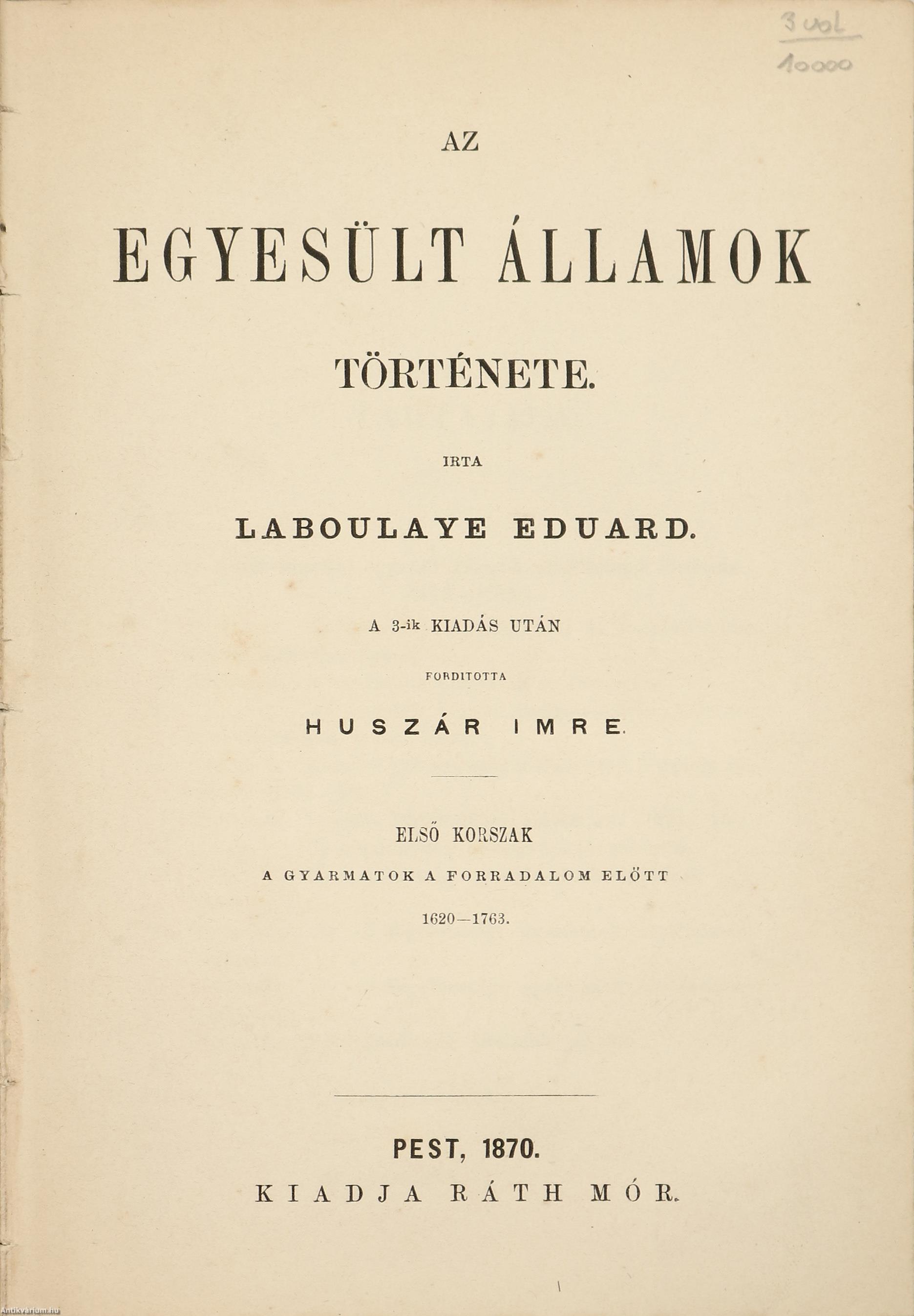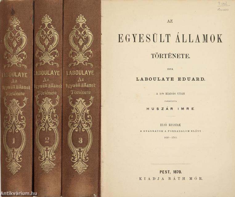 Első magyar nyelvű kiadás. Az Egyesült Államok története 1-3. (különálló egységes kötetekben). Írta: Laboulaye Eduard.