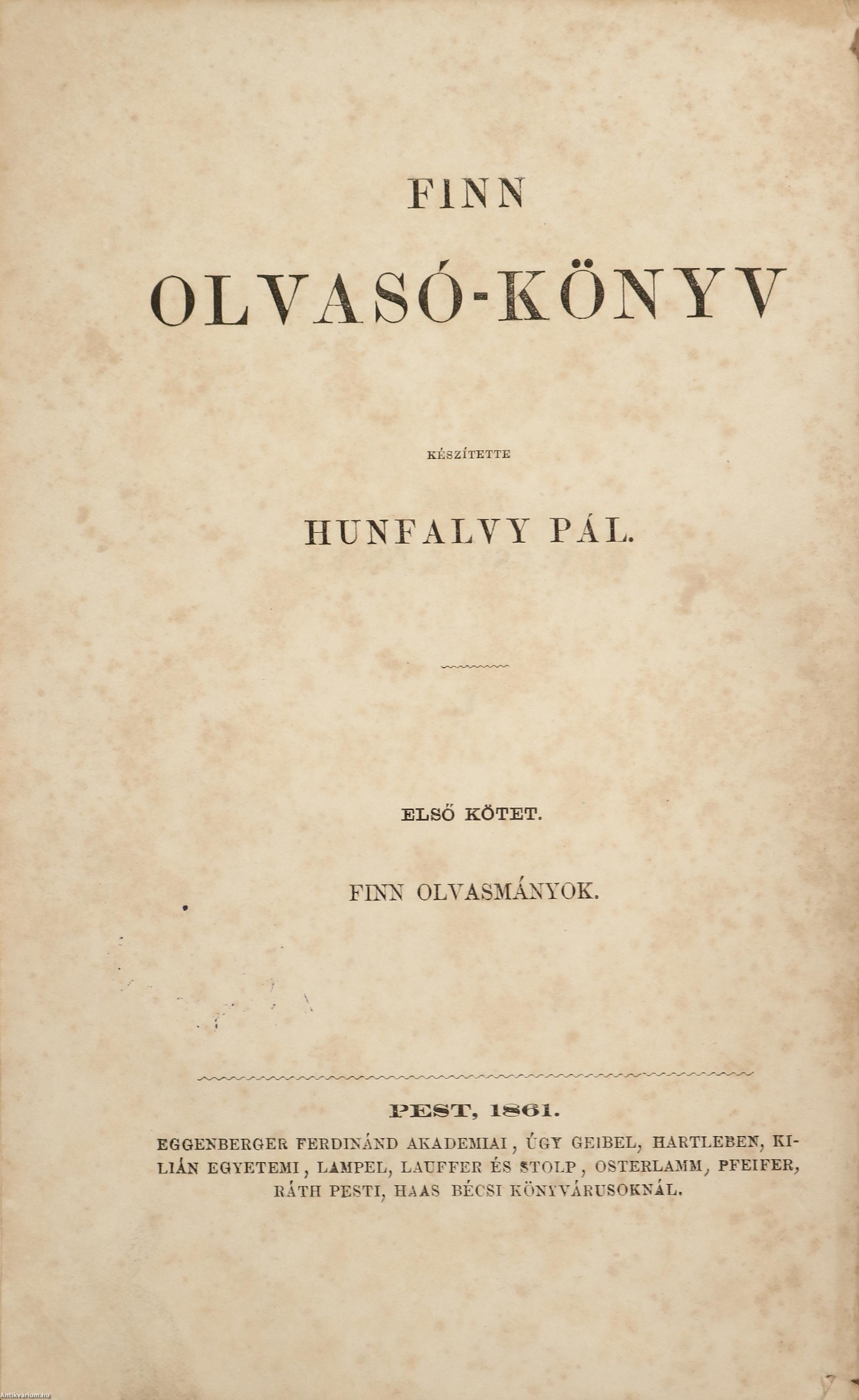 Első kiadás.Finn olvasó-könyv, no. 1. Finn olvasmányok. A' finn nyelvet tanulók számára. Szerkesztette: Hunfalvy Pál.