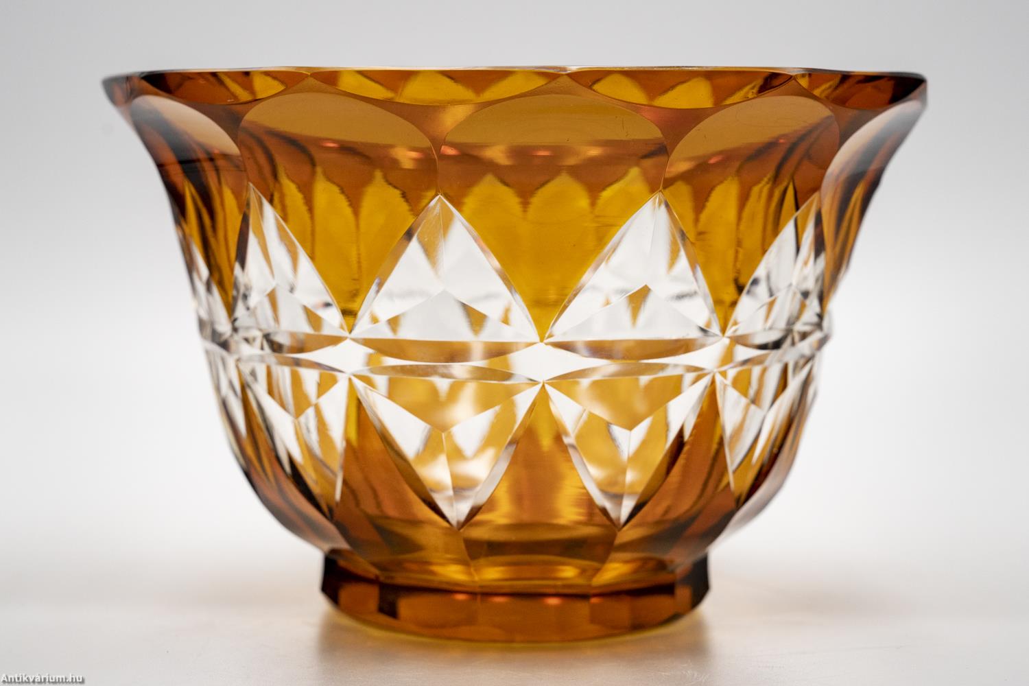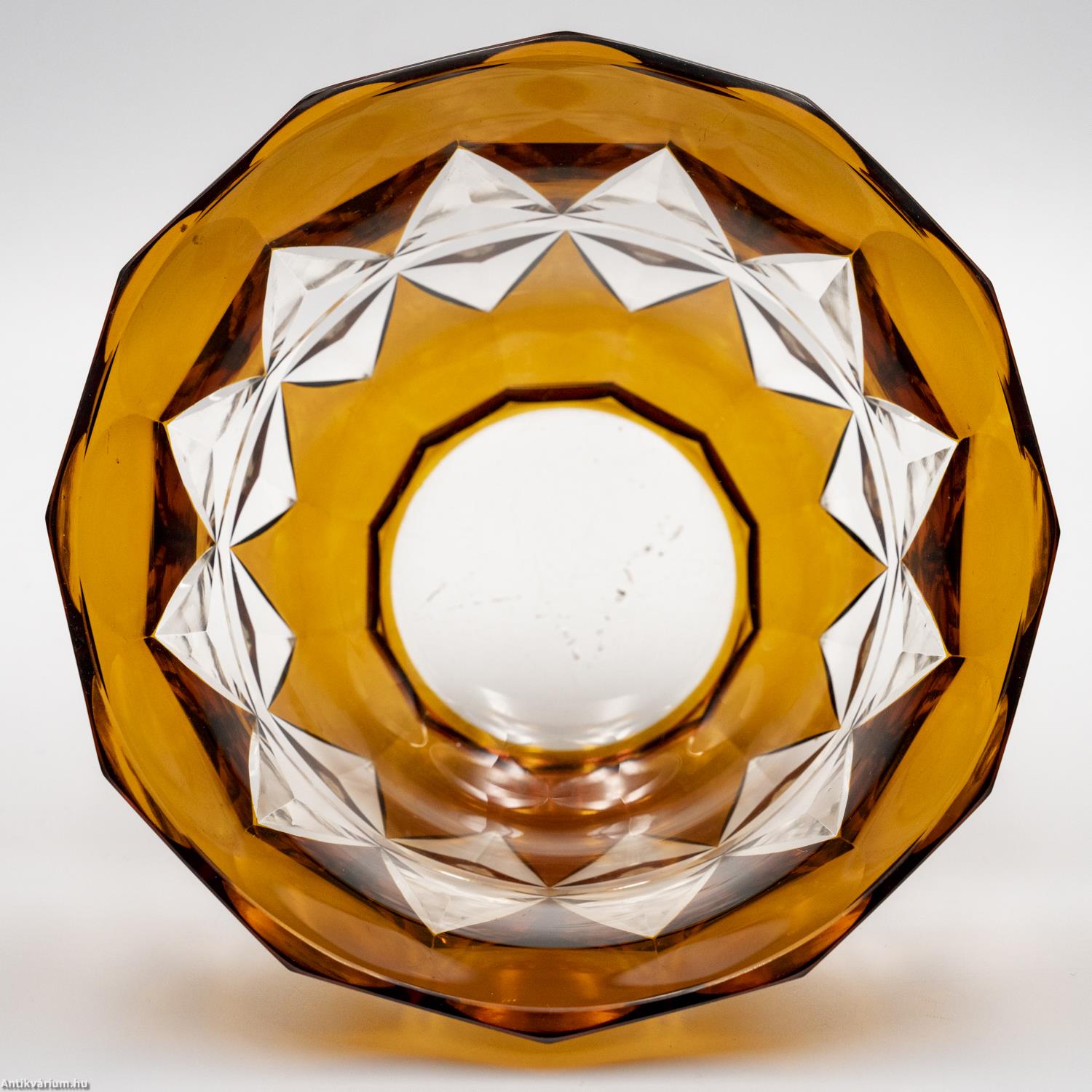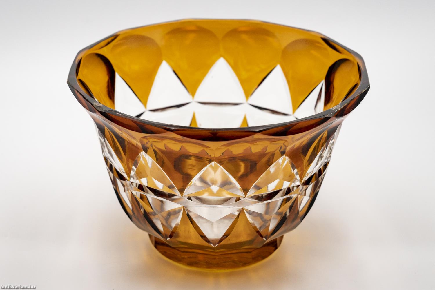 Hibátlan állapotú, fújt és kézzel formázott Karl Schappel által Haidában készített art deco hámozott üveg tál az 1920- as évekből. Színtelen, vastag falú kristályüvegből készült borostyán színű üvegfestékkel festve. Kehely formájának oldalait gazdag geometrikus csiszolás díszíti. Talpa lapra csiszolt.