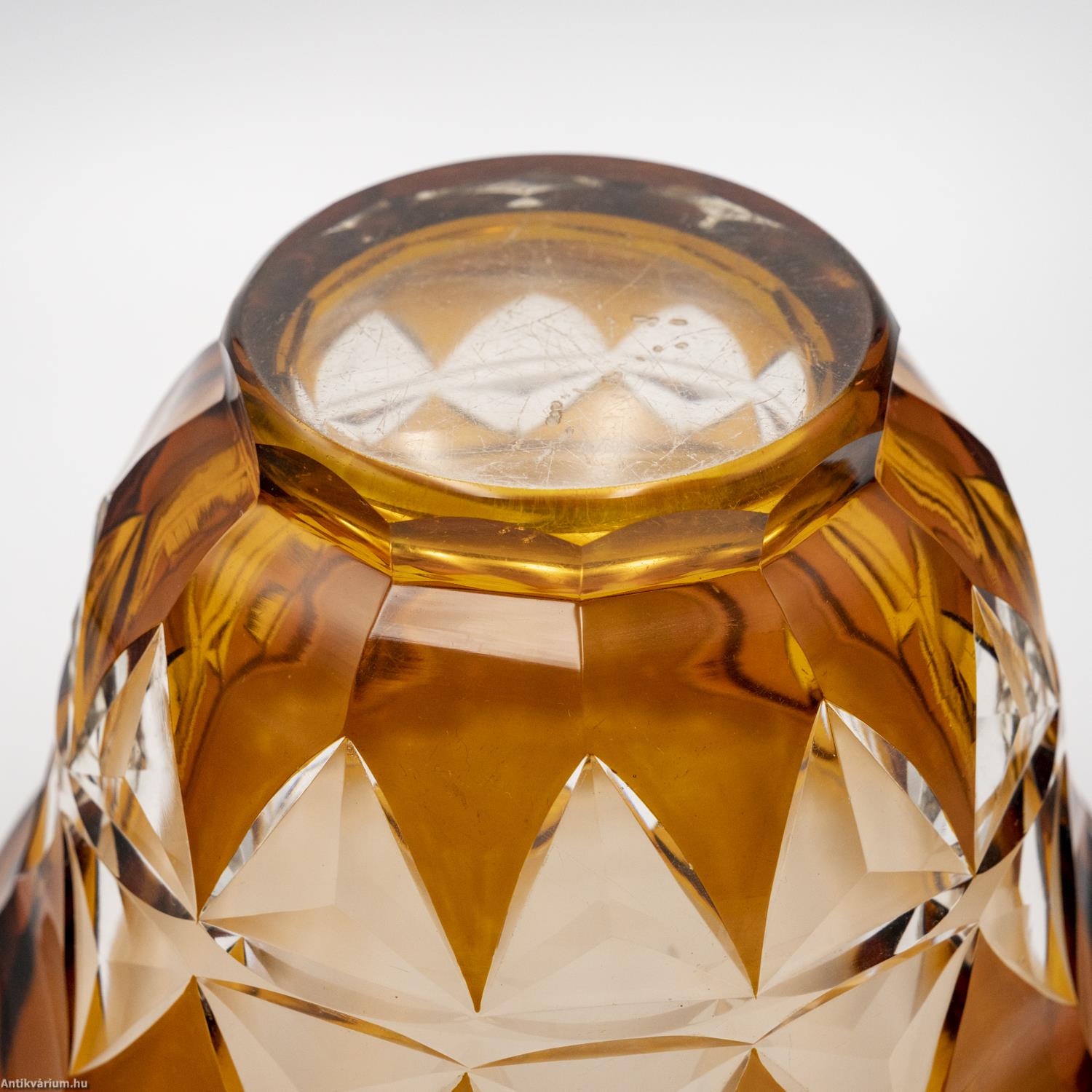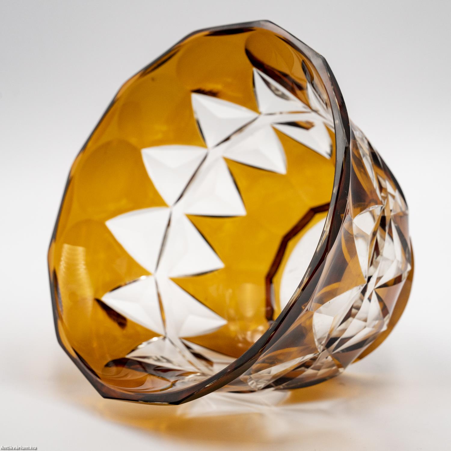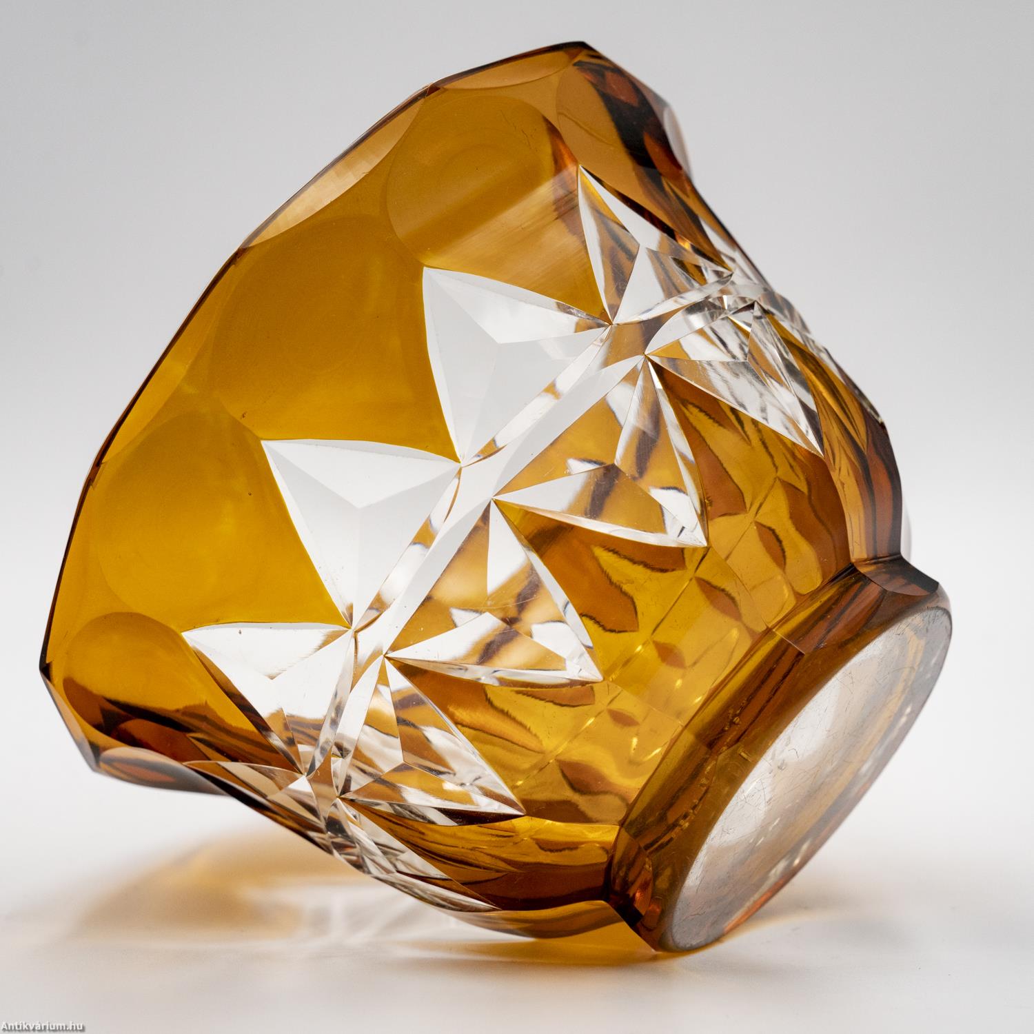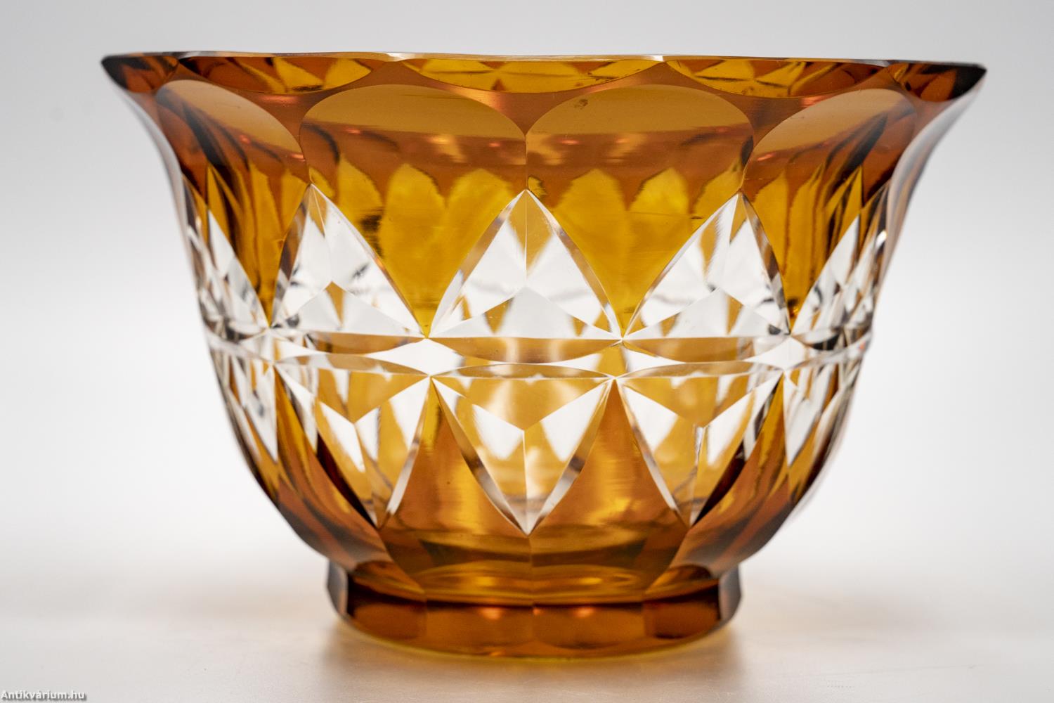 Hibátlan állapotú, fújt és kézzel formázott Karl Schappel által Haidában készített art deco hámozott üveg tál az 1920- as évekből. Színtelen, vastag falú kristályüvegből készült borostyán színű üvegfestékkel festve. Kehely formájának oldalait gazdag geometrikus csiszolás díszíti. Talpa lapra csiszolt.