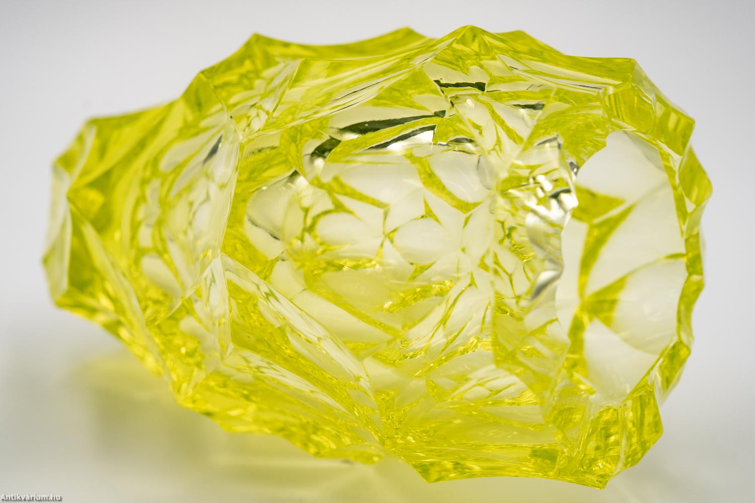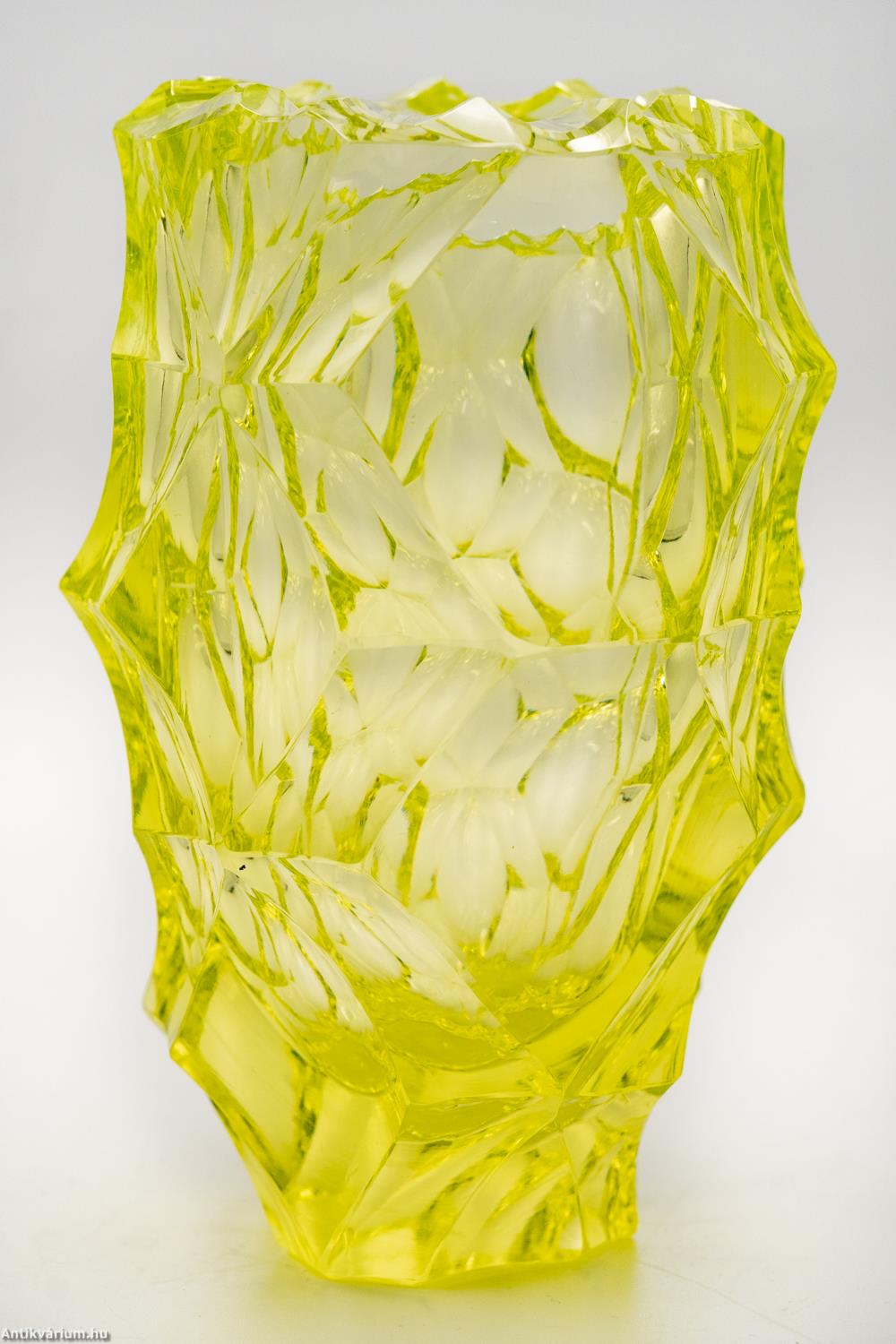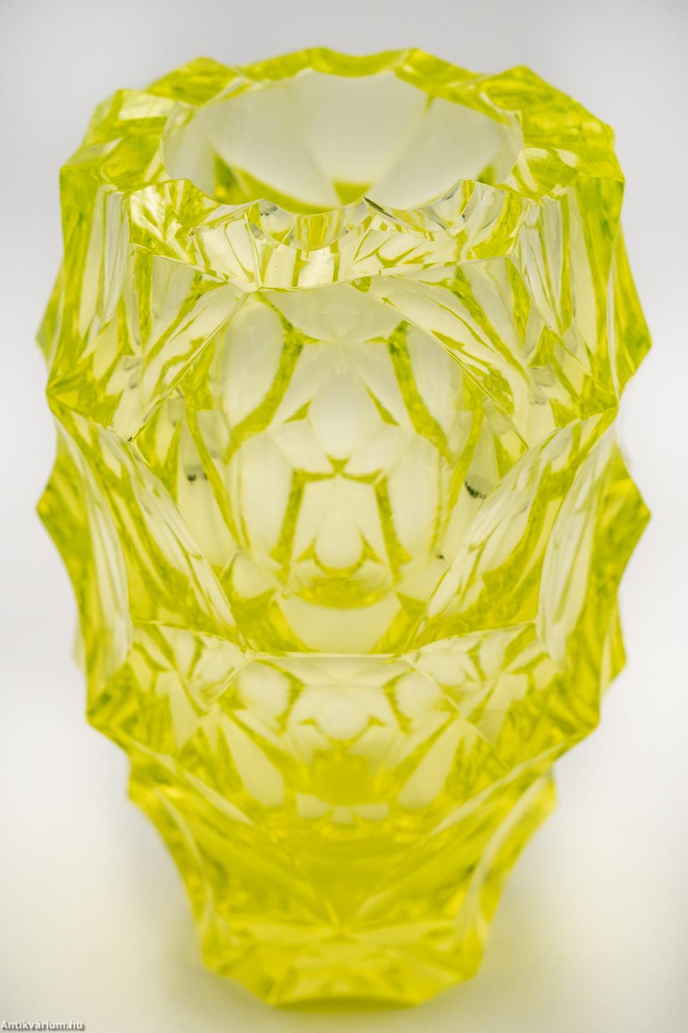 Hibátlan állapotú, fújt és kézzel formázott valamint csiszolt Moser üveg váza a 20. század első feléből. Vastag falú, nagysúlyú üveg váza. Mind mintázatában, mind csiszolási technikájában különleges alkotás, igazi mester munka. A részletgazdag, lapokra csiszolt felülete mértanilag megszerkesztett tervezés eredménye. Élénk uránzöld színe csak még tovább fokozza az extrém megjelenését. Talpa lapra csiszolt.