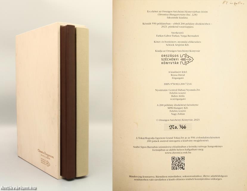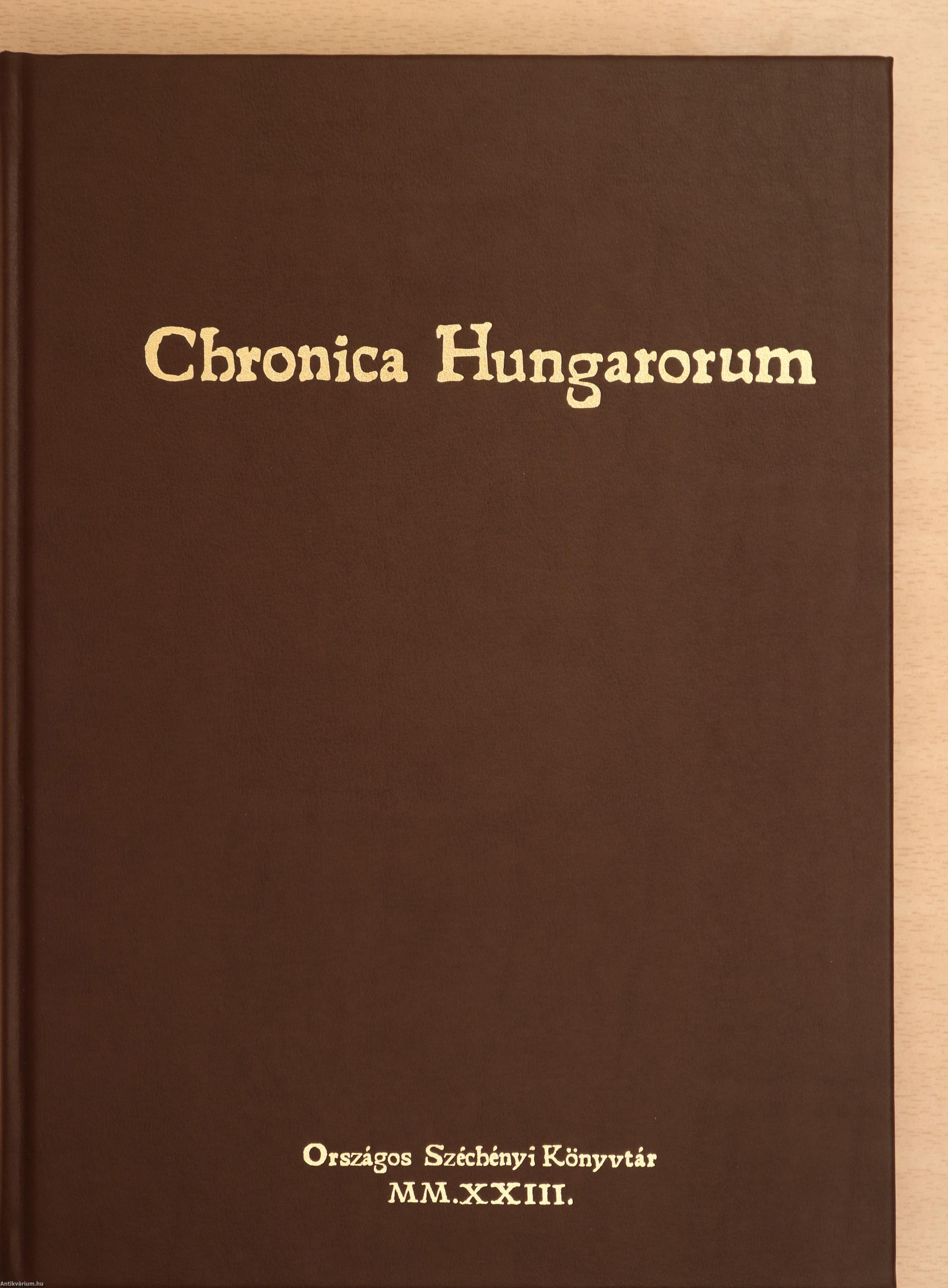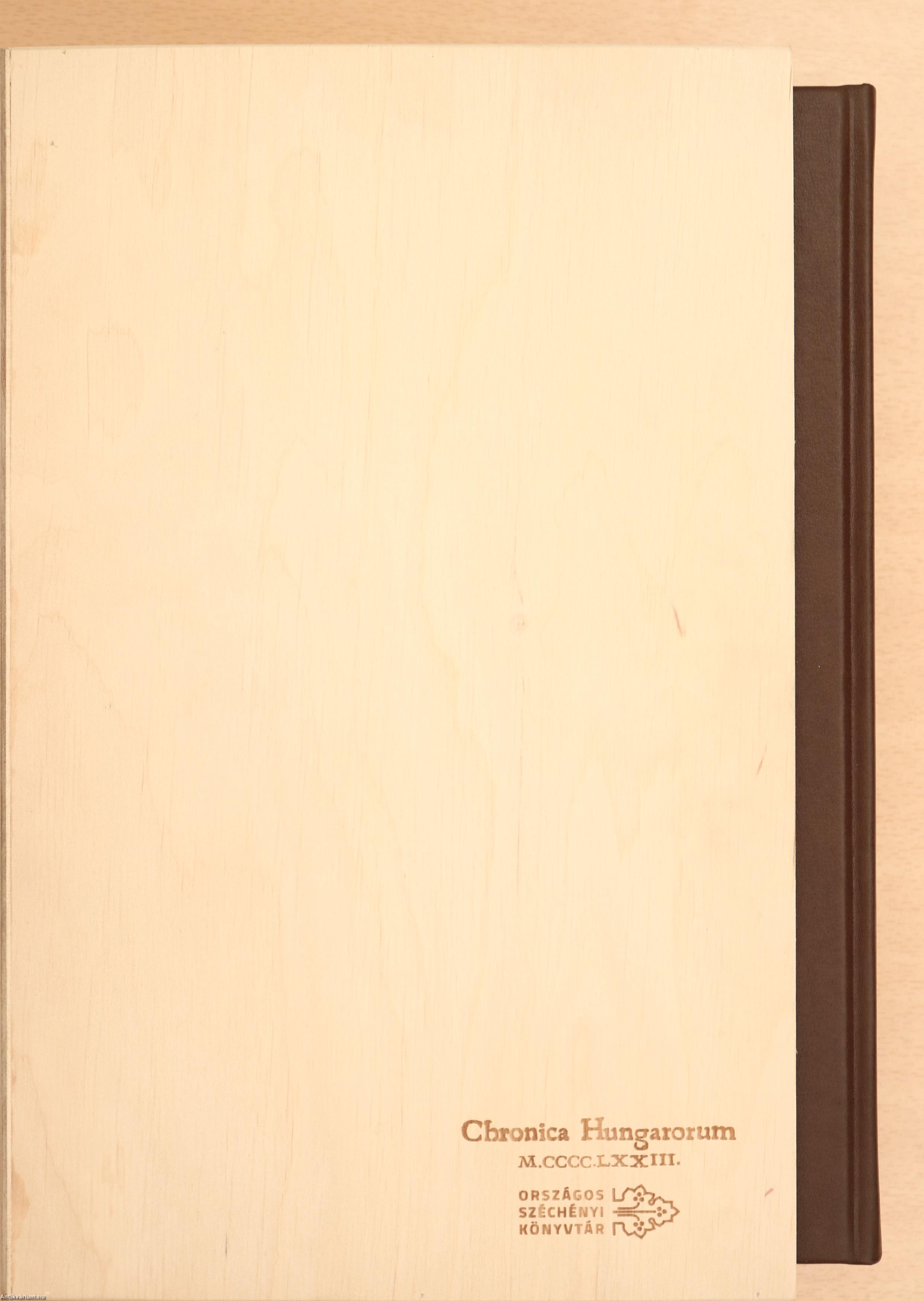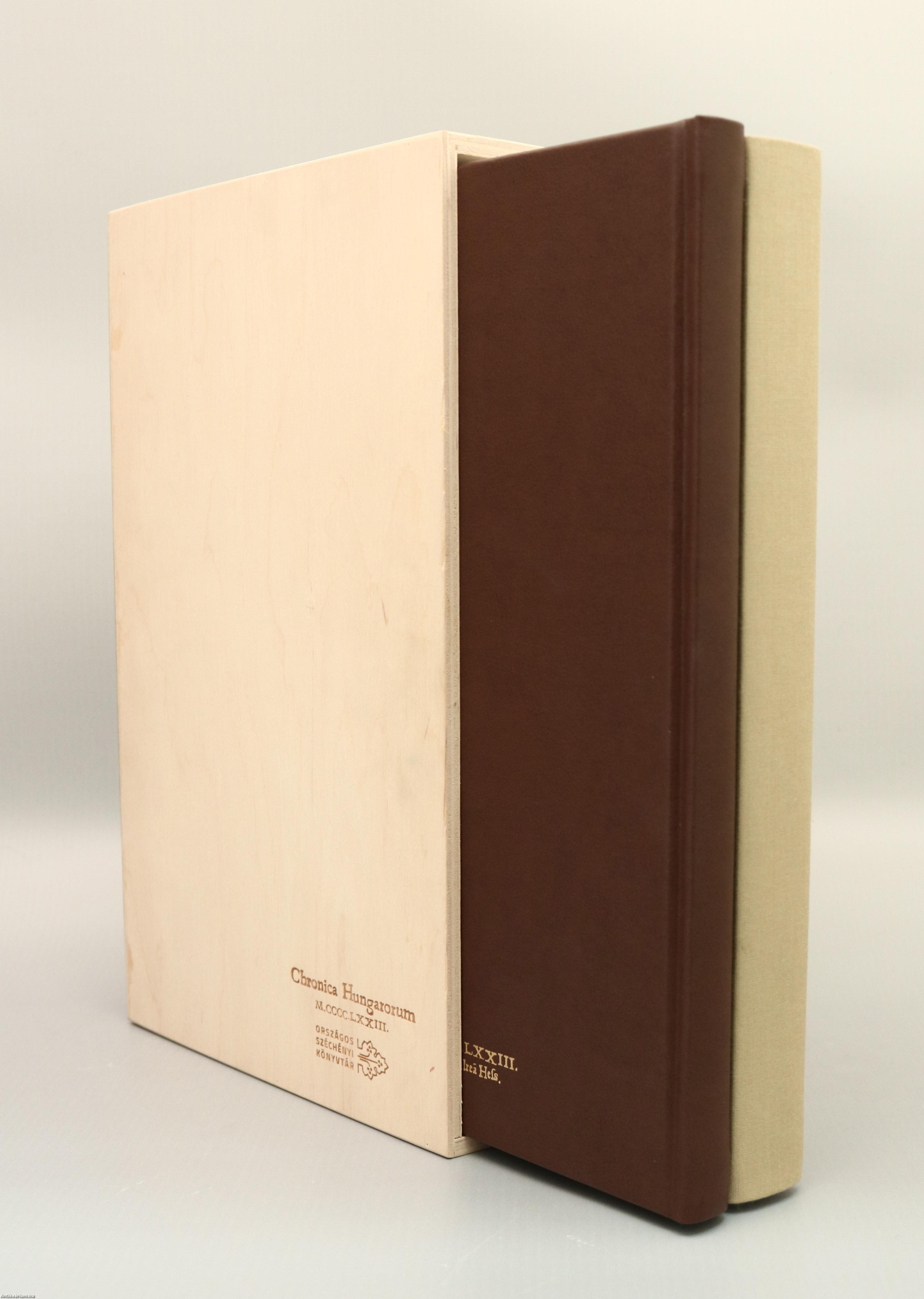 Szép, tiszta és olvasatlan, gyűjtői állapotú bibliofil példányok kiadói fa védődobozban. Sorszámozott. Ez a 366. számú példány. A kötetek az Országos Széchényi Könyvtárban őrzött Chronica Hungarorum (Inc. 328) fakszimile kiadása és annak kísérőkötete. Készült 550 példányban - ebből 200 példány díszkötésben.